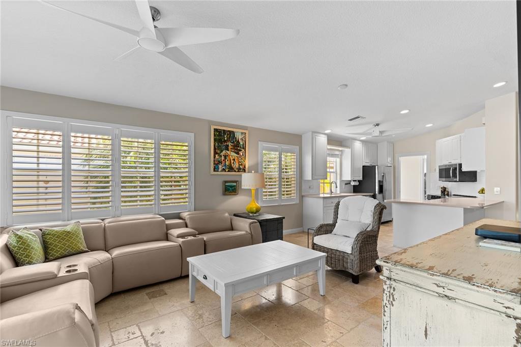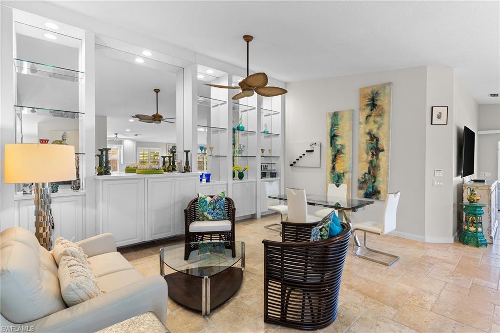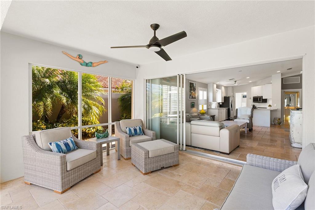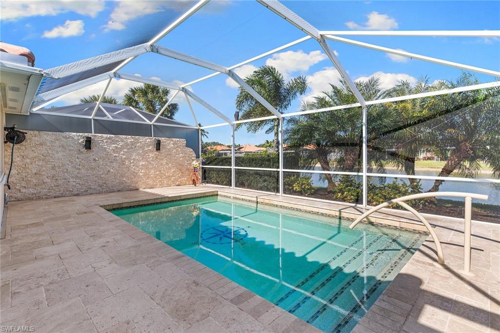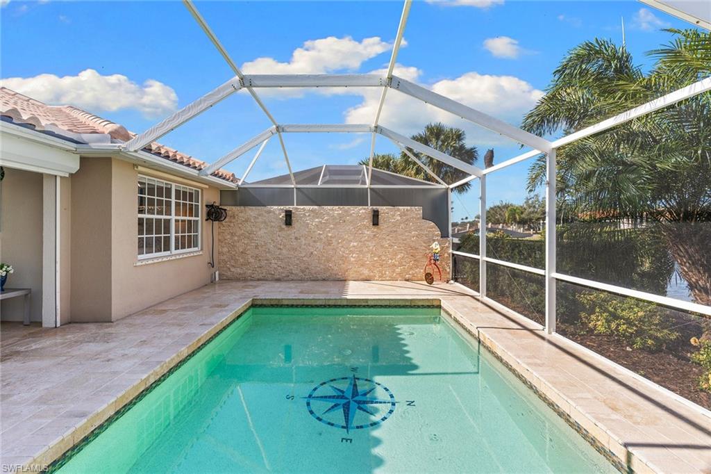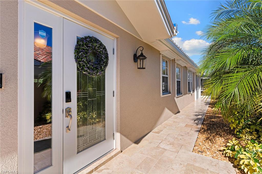 Paradise awaits in this beautifully updated Capri model in the sought after Village Walk community. Meticulously maintained, the home offers a bright and cheerful ambiance with fresh interior paint, new ceiling fans and custom window treatments. Saturnia travertine flooring flows throughout the residence and extends seamlessly to the lanai, pool patio and walkway, creating an elegant and cohesive indoor-outdoor living space that is easy to maintain. Enjoy tranquil water views framed by lush palm trees from the custom heated saltwater pool, enhanced by a new pool heater, pump and Jandy system. For added peace of mind, the home features a new upgraded roof with a transferable warranty, all new gutters, a hurricane impact glass entry door, electric shutters for the lanai and a newer air-conditioning system. Offered furnished and move-in ready, this exceptional home is ready for immediate enjoyment. Call today to schedule your private showing.