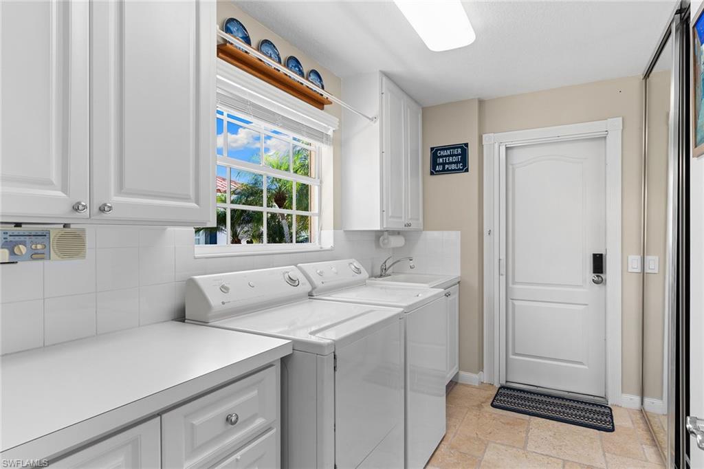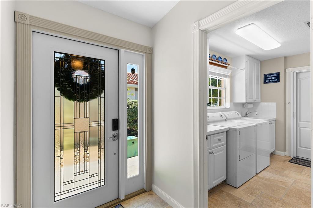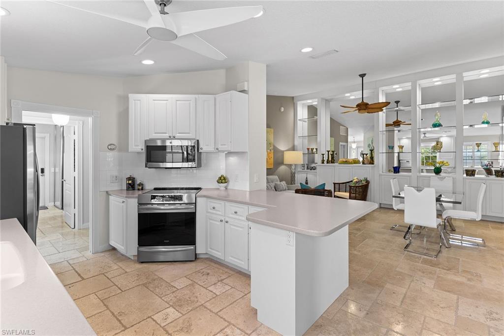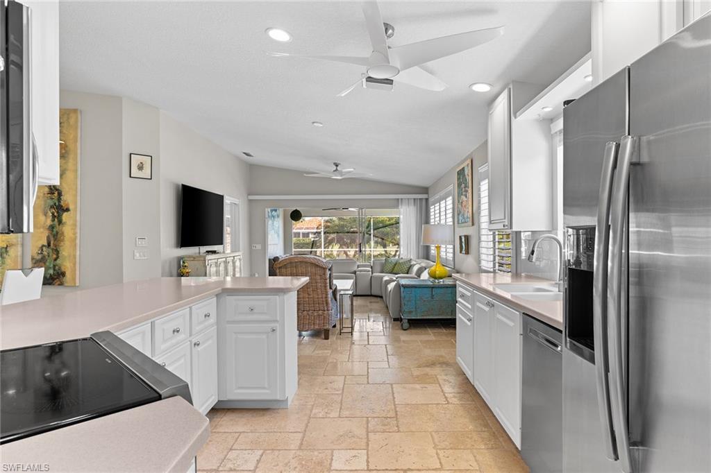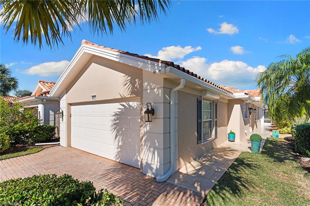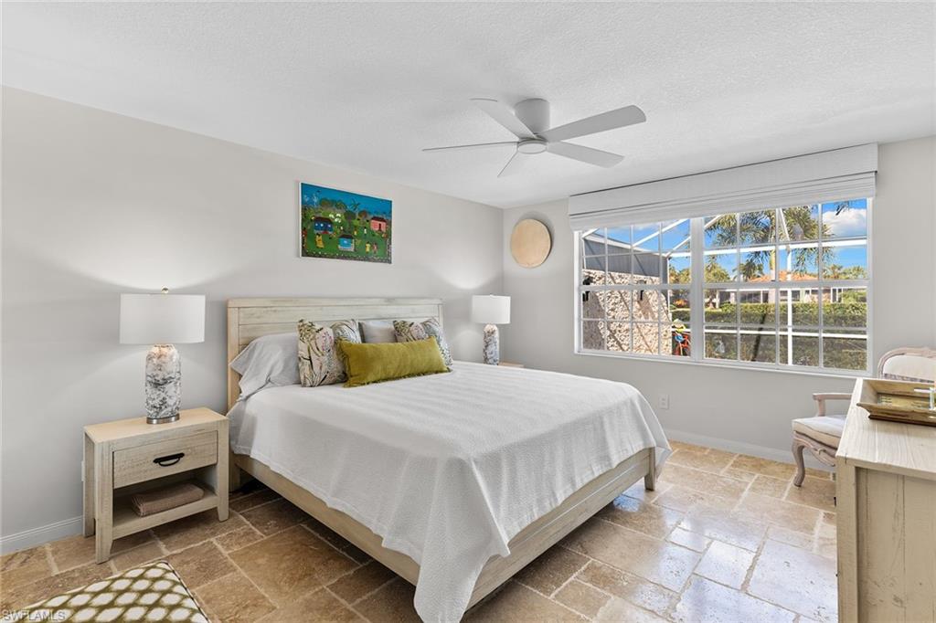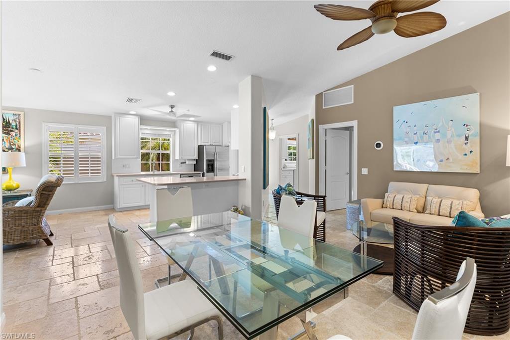 Paradise awaits in this beautifully updated Capri model in the sought after Village Walk community. Meticulously maintained, the home offers a bright and cheerful ambiance with fresh interior paint, new ceiling fans and custom window treatments. Saturnia travertine flooring flows throughout the residence and extends seamlessly to the lanai, pool patio and walkway, creating an elegant and cohesive indoor-outdoor living space that is easy to maintain. Enjoy tranquil water views framed by lush palm trees from the custom heated saltwater pool, enhanced by a new pool heater, pump and Jandy system. For added peace of mind, the home features a new upgraded roof with a transferable warranty, all new gutters, a hurricane impact glass entry door, electric shutters for the lanai and a newer air-conditioning system. Offered furnished and move-in ready, this exceptional home is ready for immediate enjoyment. Call today to schedule your private showing.
