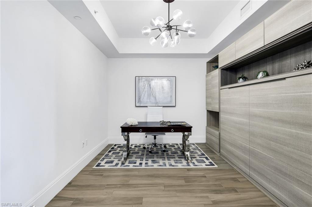 Welcome to this beautifully maintained, turnkey-furnished condominium in the heart of the Naples Design District. Western exposure bathes the home in warm afternoon light, while lush palm trees surrounding the lanai create a private, tropical oasis. Inside, the spacious great room provides the perfect place to relax on the sofa or enjoy delicious meals with family & friends. A custom den is accessed through striking metal and frosted glass doors, offering an elegant space for a home office or relaxation. A thoughtfully designed California Closets built-in wall features a queen-size Murphy bed and integrated dresser, allowing the den to easily convert into an additional guest bedroom. The bathrooms have been tastefully upgraded with custom tile finishes and glass door enclosures, enhancing both style and functionality. Naples Square residents enjoy an exceptional array of amenities, including a resort-style pool and spa, a fully equipped fitness room, and secured underground parking for two vehicles. Ideally located and surrounded by Naples’ finest restaurants, shops, parks, and cultural attractions, this residence offers a vibrant lifestyle with unparalleled convenience. This exquisite condo presents a rare opportunity to enjoy upscale living in one of Naples’ most desirable neighborhoods.