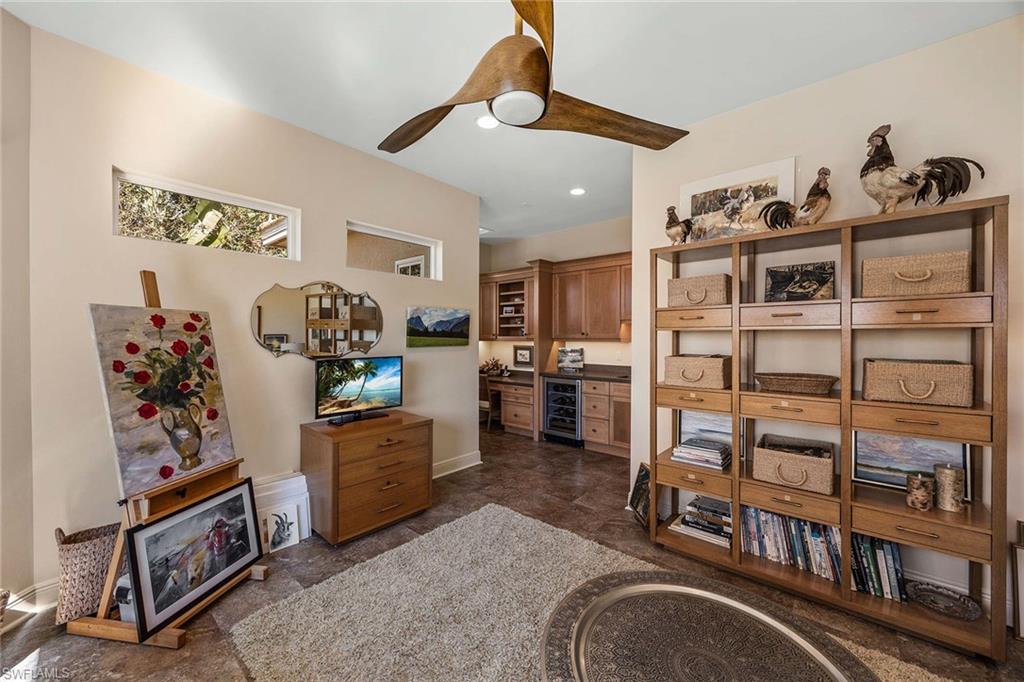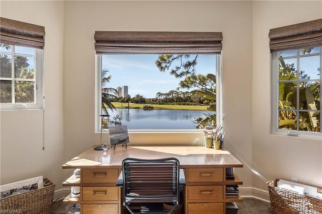 Welcome to 4441 Blue Sage Court in Pelican Landing, an incredible Old Florida-style residence offering timeless charm, thoughtful updates, and a breathtaking setting. This 4,031-square-foot single-family home features three bedrooms, 3.5 baths, a den/office, and an oversized 2.5-car garage, all positioned on a lushly landscaped .68-acre corner lot with sweeping views of the lake and golf course. Go onto the spacious front porch and into an inviting formal living and dining area, designed for entertaining. French doors lead seamlessly to the expansive pool and outdoor living space, blending indoor and outdoor enjoyment. The updated kitchen opens to a warm and welcoming family room with an eating area, creating a comfortable setting for everyday living, gathering and relaxed conversation. A private first-floor home office/den features beautiful arched windows that fill the space with natural light. A standout feature is the 2014 second-floor addition, designed for style and versatility. This space includes a bath, a bar area with wine refrigerator, a built-in desk and a flexible bonus area, ideal for an additional office den, or even guest space. Go outside to your private retreat where the spacious pool area captures stunning panoramic views of the sparkling lake, manicured golf course and tropical surroundings, a Florida paradise. As a resident of Pelican Landing, you’ll enjoy an unmatched lifestyle with resort-style amenities including a private island beach pavilion, sailing, a kayak park, tennis, pickleball, bocce and an attended fitness center, with optional golf membership available for those who want the full country club experience. Classic charm, modern functionality and an unforgettable view, this is Pelican Landing living at its finest.