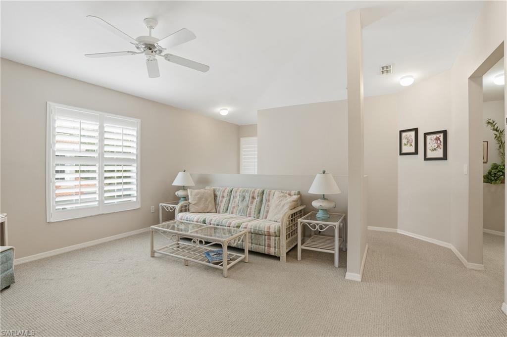 Welcome to this beautifully maintained 2-bedroom+den, 2-bath second-floor end-unit condo in the highly sought-after gated community of Pipers Grove in North Naples. Enjoy peaceful, panoramic lake and fountain views from nearly every angle of the home with the BEST EXPOSURE possible- southern. This light-filled residence offers an open, airy layout designed for both everyday comfort and effortless entertaining — complete with an attached garage and a charming private entry courtyard where grilling is allowed. Step inside to a spacious living and dining area with well-kept carpet and tile flooring, flowing seamlessly into the kitchen featuring bar-top seating, generous counter space, and ample cabinetry. The desirable split-bedroom floor plan provides ideal privacy for guests, in addition to space for a home office/den or third bedroom. Relax and unwind on your expansive screened lanai, where gentle Florida breezes and tranquil water views create the perfect backdrop for morning coffee or sunset evenings. Additional highlights include: Attached one car garage, updated roof, original owners and lightly lived in. Pipers Grove offers a true resort-style lifestyle with lush landscaping and outstanding amenities, including: Renovated clubhouse with kitchen, community pool + lap pool & spa, Tennis & bocce courts, fitness center, over 2 miles of scenic walking paths, gated entry with onsite management. Location is everything — and this one delivers. You’re just a short walk to Publix, shops, restaurants, and banks, and minutes from Naples’ beautiful beaches, dining, and entertainment. Whether you’re looking for a full-time residence, seasonal retreat, or investment opportunity, this home offers the perfect blend of comfort, convenience, and Florida charm. Come experience your own piece of paradise today