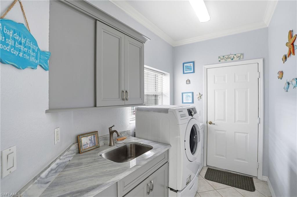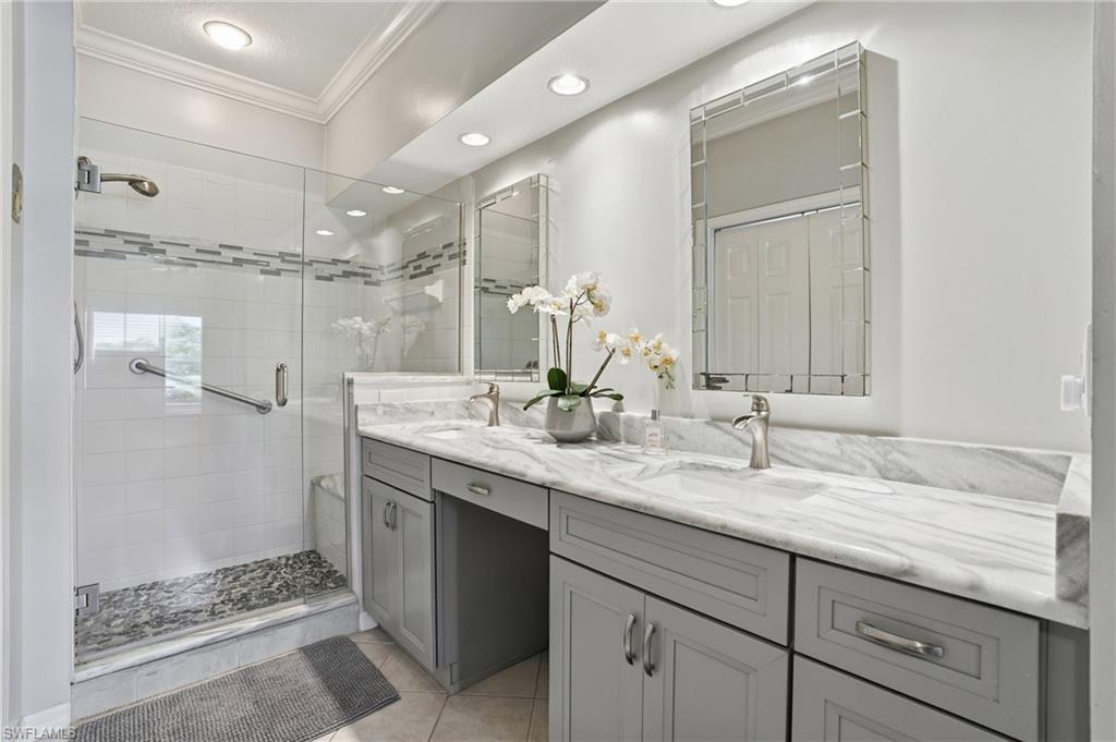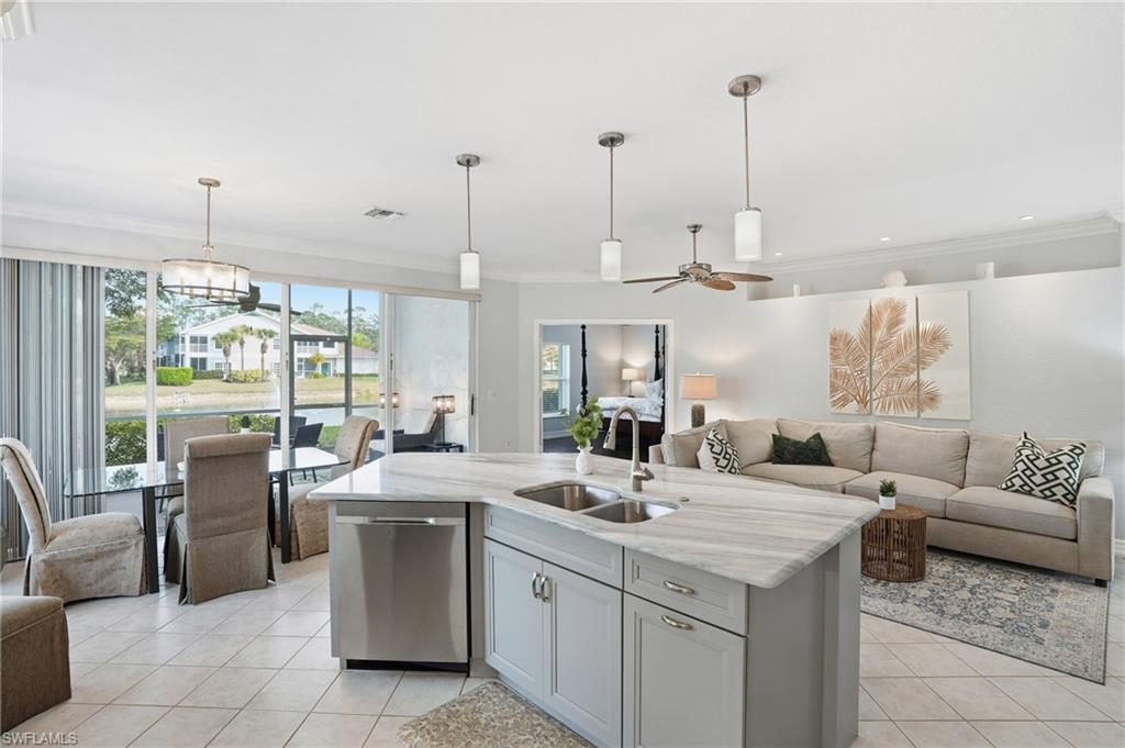 BEAUTIFULLY UPDATED first-floor end-unit condo in the highly sought-after Spoonbill Cove at Carlton Lakes, offering exceptional privacy with no residence on one side and no neighbors behind. This 2-bedroom plus den, 2-bath home enjoys serene lake and fountain views and is offered turnkey furnished, including tasteful Tommy Bahama furnishings in the primary suite. The open-concept living space is ideal for both everyday living and entertaining and showcases a thoughtfully UPDATED KITCHEN featuring NEW CABINETRY, GRANITE COUNTERTOPS, and a stylish bar area with wine refrigerator. A cohesive and tasteful gray and white color palette flows throughout the home, creating a light, clean, and timeless aesthetic. The primary bathroom has been beautifully upgraded with new cabinetry, granite countertops, and updated tile, offering a SPA-LIKE RETREAT. The primary suite is privately situated with peaceful water views, while the guest bedroom and bath are nicely separated for comfort and privacy. A large, versatile den provides the perfect space for a home office, media room, fitness room, or guest retreat. Ground-floor living allows for easy access and seamless indoor-outdoor enjoyment, surrounded by lush landscaping. Additional highlights include a NEW ROOF (2024) and move-in-ready condition. Carlton Lakes is a gated community featuring a renovated clubhouse, fitness center, lap pool and spa, tennis courts, bocce, fishing pier, scenic walking and biking paths, and an active social calendar. Conveniently located just steps to SEED TO TABLE, a Naples favorite offering grocery, dining, live music, and events, with close proximity to shopping, dining, beaches, I-75, and the airport. Ideal for full-time or seasonal living.