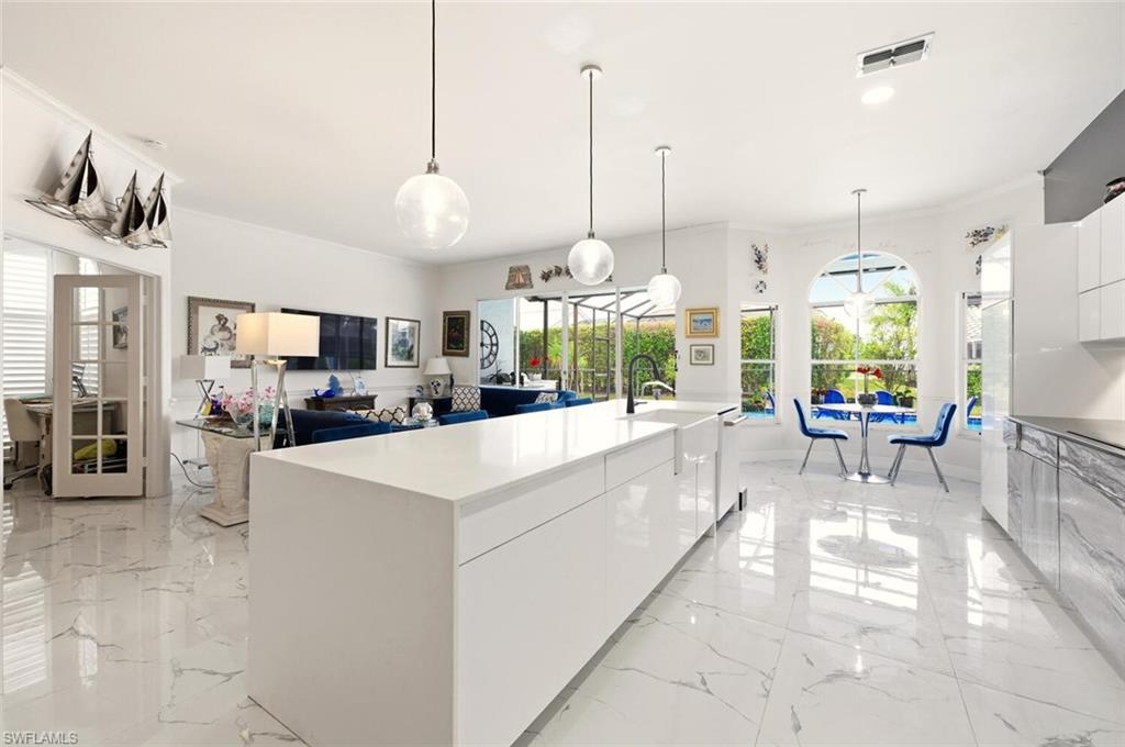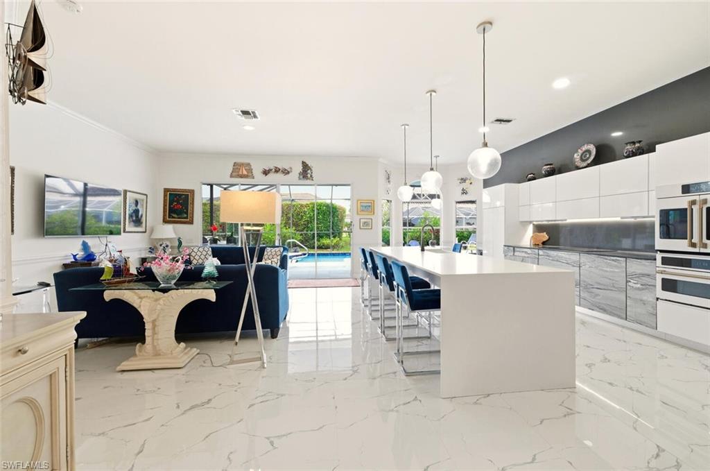 This two bedroom plus den home has been recently renovated, embracing a fully open living concept. The den features a built-in queen sized Murphy bed with oversized mattress where the only problem is that it is so comfortable, your guests will never want to leave. Large white and gray scratch-free designer porcelain tiles have been laid throughout the house, extending onto the front and the back pool lanai, providing a bright and airy feeling with very little maintenance. The front entryway is fully enclosed, providing a wonderful area to just sit and watch the world go by with a glass of wine at the end of a round of golf. The back lanai features a built in outdoor kitchen, electric grill and marble countertops. The oversized electric heated pool has been newly resurfaced and updated with white and blue French tiles, all surrounded with outdoor non-slip tiles complementing the similar tiles inside. What sets this house apart from all the others at Countryside is the kitchen. It is the heart of this home. It features a "state of the art" design with quartz countertops and white European style cabinets. This gives the space a "Wow!" modern Florida Resort appearance as soon as anyone enters the front door. The roomy gourmet kitchen will satisfy the needs of any award winning chef and will be where everyone hangs out. The layout makes it easy to entertain and to have friends and family come together to make lasting memories. The oversized waterfall island, along with a farmhouse country sink and an induction stove top before a charcoal gray quartz backsplash encompasses the entire back wall. The kitchen is equipped with over $20,000 of "Smart" high end appliances only two years old. While all paintings and wall hangings, and some marked antique pieces and personal items will be retained by the Seller, the remaining furnishings are beautifully matched and provide a move in ready home for the discriminating buyer. Productive Meyers Lemon and Key Lime trees further enhance both the eye appeal and the practical addition of twice a year edible crops to enhance your dining pleasure. On top of all this is the beauty and wonderful amenities of Countryside Golf and Country Club with its spectacularly modernized clubhouse and gourmet restaurant, 18 hole golf course with fully furnished and friendly staffed pro shop and course attendants, attended fitness center, tennis and pickleboard and bocci courts, and a membership considered the friendliest in all of Naples. And we're not stopping here. Added to all of this is the close proximity of downtown Naples with its fine shopping and restaurants and of course, the beautiful waters of the gulf waters just minutes away. You can't beat Countryside for a fine country club at reasonable cost for resort living and you can't beat this offered home for your own piece of the total Naples experience.