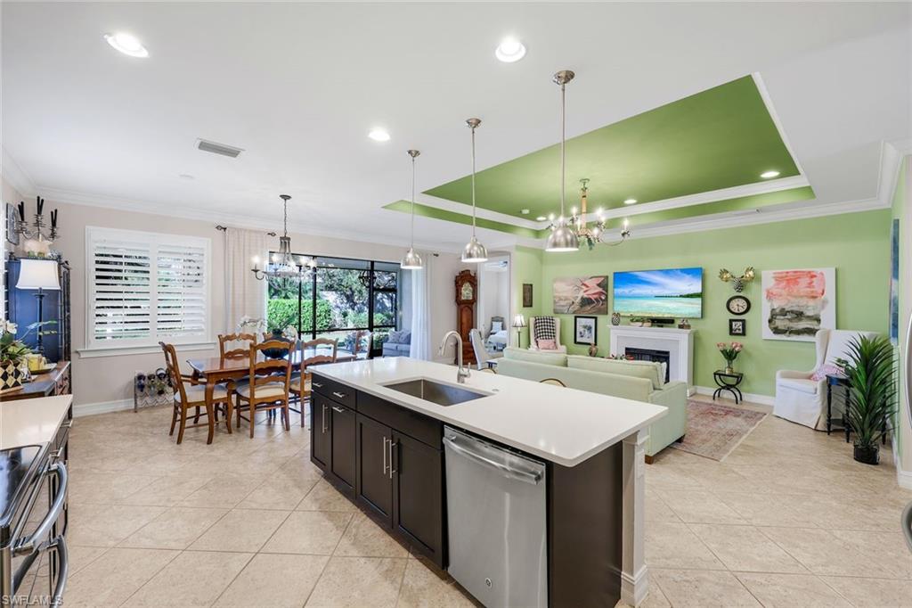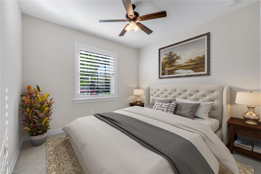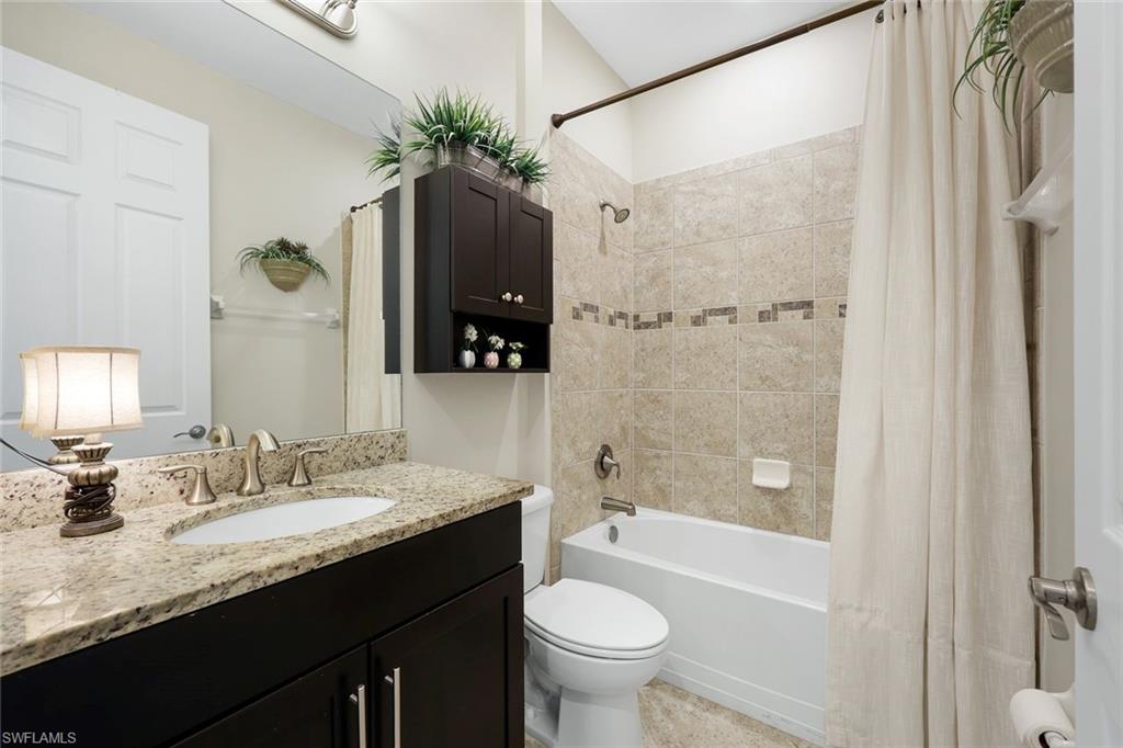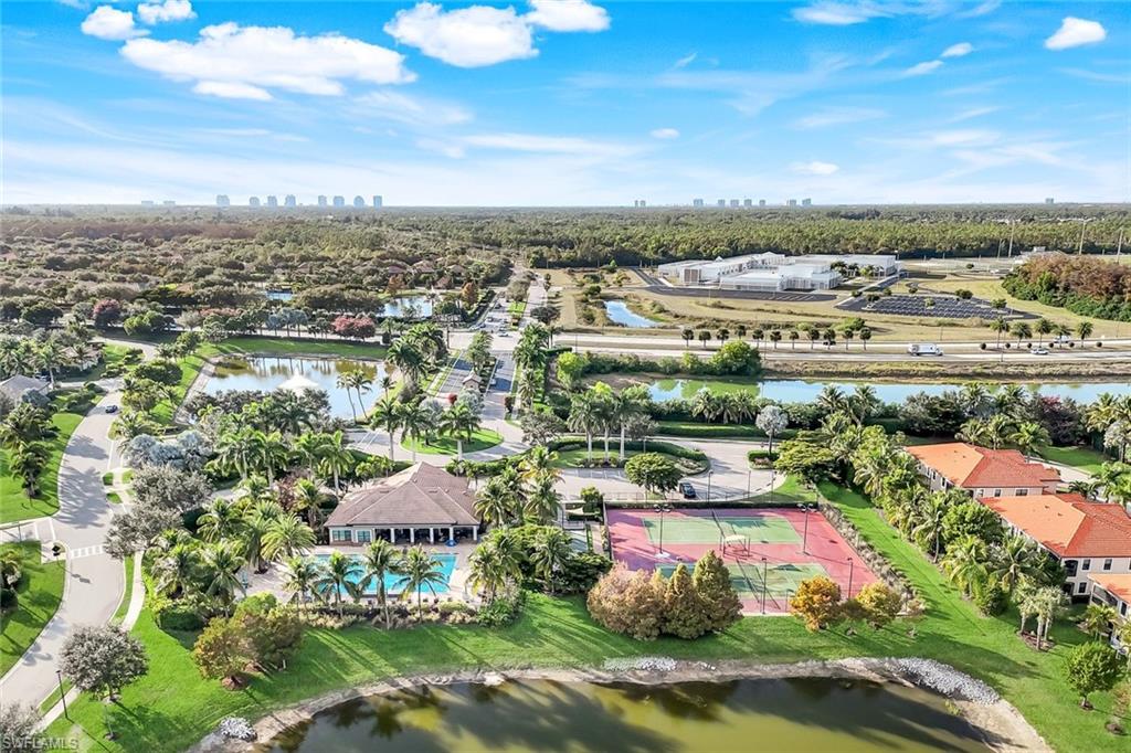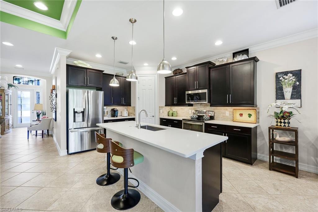 Welcome to this inviting single-story home with a gorgeous lake view, ideally situated on a quiet interior corner lot in the sought-after gated community of Paloma. This customized Edison floor plan offers 1,983 sq ft of thoughtfully designed living space with 3 bedrooms plus a den with its own closet, and 3 full baths. The open-concept layout flows seamlessly from the grand entry into the living room and kitchen, with bedrooms smartly positioned for privacy. The kitchen features timeless espresso all-wood shaker cabinets, quartz countertops, a farmhouse stainless steel sink with new disposal, and stainless steel appliances, blending style with everyday functionality. The spacious primary suite offers two walk-in closets, while the primary bath includes dual sinks, a modern glass-enclosed shower, and a convenient custom-converted laundry area. The former laundry room has been transformed into a stunning tropical third full bath adjacent to the den, ideal for guests, a home office, or flexible living arrangements. The oversized marble-floored lanai serves as a relaxing outdoor extension of the home, complete with designer lighting and ceiling fan, all overlooking a tranquil lake and lighted fountain—perfect for morning coffee, entertaining, or evening unwinding. Additional highlights include electric hurricane shutters on the lanai and accordion storm shutters everywhere else, new A/C and 50-gallon hot water heater (2024), freshly power-washed and sealed driveway, and a recent full exterior repaint. The 2-car garage offers a rare 4-ft depth extension, attic and cabinet storage, plus a widened paver driveway for additional guest parking—an uncommon feature in gated communities. The home enjoys added privacy with HOA-maintained green space along the south side and a quieter interior location that lives more peacefully than many other Paloma homes. Residents enjoy a true resort-style lifestyle with mature landscaping, lap pool, fitness center, tennis courts, and a recently remodeled clubhouse, along with an active social committee and full calendar of events. Centrally located just minutes from RSW International Airport, Mercato, Coconut Point Mall, Gulf Coast Town Center, and Miromar Outlets. Pristine, recently re-nourished Gulf beaches, award-winning healthcare facilities, and Lee Health’s 24/7 Emergency Medicine center are all nearby. Downtown Bonita Springs has been revitalized into a walkable destination featuring dining, cafes, Riverside Park, live music, community events, historic landmarks, and access to the Bonita Estero Rail Trail. Nearby attractions also include The Wonder Gardens botanical and wildlife sanctuary. Whether seeking a full-time residence, seasonal retreat, or investment opportunity, this home offers an exceptional blend of comfort, location, privacy, and lifestyle. Paloma is a resident-managed community with a FEMA LOMR exemption—flood insurance not required. See Features & Upgrades flyer for full list of upgrades.