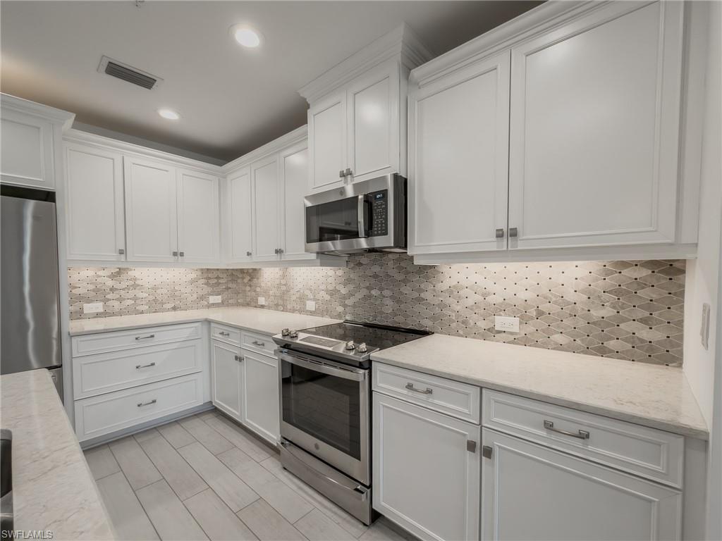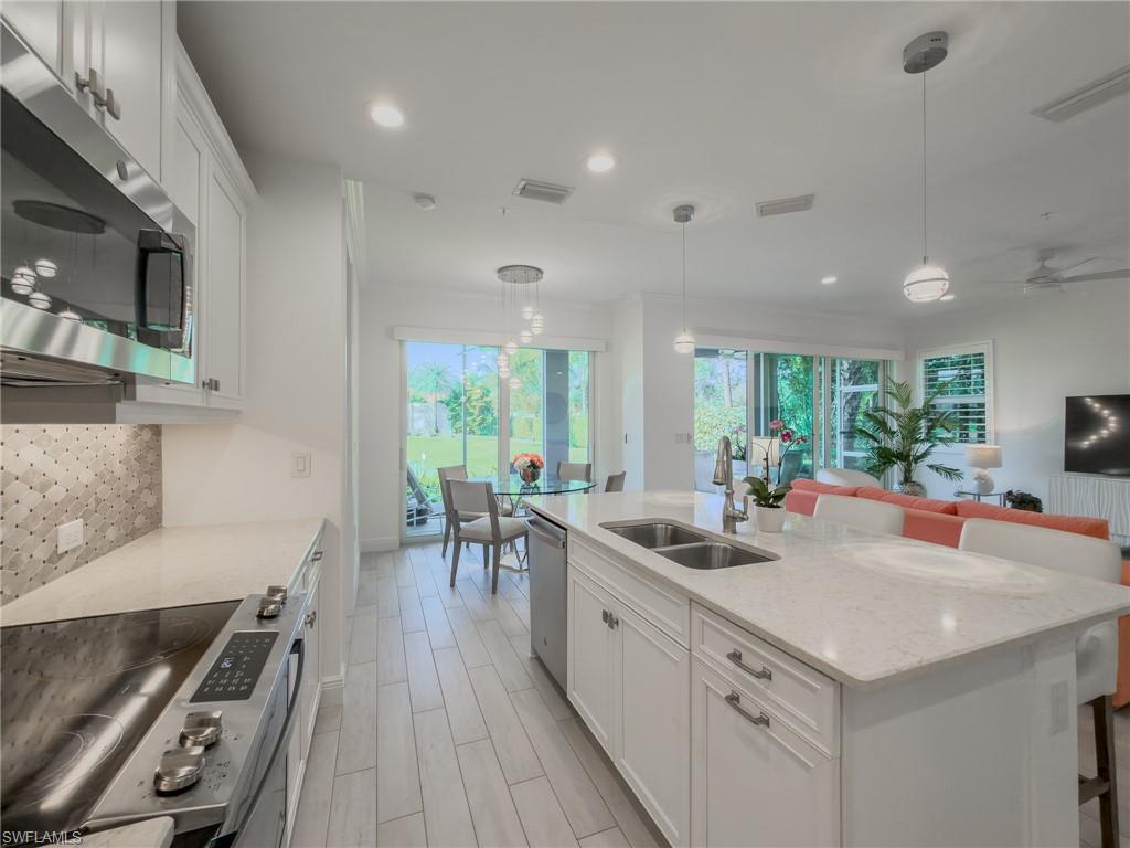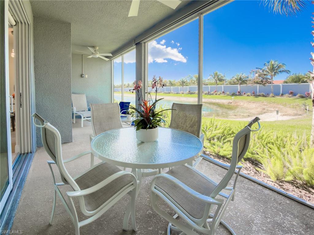 Perfect Naples Condo! Light bright, like new end unit. Sunset views and backs to pond. Electric shades, plantation shutters, beautiful kitchen and baths. Big primary closet, large lanai with large double sliders to enjoy our coastal breeze. Minutes to downtown Naples and beaches. You can’t buy a new condo in this price point close to downtown naples. Perfect first floor surrounded by lush landscaping. Community has a great pool, fitness room and club house.