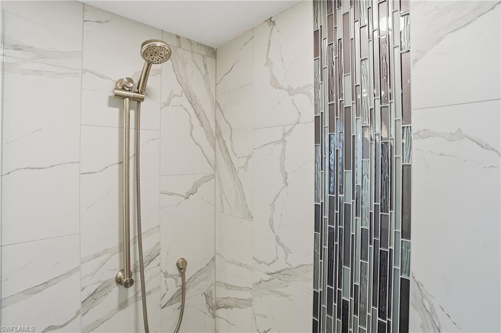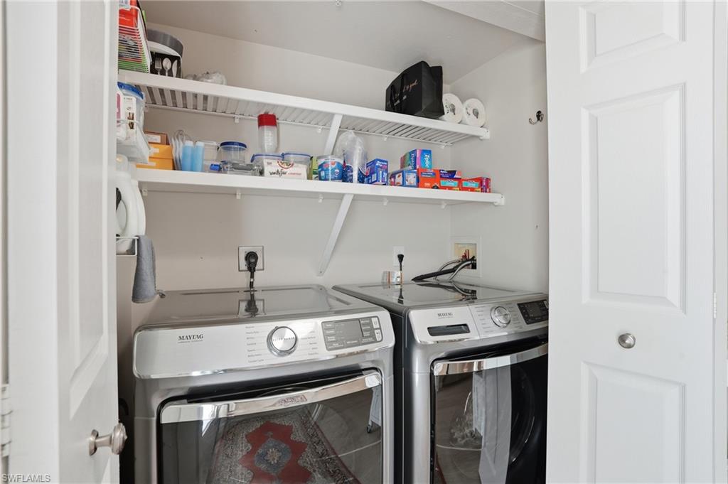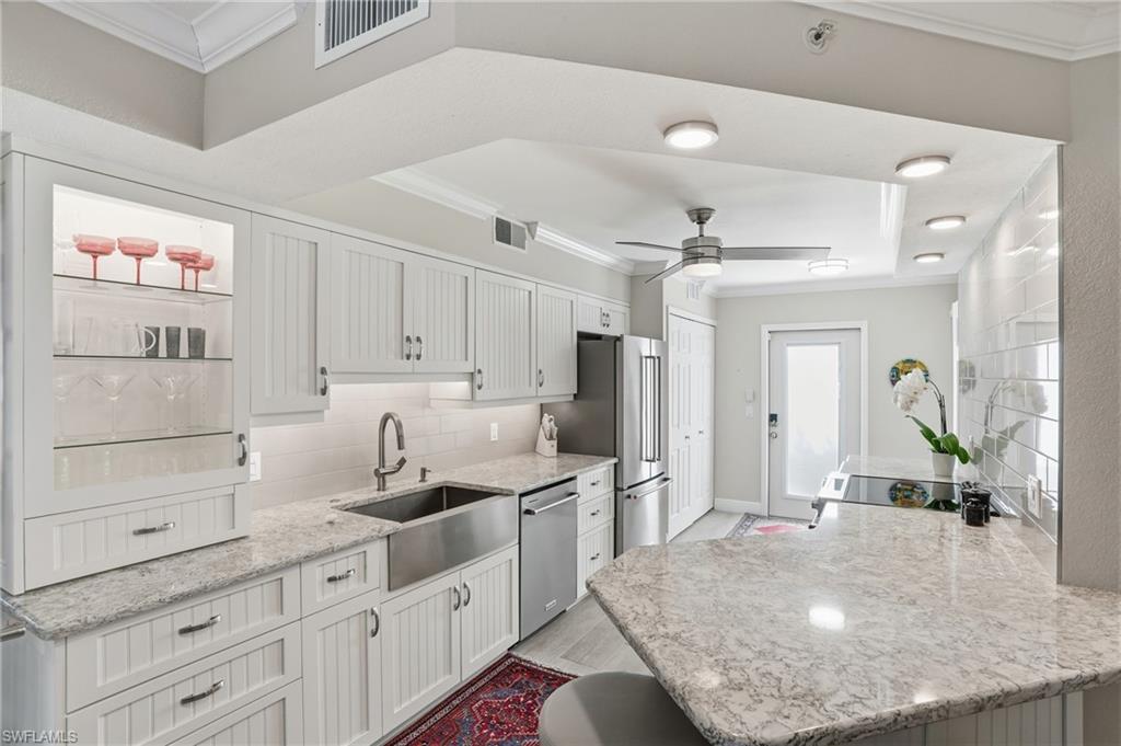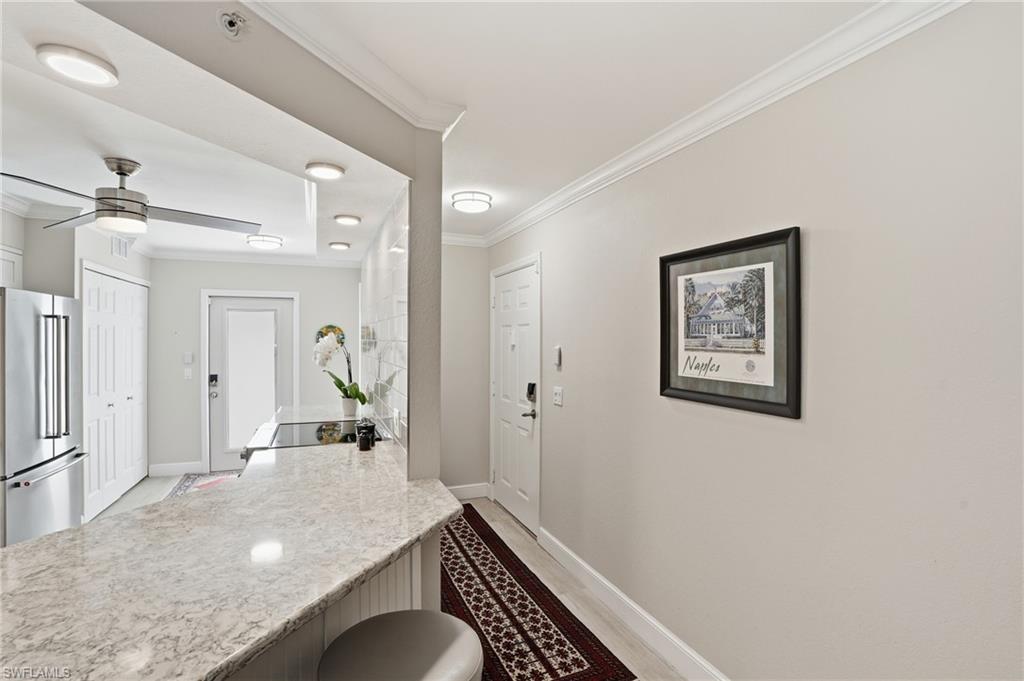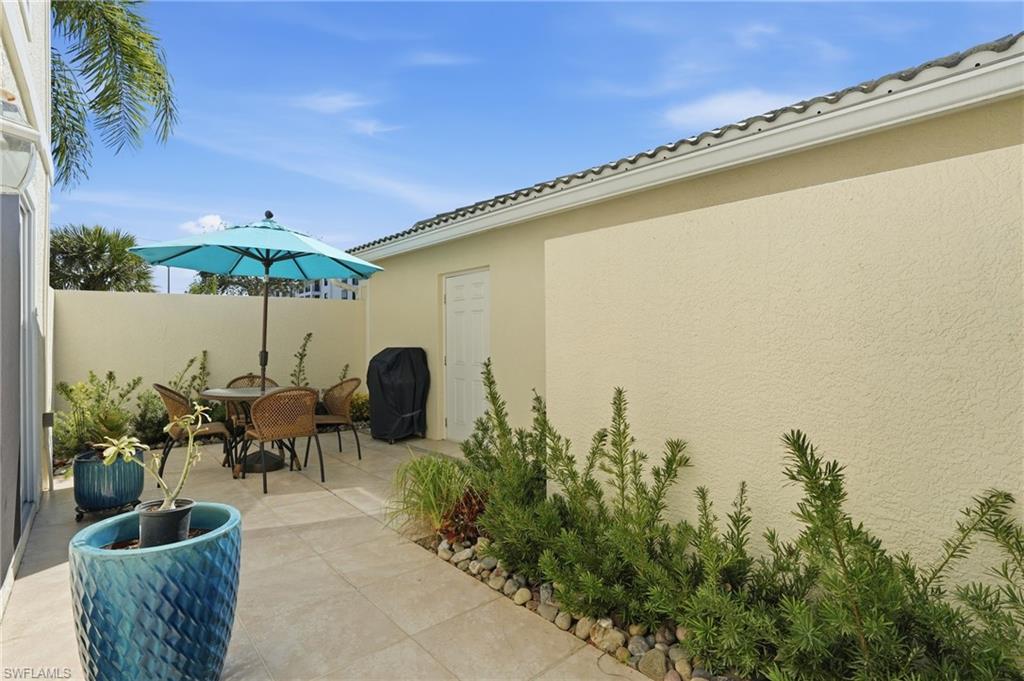 Let's compare "APPLES TO APPLES": there are other listings available, BUT...This is THE FIRST FLOOR, CORNER UNIT WITH A PRIVATE COURTYARD, private entrance thru one-car GARAGE, ALL HURRICANE WINDOWS AND SLIDERS ($80K improvement), HURRICANE fabric lanai shades. Private grilling area and community pool just steps outside your door. LOWest CONDO fees you can find in the area ($1,248/quarter), walking distance to Seed-to-Table and Walmart, North Collier Regional Aquatic Park, 10 mins drive to Delnor-Wiggins Beach and easy access to I-75. Community replaced all roofs just 2 years ago. NOW let's go inside! KITCHEN & BOTH BATHROOMS are renovated. Custom made matching kitchen and bathrooms cabinets made by Cornestone Kitchens ($100K+ improvement), completed by farmhouse deep stainless steel sink and matching quartz countertops. Custom made kitchen island on the wheels! NO tubs, both bathrooms have matching walk in showers with glass enclosures. ALL TILE flooring, including the lanai area. ALL newer KitchenAid appliances and high capacity Maytag washer & dryer. A/C is only 4 years old/regularly serviced. PLANTATION SHUTTERS on ALL windows and Douglas sun shades on sliding doors. Custom made wooden shelving in ALL closets, including pantry and laundry closet. ALL new lighting fixtures, recess lighting and ceiling fans. Wait, there is MORE to impress! The condo offered turn-key furnished with high quality custom made Copeland furniture, shipped from Vermont; the high quality rugs enhance the condo decor. This is not a just 2 bed/2 bath condo, it's a HOME you will be proud to show to your friends and relatives. Come check it out! Vacant and easy to show. Make sure to 'walk" the 3D tour attached.