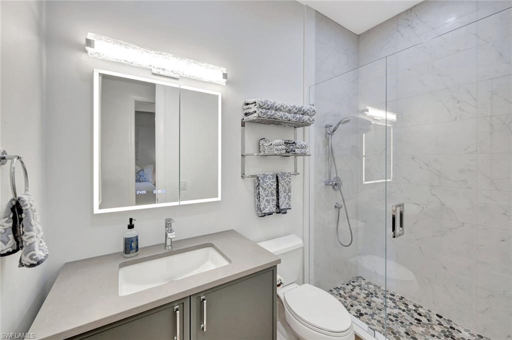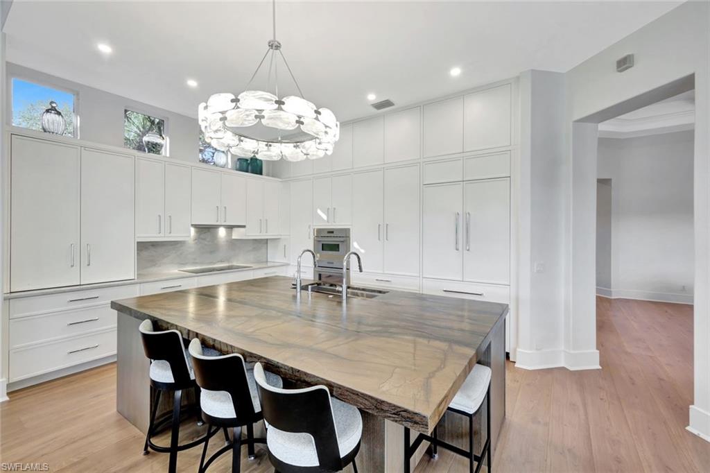 Welcome to completely REIMAGINED residence fully renovated in 2024, ideally located in the heart of Pelican Landing. Offering southern exposure, lake views, and indoor-outdoor living, this home is designed for lock-and-go ease. Upon entry, expansive sliding glass doors span the entire back of the residence, inviting natural light and showcasing your beautiful lake views. The open-concept kitchen and great room were planned so the view stays with you—whether cooking, dining, relaxing, or hosting. The chef’s kitchen is the centerpiece, anchored by a substantial center island with storage beneath. Custom Willow House cabinetry extends to the ceiling and includes a built-in coffee bar, rollout drawers, and a spacious pantry. Premium appliances include a Thermador built-in refrigerator, induction cooktop, and double ovens. Taj Mahal granite with a leathered finish completes the counters. In the great room, a linear electric fireplace pairs with custom wood-grain cabinetry and illuminated glass shelving, creating a focal wall. The bar area features quartz countertops, an ice maker, wine refrigerator, and beverage refrigerator. Automatic electric shades enhance both the great room and dining area. The primary suite bath is a spa-inspired retreat with oversized porcelain tile, a fully tiled walk-in shower to the ceiling with rain head and custom fixtures, a frosted-glass panel, and a freestanding soaking tub. Two separate vanities offer rollouts, Taj Mahal countertops, lighted mirrors, and signature hardware. A renovated coastal pool bath features tile to the ceiling, floating vanity, soft lighting, and a lighted mirror. The guest bath includes an oversized shower and floating vanity, while the powder room offers a polished nickel console sink, mosaic marble floor, and lighted mirror. The laundry room includes a separate entry, quartz countertops, sink and cabinets. Step outside to your private resort oasis.The pool was refinished in 2025 with a sun shelf, ceramic glass tile, and a Pebble finish, surrounded by a marble-tiled pool deck. Lanai screening opens views, and the covered outdoor living and dining area features a summer kitchen with built-in Blaze gas grill, two gas side burners ,and generous counter space-perfect for year-round entertaining and enjoying abundant bird and sanctuary life. Additional highlights include a 24kW whole-house Generac generator served by a 1,000-gallon propane tank, whole-house water filtration, new gutters (2023), and a new tile roof (2023). All electrical and plumbing were replaced during the renovation. Enjoy smart-home lighting, thermostat control, a central alarm system, outdoor up-lighting, electric hurricane protection on the sliding doors and heated and air conditioned garage. Circular drive, side drive, and a three-car garage complete this exceptional offering. Just a short walk or bike ride to the community center, tennis, plus Pelican Landing’s beach shuttle and 2 world class golf courses.
