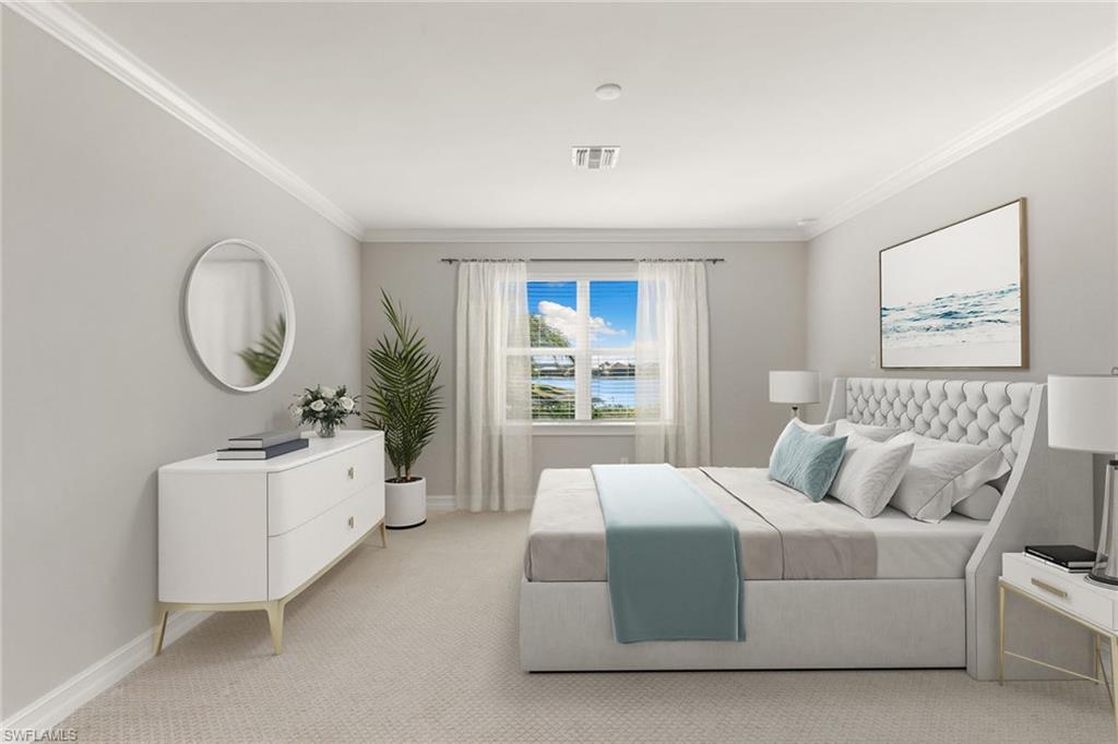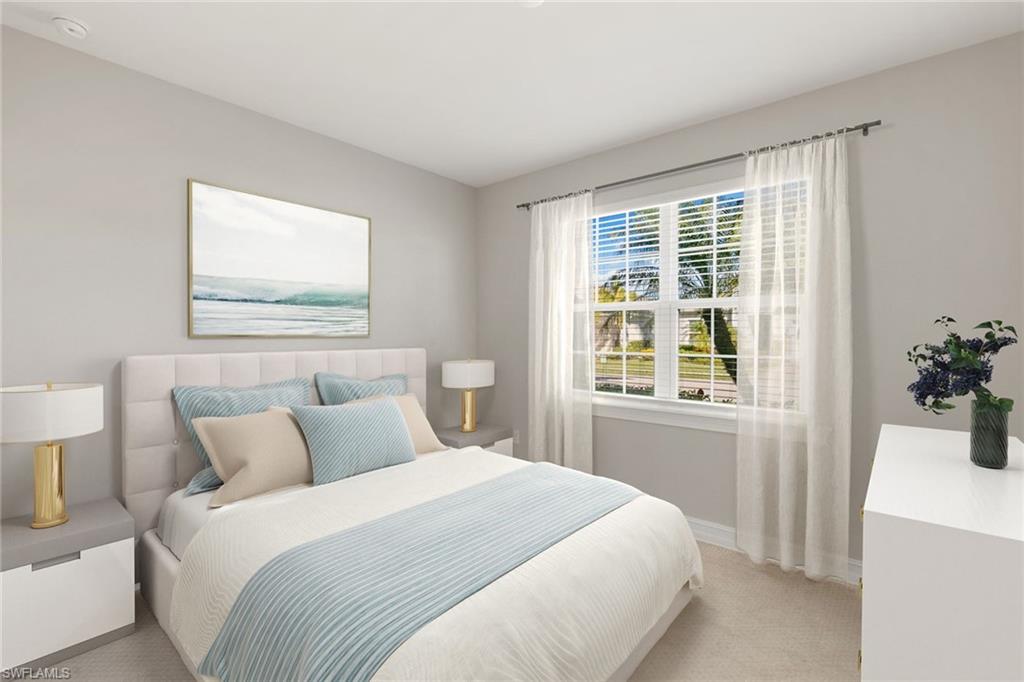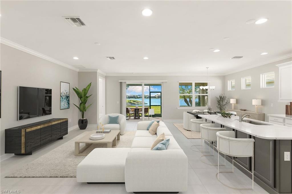 Spectacular, long lake views set a stunning backdrop for this beautifully appointed residence in the highly sought-after Naples Reserve, perfectly positioned with coveted southern exposure for sun-filled days and breathtaking sunsets. Built in 2020 and lightly lived in, this Delray model offers four spacious bedrooms and two full baths within a thoughtfully designed great-room floor plan ideal for refined entertaining and everyday comfort. The bright, white chef’s kitchen features quartz countertops, stainless steel appliances, and an elegant tile backsplash, seamlessly opening to the main living areas. The serene primary suite captures sweeping water views and includes a spacious primary bathroom with a generous walk-in shower, dual vanities with ample counter space, and two walk-in closets. Additional highlights include impact-resistant windows, a pristine two-car garage, and a covered lanai overlooking the expansive lake. Private boat docks are available, enhancing the community’s exceptional waterfront lifestyle. Naples Reserve is one of Naples’ premier newer communities, offering an unmatched resort experience with a waterfront restaurant and tiki bar, pickleball and tennis courts, kayaking and rowing, marina access, a spectacular resort-style pool, an impressive clubhouse, and a state-of-the-art fitness center—all designed for an active, social, and luxurious coastal lifestyle. Furnishings are virtually rendered in photography.