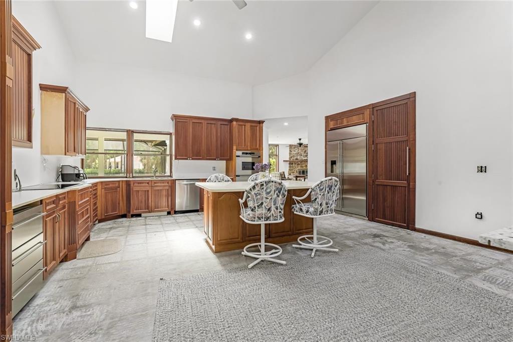 Welcome to a truly rare opportunity in the highly sought-after Oakes Estates, an area experiencing strong high-end growth and redevelopment. Situated on an expansive 2.5-acre parcel, this unique estate offers two single-family pool homes with no HOA fees and access to top-rated school districts—a combination that is increasingly hard to find. The main residence offers a flexible layout and serves as a true blank canvas, providing an exceptional opportunity to personalize and transform the space into your ultimate dream home. Architectural highlights include soaring ceilings exceeding 20 feet in select areas, a working fireplace, custom wood cabinetry, wood-cased windows, and quality Decora and KitchenAid appliances. Southern exposure fills the home with natural light, while the oversized garage, expansive lanai, pool, and dedicated pool bath make entertaining effortless. The second residence, offering over 1,300 square feet, is perfectly positioned at the rear of the property, providing excellent privacy and separation from the main home. Built in 2000 with solid CBS construction, this charming three-bedroom, two-bath home features an open kitchen, two-car garage, and a private plunge pool. Currently tenant-occupied, it presents an ideal opportunity for rental income, guest accommodations, or the flexibility to live in the second home while completing your dream estate. This exceptional property allows for multiple lifestyle and investment options—live in one home and rent the other, accommodate multi-generational living, or hold both as a strategic long-term asset. Enjoy the freedom of estate-style living while remaining just minutes from shopping, dining, and all that Naples has to offer. A rare opportunity to own two homes on one estate in Oakes Estates—properties like this seldom come available.