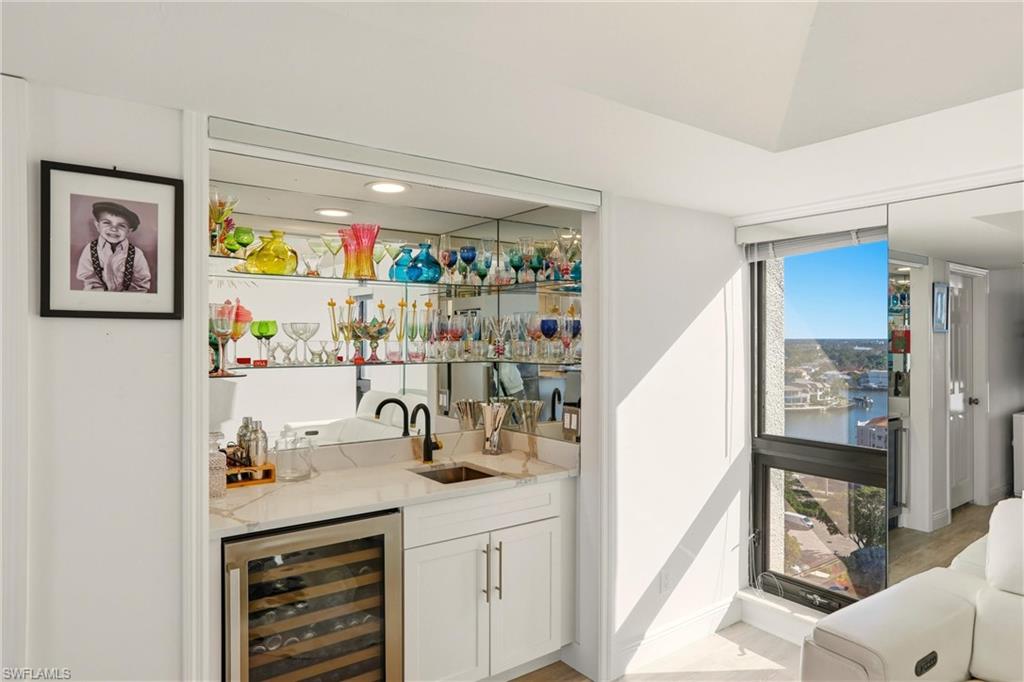 Experience the pinnacle of Gulf-front luxury in this exquisitely renovated 15th-floor residence at the esteemed Esplanade Club in Park Shore. Elevated above the shoreline with sweeping, unobstructed views of the Gulf and Venetian Bay area, this sophisticated retreat offers an extraordinary backdrop for both serene coastal living and elegant entertaining. A spacious wraparound balcony embraces the residence, capturing dazzling vistas to the west and north. Inside, natural light fills the open-concept living and dining areas, where refined finishes and thoughtful design create an atmosphere of effortless elegance. The beautifully reimagined kitchen features a waterfall quartz countertop, breakfast bar seating, a smart oven with electric cooktop and built-in air fryer. A wine refrigerator, and a stylish bar—perfect for hosting with ease enhance the living area. Designer touches throughout the home elevate every detail. The tranquil primary suite offers a walk-in closet and dual vanities, while the private guest suite includes its own full bath. Both bedrooms open directly to the balcony, ensuring breathtaking water views from sunrise to sunset. Additional enhancements include impact-rated windows and doors, in-residence laundry, a leak detection system, private storage, and a dedicated covered parking space. Residents of the Esplanade Club enjoy an exceptional array of resort-style amenities: a 24-hour front desk attendant, electric vehicle charging, bicycle, kayak and paddleboard storage, a beautifully updated social room with catering kitchen, a fitness center, and a stunning beachside pool and spa with an expansive sun deck. Outdoor gathering spaces include a fireplace lounge, gas grilling area, and a rooftop sports deck offering pickleball, tennis, bocce, shuffleboard, and a golf chipping net. The pet-friendly community even features its own dog park, enhancing its warm and active coastal lifestyle. Perfectly positioned just steps from the boutiques and waterfront dining of Venetian Village and minutes from Fifth Avenue South, Artis–Naples, Naples Botanical Garden, the Naples Zoo, Mercato, Waterside Shops, and countless family-friendly attractions, this residence embodies the very best of Naples beachfront living.