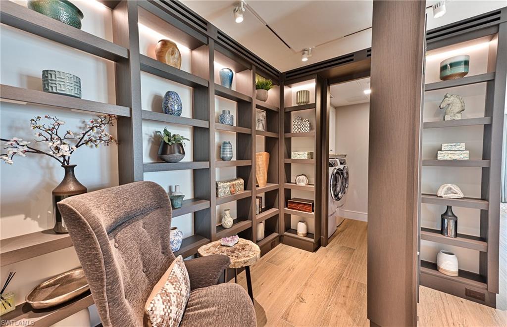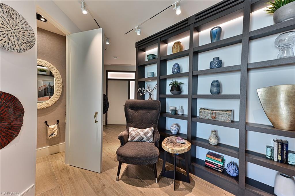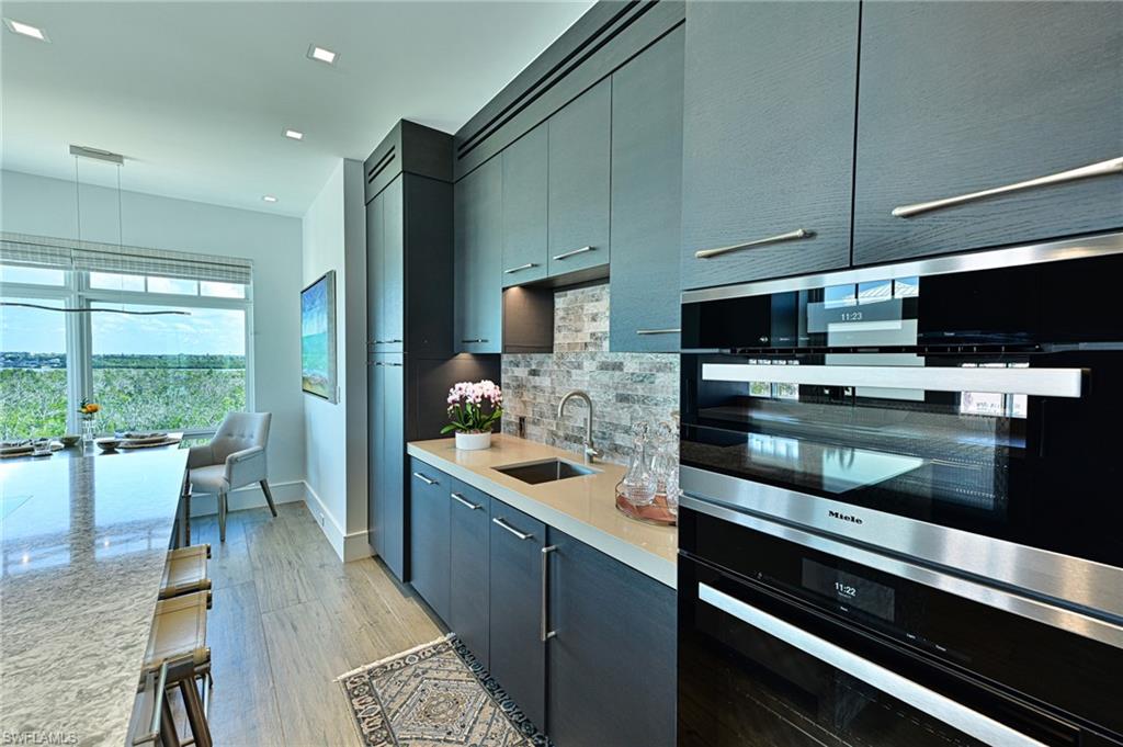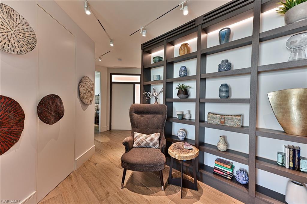 This Barefoot Beach end unit Penthouse offers the ultimate in luxury Florida beachfront lifestyle and is perhaps the finest condominium in the Barefoot Beach Club. This condo was taken to the bare concrete walls and totally reimagined to a timeless design where it is unrecognizable from the original floor plan. Enter via the custom lighted entry into immediate Gulf views via its open floor plan where the kitchen opens to the dining area & living room and they are all open to the screened lanai on the beach. The lanai offers outdoor dining, large seating area and a summer kitchen with grille all overlooking the turquoise water and white sand beach. There is a custom built sitting area offering hidden door access to the laundry room. The added half bath also is sleekly set into the wall with custom art camouflaging its location. The kitchen features a large island with cascading top, high end appliances, custom cabinetry, panoramic preserve & bayside views with amazing sunrises to the east, and wide Gulf views and sunsets to the west. The living area highlights the penthouses already taller ceiling heights which have been maximized with low profile linear HVAC ducts & led spot lighting. There is both a large screen HDTV & in ceiling theater projection for movie night. There are custom ceiling and millwork details throughout including the outdoor lanai’s custom tongue & groove ceiling & wood design electric shutter boxes that bring the indoor quality outdoors. The master bedroom layout has been vastly improved with bed wall facing the Gulf. The master bath is stunning with his & her vanities, hidden storage, beautiful soaking tub, & walk in shower. The master bedroom closet is finished with custom cabinet quality. The two guest bedrooms with en-suite baths are finished to the same level as the master bedroom and bath. Other features include: fireplace, solid wood 8’ doors, 4” ceiling lights including the lanai ceiling, designer light fixtures & plumbing fixtures, wood plank tile flooring throughout, custom built-ins inc the open den area shelving, Impact windows & sliding doors. Best of all the Interior design furniture and furnishings are available for purchase for a quick seamless move in. Barefoot Beach is Collier County’s premier gated Beach to Bay community featuring Royal Palm lined brick paver streets, 2 security guards 24 hours, and no public parking within the community. Barefoot Beach Club is a well managed & maintained family friendly Condominium Association. Gulf access boat dock leasing options are available. Option to join the Club at Barefoot Beach (located in the community) which offers casual & fine dining restaurants, pool & beachside food, drinks, chair service, indoor & outdoor bars, ice cream & coffee shop, tennis courts with pro & a full events calendar. (waitlist with usage during wait period). Barefoot Beach is centrally located to dining, entertainment, golfing, arenas & is close RSW Airport, the Promenade & Coconut Point.