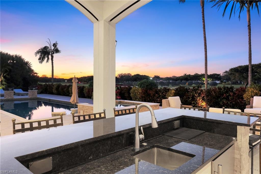 GOLF MEMBERSHIP AVAILABLE — Elegantly positioned on one of Talis Park’s most coveted golf frontages, this Santa Barbara Grande estate exemplifies refined Naples living and custom architectural excellence. Designed by Herscoe Hajjar Architects and masterfully built by Sunwest Homes with interior artistry by Design West, this residence offers nearly 6,000 sq ft of luxury living (9,210 sq ft total), tailored for both grand entertaining and serene everyday enjoyment. Step into an expansive floor plan where a light-filled multi-island kitchen flows effortlessly into the generous gathering and dining spaces, anchoring the heart of the home. The main level includes a sumptuous Master Retreat with private golf views, two ensuite guest bedrooms, a dedicated wine room, and a powder bath. Oversized 10’ sliding glass doors disappear to reveal an extraordinary outdoor living experience with a gas fireplace, fully equipped outdoor kitchen, custom pool and spa, and cabana bath—creating an unmatched indoor-to-outdoor lifestyle. Upstairs, an additional spacious Master Suite is accompanied by an expansive sitting room/bonus living area perfectly suited for relaxation, media, fitness, or office use. A covered balcony and generous sun deck overlook the lush fairway vistas of the newly updated golf course, creating yet another private retreat. Quality finishes throughout include vaulted and barrel ceilings, extensive custom woodwork and trim, polished marble inlays paired with hand-scraped hardwood floors, Thermador appliances, and a Sonos sound system. Located within the exclusive Prato enclave of Talis Park, residents enjoy access to premier membership amenities, including a championship Greg Norman and Pete Dye–designed golf course, world-class dining, tennis and pickleball courts, bocce, fitness and spa facilities, scenic paths, and concierge services—all just minutes from Naples’ iconic beaches, upscale shopping, and fine dining.