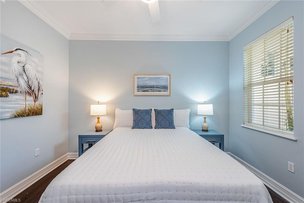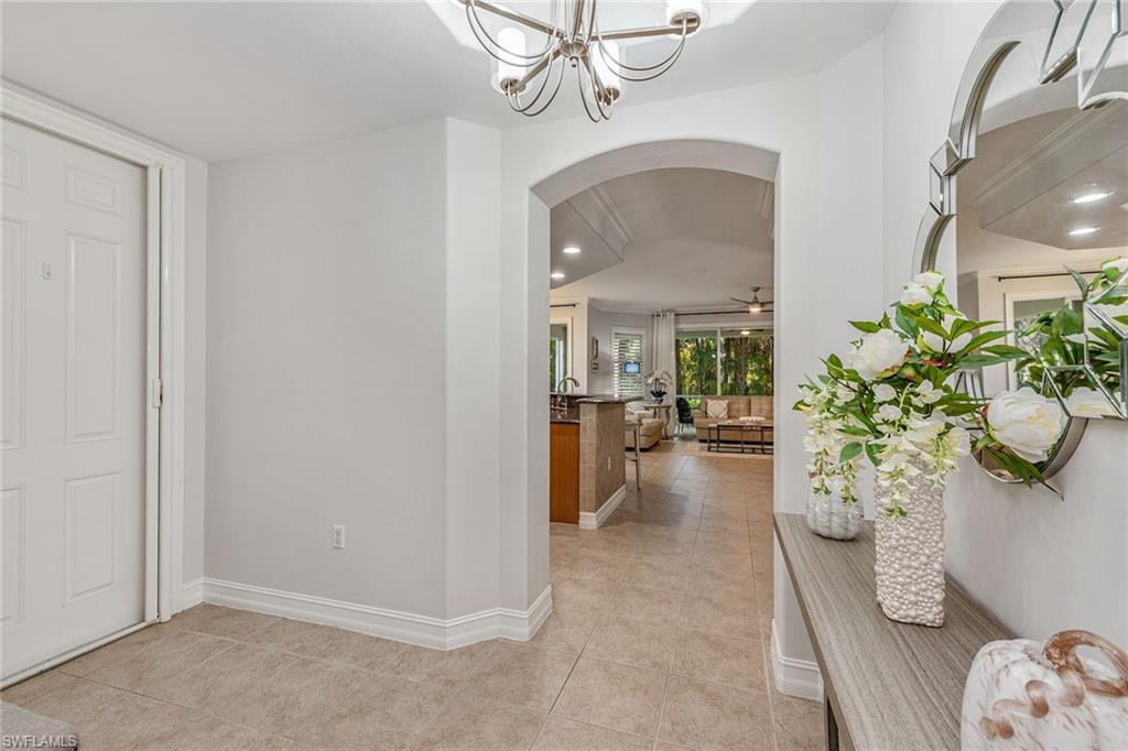 This inviting turnkey/furnished first-floor condominium offers comfort, privacy and an ideal Naples lifestyle, set within the desirable Bimini Bay III at Tarpon Bay. With its corner positioning and abundant windows, the residence is filled with natural light. The thoughtfully designed floor plan includes three bedrooms, two baths and a two-car garage. Tile flooring flows through the main living areas, complemented by crown molding and a bright, open feel throughout. The living room features sliding glass doors, windows featuring plantation shutters, a ceiling fan and direct access to the screened lanai, creating a seamless indoor-outdoor connection. The spacious lanai is finished with tile flooring, two ceiling fans, and offers a private, tranquil setting surrounded by lush tropical landscaping. The kitchen opens effortlessly to the living area and is well-appointed with maple cabinetry, granite countertops, tile backsplash, recessed and under-cabinet lighting, and a bar counter with seating. Stainless steel appliances include a gas range, dishwasher, microwave, and refrigerator with icemaker, making the space functional and inviting. Adjacent to the kitchen, the dining area is accented by a modern chandelier, ideal for everyday meals or entertaining. The primary suite serves as a private retreat, offering lanai access, luxury vinyl plank flooring, crown molding, a ceiling fan and walk-in closets. The en-suite bath features dual vanities with full-width mirrors, updated lighting, a walk-in shower with glass enclosure and an enclosed water closet. Two additional guest bedrooms are generously sized, each with ceiling fans and crown molding, providing comfortable accommodations for family or guests. A dedicated laundry room includes a top-load washer, front-load dryer and overhead cabinets for added storage. Ideally within the gated community of Tarpon Bay, residents enjoy a resort-style infinity pool, spa and fitness center overlooking serene water views, along with pickleball, Har-Tru tennis courts, basketball and wellness rooms. Conveniently close to shopping and just six miles from the beach, this residence offers a blend of location, lifestyle and low-maintenance living.