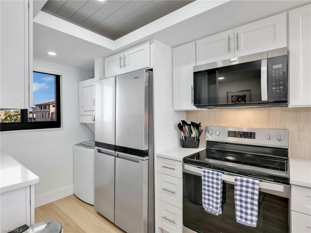 Direct Beachfront property awaits! Where can you find a completely updated beachfront property under 600k on Ft. Myers Beach with rare rental opportunities? This property has been completely renovated and ready for new owners including hurricane impact windows and sliders for piece of mind. The finishes were completed in 2025 and speak for themselves. As you enter this home, you are swept up in the breathtaking direct beach views. Every room offers a glimpse into the peaceful nature of sandy white beaches, the smell of the sea and the peaceful nature of South Florida. The larger than life 1025 sf footprint offers exceptional storage and function without sacrificing finishes. The smartly designed newly expanded kitchen has everything you would expect in a much larger home allowing for function and storage. The all white cabinetry and quartz counter tops are only outshined by the breathtaking beachfront views of the sugar sands of The Gulf of Mexico. The stainless steel appliances & in home washer / dryer make living the beach life effortless. The bedrooms are spacious and light and allow for restful living. The newly designed bathrooms were carefully reimagined to offer functional luxury. White cabinetry, stainless hardware, echo friendly quartz countertops and neutral tiles make these bathrooms a must see. Flooring includes luxury LVP that flows seamlessly throughout the home. The furniture exudes a beach rustic / Boho casual feel and offers worry free comfort in a casual setting. New for 2025 include new hot water heater / AC / owners closet / exterior doors / vanities & showers / hurricane window / doors and of course the expanded kitchen. New exercise room coming in 2026.You can capitalize on a rare investment opportunity at Carlos Pointe. As one of the select Fort Myers Beach associations permitting highly desirable weekly rentals, this would allow a new owner to unlock substantial income potential with many properties grossing between $35,000 and $45,000 per year in additional income to an owner. Owners can potentially offset carrying costs while reserving time for personal enjoyment. Imagine owning this rare jewel of a property, stepping outside your front door to enjoy a classic beachfront lifestyle, including shelling, jet skiing, and sailing or enjoying the many shopping, dining and entertainment venues Ft. Myers beach has to offer. Welcome to unparalleled beachfront living! Close to shopping, restaurants and entertainment this property offers it all.