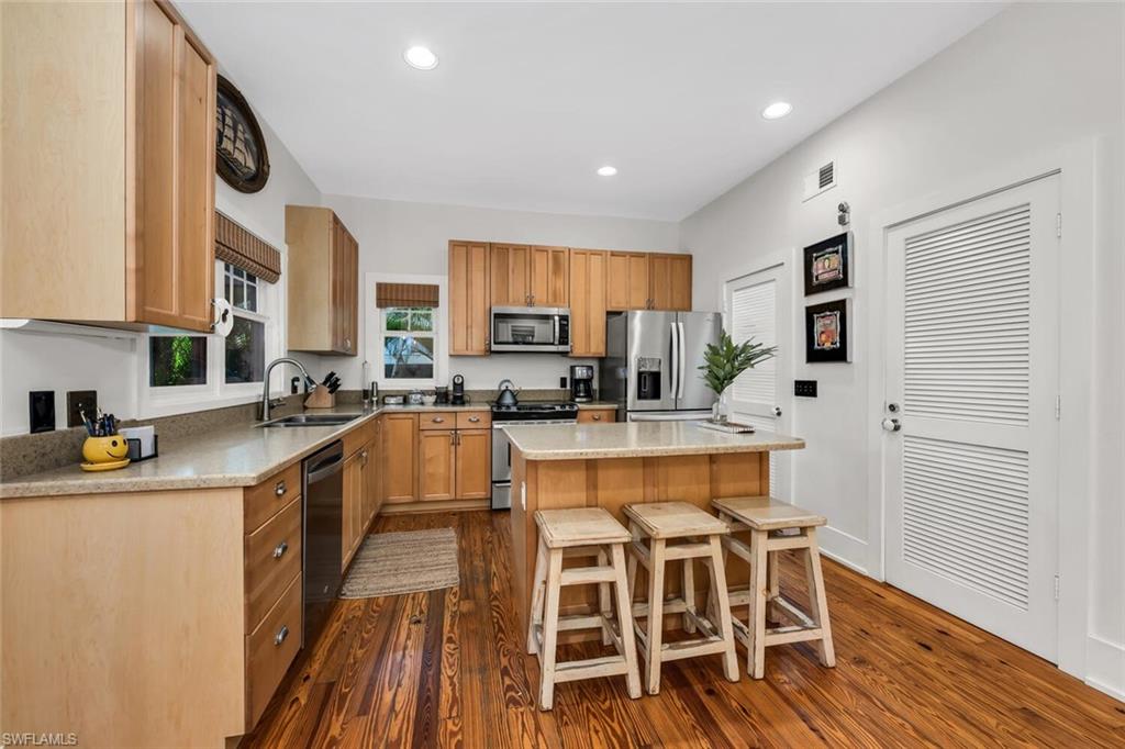 Timeless Old Florida charm defines this ideally located residence, positioned between the 3rd Street South and 5th Avenue South entertainment districts and just three blocks from iconic 5th Avenue South. This enchanting four bedroom plus den residence offers 2,909 square feet of living space, three full and one half baths, and a welcoming wraparound porch that sets the tone for relaxed coastal living. Tucked just off Cambier Park, the property features a thoughtfully connected two-story guest house with living space on the lower level and a private bedroom above—ideal as a primary suite, guest quarters, extended-family accommodation, or a private office retreat. The upper level of the main home showcases two bedrooms and a loft beneath a vintage tongue-and-groove wood-plank ceiling, with both bedrooms opening to private balconies that capture gentle coastal breezes. The main floor includes the kitchen and great room, along with a fourth bedroom or den with en-suite bath. Classic Old Florida storm shutters add both character and function. The generous backyard offers ample room for a pool and outdoor entertaining, while a rear-entry two-car garage off the paved alley provides convenience and additional parking. Private front and rear yards are framed by mature hedging, with a charming archway entry, quaint wooden gate, and parking for two vehicles off 8th Avenue South, plus additional parking in the rear. A 2019 metal roof adds peace of mind. Located directly across from Cambier Park, offering a competitive tennis program, shuffleboard courts and bocce, covered pavilion, band shell, and expansive green space. Close to everything, welcoming, and rich in character—this is a rare opportunity to own a true downtown Old Florida cottage.