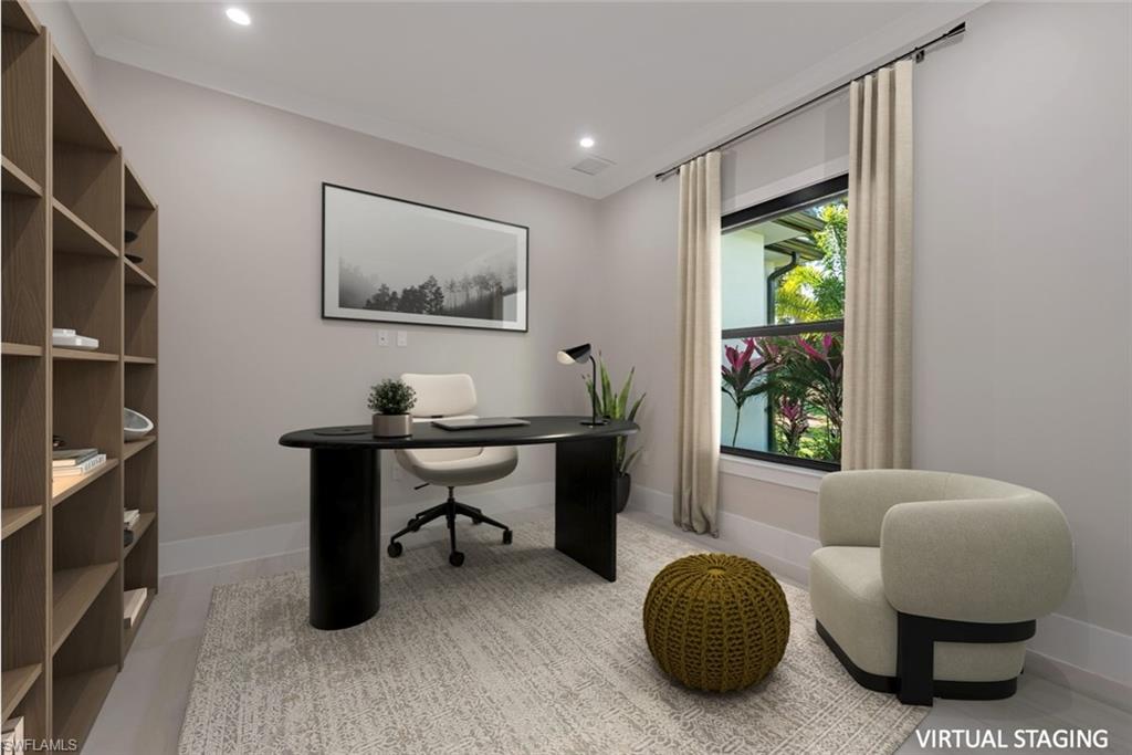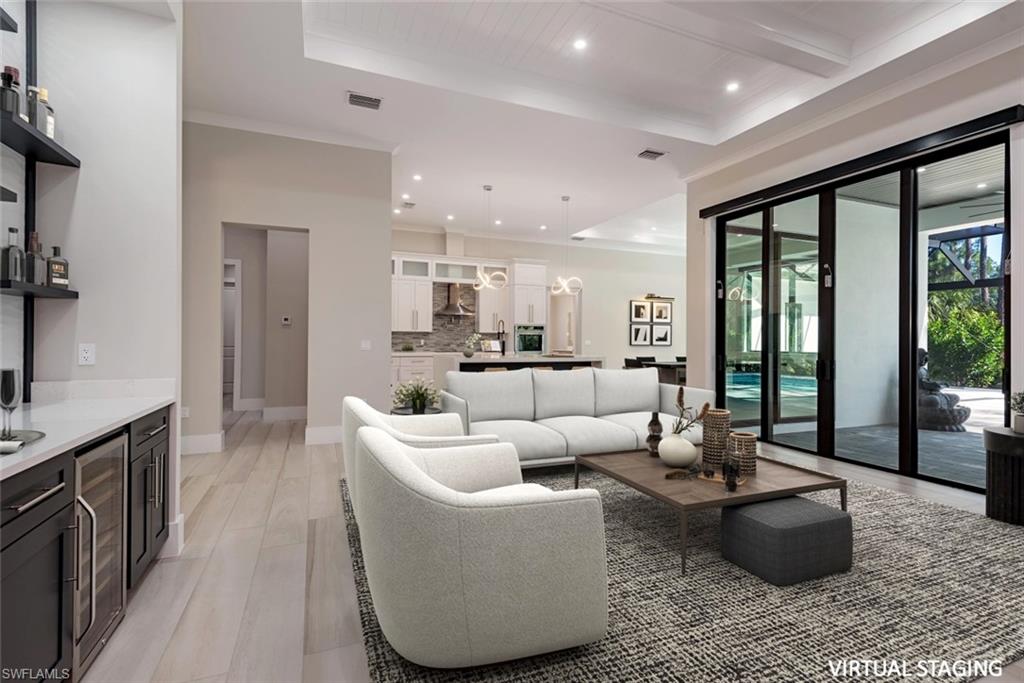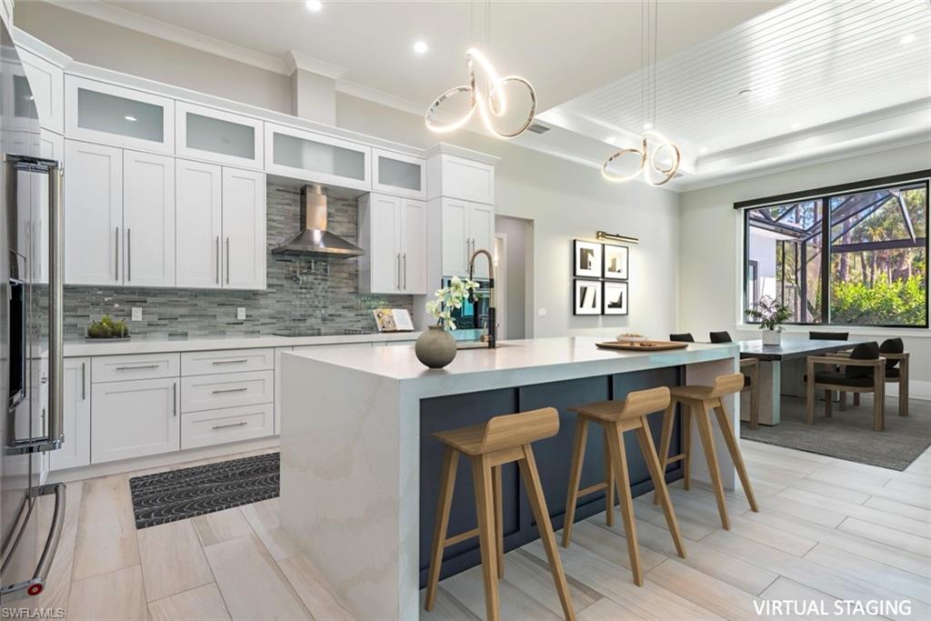 Welcome to 662 9th Street SW, a newly built 2024 residence offering refined design, modern comfort, and exceptional privacy on 2.5 acres in Golden Gate Estates. The home offers 3,207 square feet of living space, including 4 bedrooms, a den, 4 full bathrooms, an expansive lanai, a custom pool/spa and a 3-car garage. Set behind a motorized gated entrance and framed by a lush Calusia hedge, this property delivers a rare combination of space, craftsmanship, and functionality. A paver driveway leads to a thoughtfully designed home featuring soaring 13-foot ceilings in the main living areas and primary suite, wide-plank wood-look tile flooring, and custom architectural ceiling details throughout. The kitchen is both elegant and functional, highlighted by white cabinetry, a large center island with waterfall quartz countertops, KitchenAid appliances with dual ovens, pot filler, and glass tile backsplash. The living area includes a custom built-in media wall and a stylish bar with wine cooler, quartz counters, and open shelving—ideal for entertaining. Natural light fills the formal dining room and living spaces through expansive sliders and custom window treatments, including motorized shades. The primary suite offers a true retreat with dual custom walk-in closets and a spa-inspired bathroom featuring dual vanities, an oversized walk-in shower with dual showerheads, and a freestanding soaking tub. All bedrooms include custom closet systems designed for organization and ease. Outdoor living is a standout feature, with a 590-square-foot covered lanai boasting 12-foot beamed wood ceilings, recessed lighting, and a full outdoor kitchen with grill, side burner, sink, and refrigerator. The saltwater pool and integrated spa are enclosed by a panoramic screen cage, creating a private setting to enjoy Southwest Florida living year-round. Additional highlights include an air-conditioned three-car garage with epoxy floors and glass panels in the doors. Other features include a whole-house reverse osmosis water system, 26kW whole-house generator with underground propane tank, LED lighting throughout, and room on the rear of the property to add a secondary structure. This home offers privacy, quality construction, and modern luxury—perfectly suited for those seeking space and comfort in Naples. Ideally located in Golden Gate Estates, residents enjoy the tranquility of acreage living while remaining within easy reach of Naples’ renowned white-sand beaches, boating, golf courses, and an exceptional dining scene. Downtown Naples, Fifth Avenue South, Mercato, and world-class shopping, restaurants, and cultural attractions are all just a short drive away, offering the best of both privacy and accessibility.