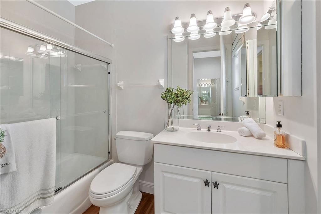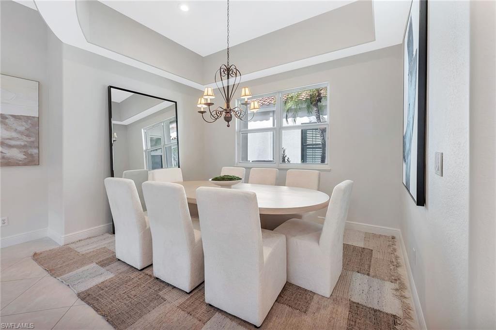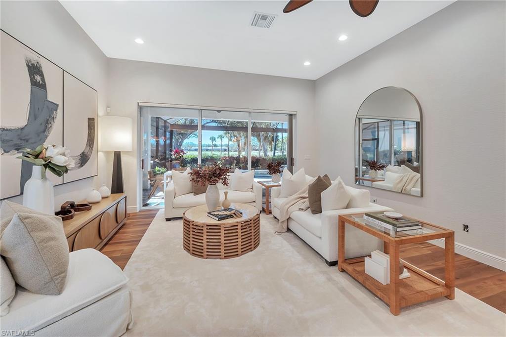 Welcome to 977 Tierra Lago Way, where panoramic golf course views and lake views set the backdrop for stylish and elevated living in The Vineyards. This thoughtfully updated three-bedroom plus den, four-bath home offers approximately 2,800 square feet under air and over 3,500 total square feet of elegant, well-designed living space. The open-concept great room connects seamlessly to the beautiful kitchen with spacious center island, stainless steel appliances, plus a dining and living room area with sliding doors to the side yard. Hardwood flooring, high ceilings, and custom lighting add warmth and sophistication throughout. The primary suite is a private retreat with lanai access, custom walk-in closets and a spa-inspired bath complete with a large shower and dual vanities. Three additional guest bedrooms and a flexible den space provide plenty of room for family, visitors or a home office. Go outside to a spectacular screened lanai with an picture screen window to the signature hole of the Vineyards North Course, covered outdoor living and dining areas, and long, uninterrupted views of the water and golf course beyond. Additional highlights include an elegant foyer entry and an attached two-car garage. On a quiet street in the Vineyards, desirable gated community, with access to optional country club membership offering golf, tennis, pickle ball, fitness and more.