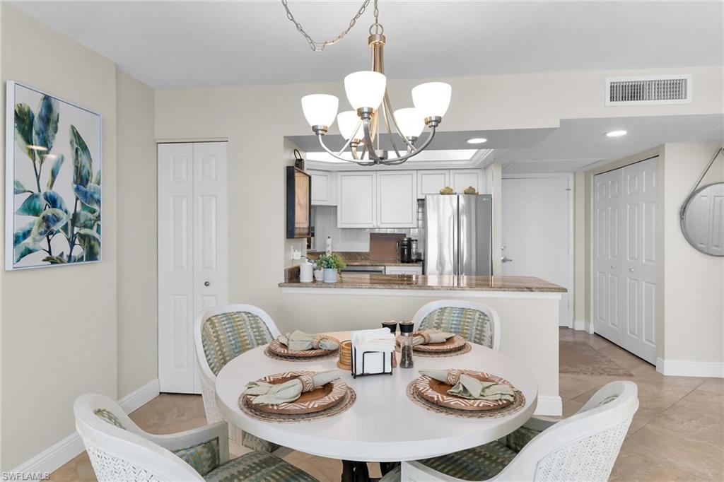 Welcome to Vanderbilt Towers in beautiful Naples, Florida—where coastal living meets comfort and convenience. The newly renovated lobby and ground-floor common areas offer a warm and stylish welcome to this professionally managed condominium community. Just a short walk to the beach and minutes from exceptional dining, shopping, and entertainment, this location truly has it all. This beautifully maintained one-bedroom residence is located on the 8th floor (top floor) and features an updated kitchen with newer appliances, refrigerator, dishwasher, microwave, water heater and four year old AC system . The open living and dining areas are bright and inviting, complemented by ceramic tile flooring throughout the entire condo. The spacious bedroom includes an upgraded walk-in closet designed to maximize storage, along with an additional vanity area. The updated bathroom adds to the home’s move-in-ready appeal. Fresh interior paint and an updated electrical panel provide peace of mind, while hurricane-impact glass on the living room and bedroom sliding doors enhances safety and energy efficiency. Step outside to the large, newly screened-in lanai—perfect for relaxing or entertaining while enjoying stunning views of the marina, pool, and the Gulf. This condo is an ideal full-time residence, seasonal retreat, or investment opportunity in one of Naples’ most desirable beachfront communities.