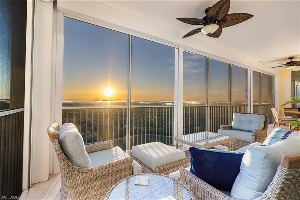 Perched high on the 12th floor in Jasmine Bay South, this impeccably designed residence delivers a front-row seat to some of the most spectacular scenery in all of Southwest Florida, with sweeping panoramic views stretching from Naples to Fort Myers Beach, across Estero Bay, the championship golf course, and out to the Gulf of Mexico. Positioned on the coveted 03 stack of the south tower, the residence benefits from a southern bump-out that enhances both privacy and sightlines, widely considered to offer one of the finest views in the entire community. A generous wrap-around lanai and expansive 35-foot balcony blur the line between indoors and out, creating the perfect setting to enjoy your morning cup of coffee while taking in the expansive views, vibrant crimson sunsets, and peaceful evenings under the stars, all just steps from the great room and primary suite, both opening directly to the outdoor living space. Inside, the light-filled interior features volume ceilings, elegant architectural details, crown molding, and a sophisticated blend of diagonally set travertine flooring in the main living areas paired with new wood flooring in the primary and guest bedrooms. The extended, renovated kitchen is bright and modern with crisp white cabinetry, quartz countertops, stainless steel appliances, a microwave drawer, and a seamless connection to the dining area overlooking the view. The owner’s suite is a serene retreat offering custom closets and a spa-inspired bath with dual vanities, soaking tub, walk-in shower, and separate water closet. Additional features include hurricane roll-down protection, designer doors, recessed lighting, high-efficiency climate control, hurricane-resistant windows, private elevator lobby access, a full utility room with cabinetry and sink, and state-of-the-art wiring. Jasmine Bay residents enjoy secured parking, private storage, concierge services, guest suites, and resort-style amenities including an infinity-edge pool and spa, private cabanas, fitness center, theater, club and card rooms, all surrounded by more than 500 acres of Audubon-recognized preserve. Ownership at West Bay Club includes access to the River Park with Gulf-access boating, tennis, pickleball, and the highly sought-after private Beach Club on Little Hickory Island, with golf available through a separate membership, all ideally located just east of U.S. 41 near Coconut Point, Miromar Outlets, Hertz Arena, and a short drive to RSW International Airport, offering an exceptional blend of elevated luxury, breathtaking views, and a truly unrivaled coastal lifestyle.