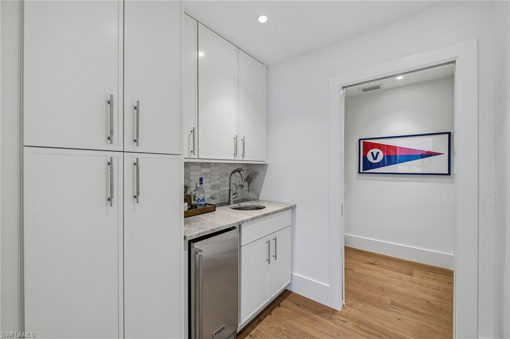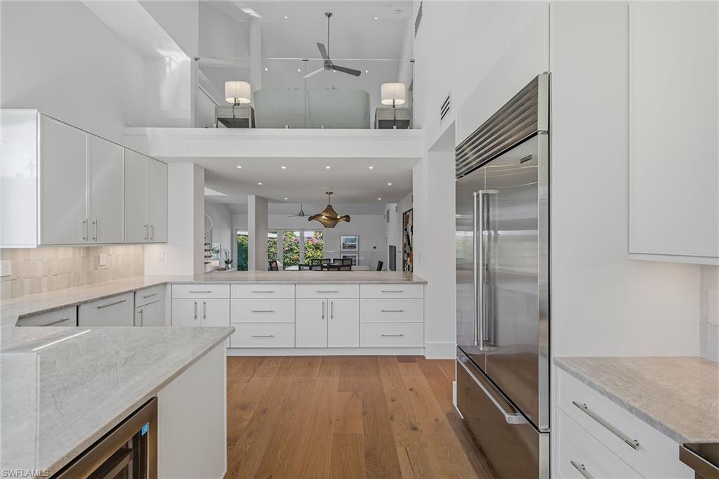 This impeccably furnished, three-bedroom villa with loft and three full baths has been masterfully transformed, pairing architectural refinement with a thoughtful curation of bespoke materials and finishes. Inside, natural light dances across warm oak flooring, softly illuminating a composition of elegant textures and clean-lined sophistication. The reimagined kitchen is framed by walls of glass, opening to lush exterior vistas. Solid wood cabinetry, quartzite surfaces, and a suite of professional-grade appliances elevate culinary moments, while a concealed walk-in pantry with a coffee bar and ice maker ensures every detail is considered. The first-floor primary suite is a tranquil sanctuary, where lake and fountain views offer a natural canvas for serenity. Its spa-inspired bath is finished with soaring ceilings, artisan tilework, and premium fixtures, while the custom-fitted walk-in closet offers a discreet nod to luxury living. A second en-suite guest suite, privately on the first floor, opens directly to the front courtyard, positioned for comfort and retreat. Upstairs, an airy loft leads to an additional guest suite with a full bath, creating a versatile space that adapts effortlessly to rhythms of modern life. But it is the seamless connection between interior and exterior that defines this home’s true spirit. A sparkling, oversized swimming pool anchors the marble-clad courtyard, surrounded by generous lounging and gathering areas designed for sun-drenched afternoons and starlit evenings. Beyond, a screened lanai enveloped in lush foliage invites quiet reflection, while the rear terrace, framed by panoramic lake views, sets the stage for alfresco dining or fireside conversation. This is more than a residence, it is a lifestyle. Pelican Bay offers unmatched resort-style living with exclusive private beach access, two beachfront restaurants, state-of-the-art fitness and wellness facilities, racquet sports, scenic walking and biking paths and more, all set along Naples desired coastline.