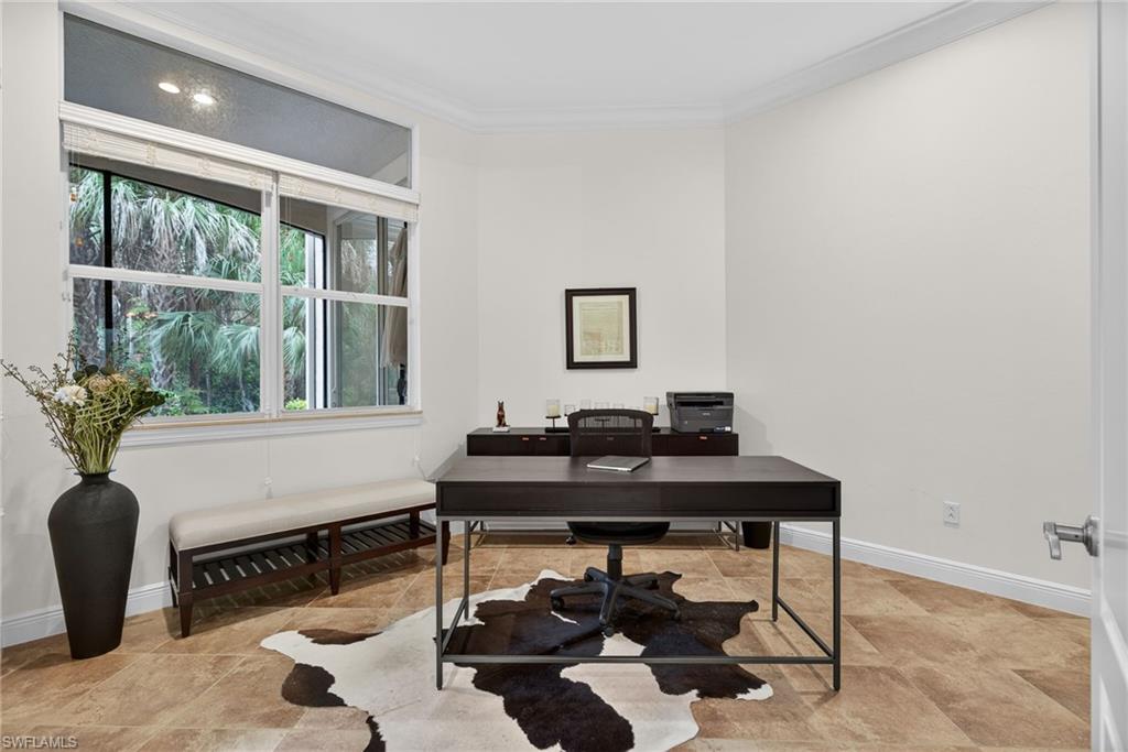 Located in the prestigious Mediterra Golf and Country Club, this beautifully updated first floor Calabria coach home offers tranquil, lush reserve views and access to the community’s newly renovated private beach club. This rare floor plan is filled with custom touches, including volume ceilings with wide crown molding, updated bedroom flooring, and elegant tile throughout the main living areas. The gourmet kitchen features premium stainless-steel, built-in appliances, upgraded wood cabinetry, a custom tumbled marble backsplash, expansive granite countertops, and a built in wine cooler, making it ideal for both everyday living and entertaining. The primary suite offers a private sitting area, coffered ceilings, a large picture window, and direct access to the spacious screened lanai with gorgeous views of the reserve. Mediterra is one of Naples’ premier luxury golf and beach communities, offering two Tom Fazio championship golf courses, tennis, pickleball, bocce, a state of the art fitness center, and miles of scenic walking and biking paths. The private Mediterra Beach Club delivers a true Gulf front lifestyle with a two story, 10,000 square foot facility featuring indoor and outdoor dining, a restaurant and bar, heated pool, sundeck, and full cabana and beach chair service for members.