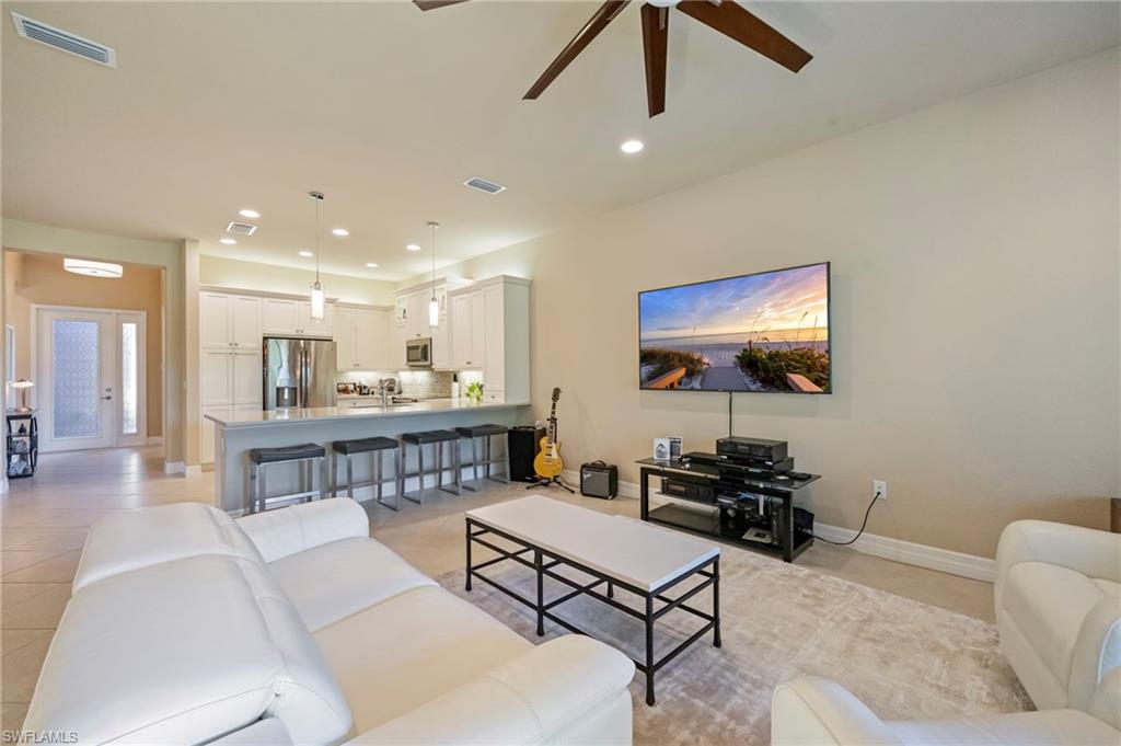 "Live life beautifully in Southwest Florida" in this stunning attached villa located in Marbella Isles, a resort-style, low-fee, gated community in central Naples. Built in 2017, this desirable Oxford floor plan offers 2 bedrooms plus a den and 2 bathrooms, thoughtfully designed with numerous upgrades throughout. The home features a model-quality kitchen with stainless steel appliances, tile flooring throughout the main living areas, and luxury vinyl flooring in the primary bedroom. Upgraded hurricane-impact windows and sliders provide added protection and peace of mind. Enjoy western exposure with serene lake views, ideal for sunset relaxation. Tucked away at the end of a private street with no homes to the right, this villa offers exceptional privacy. Marbella Isles offers an impressive array of amenities, including a clubhouse, resort-style pool, kiddie pool with slides, pickleball and tennis courts, half-court basketball, volleyball court, fitness center, game room, and card room. Perfectly located just 10 minutes from Naples’ beautiful beaches and Mercato, 15 minutes to downtown Naples, and only 25 minutes from Southwest Florida International Airport, this home delivers the ideal combination of luxury, convenience, and Florida lifestyle