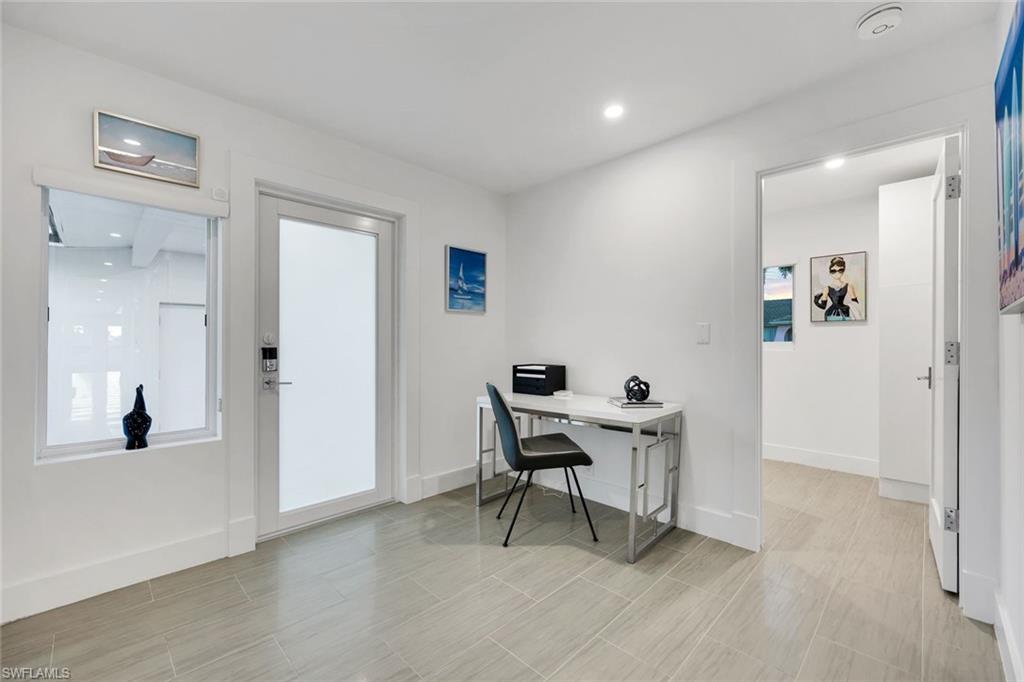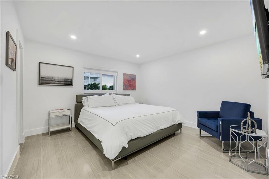 Striking architecture meets effortless coastal living in this fully reimagined 4/4 residence, ideally positioned along beautiful Vanderbilt Drive. Completely renovated and has a boat dock available! Sleek, contemporary aesthetic, this home features an open, light filled floor plan wrapped in a refined palette of soft greys and crisp whites. Offering approximately 2,265 sq ft with expansive screened lanai plus open air balcony. The living room has 9 ft ceilings with dramatic linear treatment which is anchored by expansive sliders fitted with remote controlled interior shades, delivering convenience and a clean, streamlined look. The kitchen makes a strong contemporary statement with a large island, sleek gray cabinetry and seamless finishes that elevate the space with premium appliances and Sub Zero refrigerator. Porcelain tile flows throughout boasting 4 en-suite bedrooms and baths plus tankless hot water heater, seamless metal roof, contemporary style front door accented by gray paver entrance. Thoughtful efficiency upgrades include a solar powered attic ventilator system enhancing comfort and energy performance. Outstanding second floor open air balcony offers elevated outdoor living with amazing long canal views and glowing sunset skies, accessed by a sculptural spiral staircase that adds visual interest. The breezeway and courtyard connection to the 2 car garage further enhances the Architectural flair. Set in a stellar location just minutes from the beach, and plethora of fine and casual dining including shopping, this thoughtfully designed and confidently modern residence. Ideal as a primary residence, seasonal retreat, or investment opportunity, it delivers a rare combination of design, location, and lifestyle appeal. Come enjoy this ultimate water view from this sought after oversized corner lot with extraordinary long canal view. Sits high and dry and never flooded. Steps to white sugar sand beach, the Ritz, Mercato, and LA Fitness. Bike to the beach!