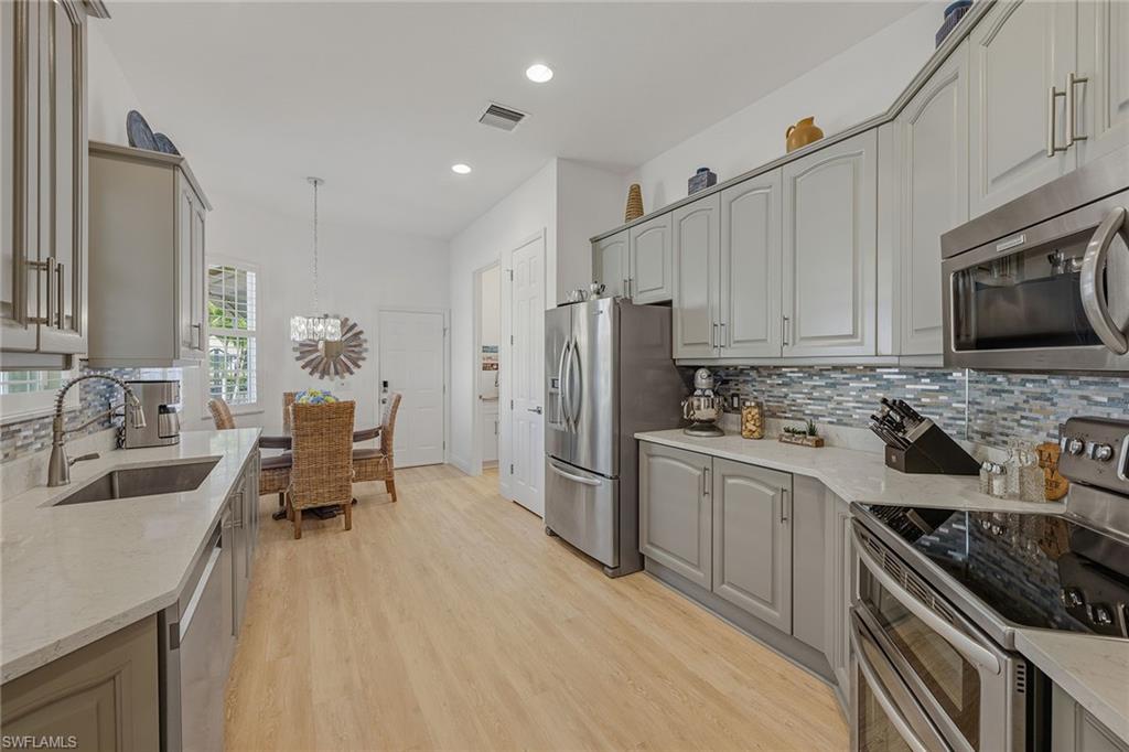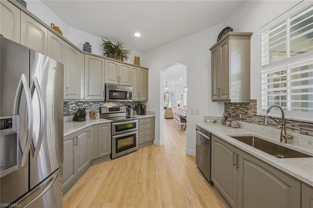 Positioned overlooking the stunning 12th fairway of the Rookery Golf Course, this absolutely gorgeous and nicely furnished Cotton Green residence offers extensive upgrades, impeccable renovations, exceptional privacy, serene views and desired southwestern exposure with glowing sunset skies. Designed for effortless luxury living, the three-bedroom, two full-bath home with attached two-car garage showcases a refined blend of modern upgrades and timeless elegance, beginning with a gated courtyard entry that opens to a light-filled interior featuring wood-look luxury vinyl plank flooring, new baseboards, arched walkways, recessed LED lighting and crisp white plantation shutters. The open living and formal dining areas flow seamlessly to the screened lanai, accented by crown molding, modern lighting and ceiling fans, while the chef-inspired kitchen impresses with sleek cabinetry, quartz countertops, mosaic tile backsplash, a window over the sink, pantry and stainless-steel KitchenAid appliances including a double-oven range, microwave, refrigerator with icemaker and a new dishwasher (2026), with a breakfast area positioned to enjoy tranquil views. The primary suite is a private retreat offering a vaulted ceiling, arched window with transom, lanai access, custom walk-in closet and a spa-style bath with dual quartz vanities, glass-enclosed walk-in shower and soaking tub, while two guest bedrooms with new carpeting and modern ceiling fans share an adjacent bath with a glass-enclosed tub and shower combination. Outdoor living is elevated on the screened lanai featuring covered seating, ceiling fan, a heated pool with a pool heater replaced in 2023, and an above-ground hot tub, all surrounded by lush tropical landscaping and peaceful golf course views. Additional highlights include a well-appointed laundry room with raised Samsung washer and dryer, overhead cabinetry, and utility sink, a fully upgraded garage with epoxy floor, LED lighting, EV-ready 240-volt outlet and overhead storage, a new air handler and condenser (2024/2025) and updated landscaping for serenity. Fiddler’s Creek residents enjoy access to an award-winning, gated community with newly enhanced amenities including a fantastic resort-style pool, updated Gator Grille restaurant, 10 new pickleball courts, an active clubhouse with fitness with trainers and classes, spa services, tennis, dining and a full calendar of events, along with optional memberships and no golf waitlist providing access to the championship course, new clubhouse, marina, and beach club-offering a lifestyle defined by luxury, leisure and connection. Excellent location with Publix, healthy café, nail salon and urgent care just outside the gate, an executive airport nearby for convenience, and close to beaches, museums, parks and everything we love about life in Southwest Florida.