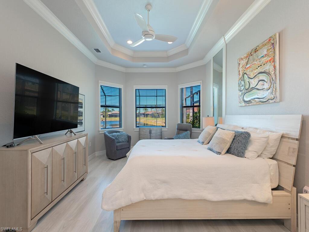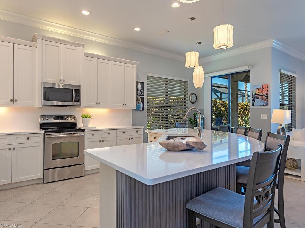 Paradise awaits in this beautifully updated Chandon floor plan, perfectly suited as a Naples winter retreat or an effortless full-time residence where everyday living feels like a vacation. From the moment you open the front door, the tranquil lake view sets the tone, drawing your eye through the home and out to the inviting lanai beyond. Designed to embrace the Naples outdoor lifestyle, the screened lanai offers the ideal setting for relaxed afternoons and effortless entertaining—dine alfresco under covered seating, unwind in the spa as the sun sets over the water, or cool off in the sparkling pool after a day spent enjoying the Florida sunshine. Inside, a bright, open-concept layout allows the home to live and entertain seamlessly. The great room flows into formal & casual dining areas and a light-filled kitchen, creating a welcoming space where guests can mingle comfortably. The chef-inspired kitchen serves as both a stylish focal point and gathering place, featuring new quartz counters and backsplash, a distinctive curved island, Alabaster Maple cabinetry, a new single-bowl granite composite sink, new Kohler faucet, stainless steel appliances, and ambient lighting that enhances the home’s warm, coastal feel. A thoughtfully designed split-bedroom layout provides privacy for owners and guests alike. The primary suite is a serene retreat with calming lake views, custom floor-to-ceiling framed mirrors, two walk-in closets—one with custom built-ins—and an ensuite bath that evokes a private spa. Guest bedrooms are comfortably tucked away, while all baths retain their classic Alabaster Maple cabinetry and framed mirrors, they are now complemented by refreshed quartz countertops and modern rectangular sinks. A versatile den with glass French doors and custom built-in offers the perfect space for a home office, reading room, or optional guest area. Additional features include 18-inch tile laid on the diagonal, Berry Alloc laminate flooring in the bedrooms, crown molding, window treatments, Minka ceiling fans, Nelson pendant lighting, landscape lighting, newer HVAC (2023) and a finished laundry room with upper cabinetry and a utility sink for added convenience. Located in Riverstone, a vibrant, vacation-inspired community for all ages in North Naples, just minutes from I-75 and zoned for A-rated schools. Residents enjoy a fitness center, social hall, resort-style pool, lap pool, spa, five lighted tennis courts, outdoor basketball and pickleball, a full indoor basketball court, tot lot, children’s water play area, game room, and an activities coordinator; making it easy to meet new friends. This home and community deliver relaxed sophistication, effortless indoor-outdoor living, and the unmistakable feeling that you’re exactly where you’re meant to be.