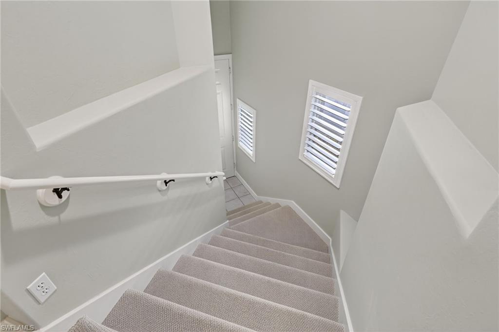 This three-bedroom, 2nd floor end unit Coach home, ideally positioned as a corner residence to maximize natural sunlight thru extra windows. Enjoy a private side yard and a spacious back area, were elevated views of lush green space, mature trees, and a tranquil, forest-like setting create a picturesque backdrop from the lanai, dining area, and master suite. Savor stunning pond views out front seen from both guest bedrooms, adding to the serene and scenic ambiance. Recently painted in light, neutral tones, this condo exudes a fresh, airy feel. The kitchen features white cabinetry and appliances, complemented by beige tile flooring and accented by silver sage walls for an open, inviting atmosphere. The adjacent dining area flows seamlessly to the lanai, perfect for indoor-outdoor entertaining. Elegant plantation shutters throughout enhance both style and value. Additional updates include a new water heater, upgraded sliding door rollers, a new disposal, and a modern garage opener. Tarpon Cove residents enjoy access to three sparkling pools, a relaxing hot tub, and a versatile community building—ideal for social gatherings and private events. This friendly, walkable neighborhood is just minutes from top dining, shopping, and renowned Gulf beaches. The Tarpon Cove Beach & Racquet Club is a short bike ride away, offering members exclusive amenities such as tennis courts, a state-of-the-art fitness, dining facility, resort pool, and many social events. Prospective buyers can contact the club for details or indulge in a boat ride, or secure a day pass to sample the lifestyle. This condo is being sold fully furnished—ready to enjoy this SW Florida location!