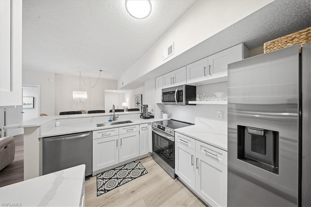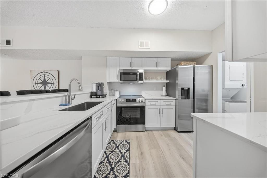 Welcome to resort-style living in Napoli Luxury Condominiums in beautiful Naples, Florida. This well-appointed 3-bedroom, 2-bath residence offers the perfect blend of comfort, style, and convenience—ideal for full-time living, a seasonal retreat, or an investment opportunity. The thoughtfully updated interior features a renovated kitchen (2025) showcasing brand-new stainless steel appliances, quartz countertops, and a clean, modern design that flows seamlessly into the living and dining areas. Both bathrooms were also upgraded with new vanity (2025), creating a cohesive and contemporary look throughout the home. New flooring (2023), fresh interior paint (2023), and a newer A/C unit (2017) add peace of mind and move-in readiness. This condo includes a detached 1-car garage plus one assigned parking space, a valuable bonus in condo living. The open layout offers comfortable bedroom separation, generous natural light, and an inviting atmosphere for everyday living or entertaining. Located in a gated, low-density community, Napoli offers resort-style amenities including a clubhouse, sparkling pool, fitness center, tennis and racquetball courts, scenic walking paths, and lush tropical landscaping. Conveniently situated, you’re just minutes from shopping, dining, I-75, and a short drive to Naples’ world-class beaches and downtown. This is your opportunity to own a beautifully updated condo in one of Naples’ most desirable and amenity-rich communities.