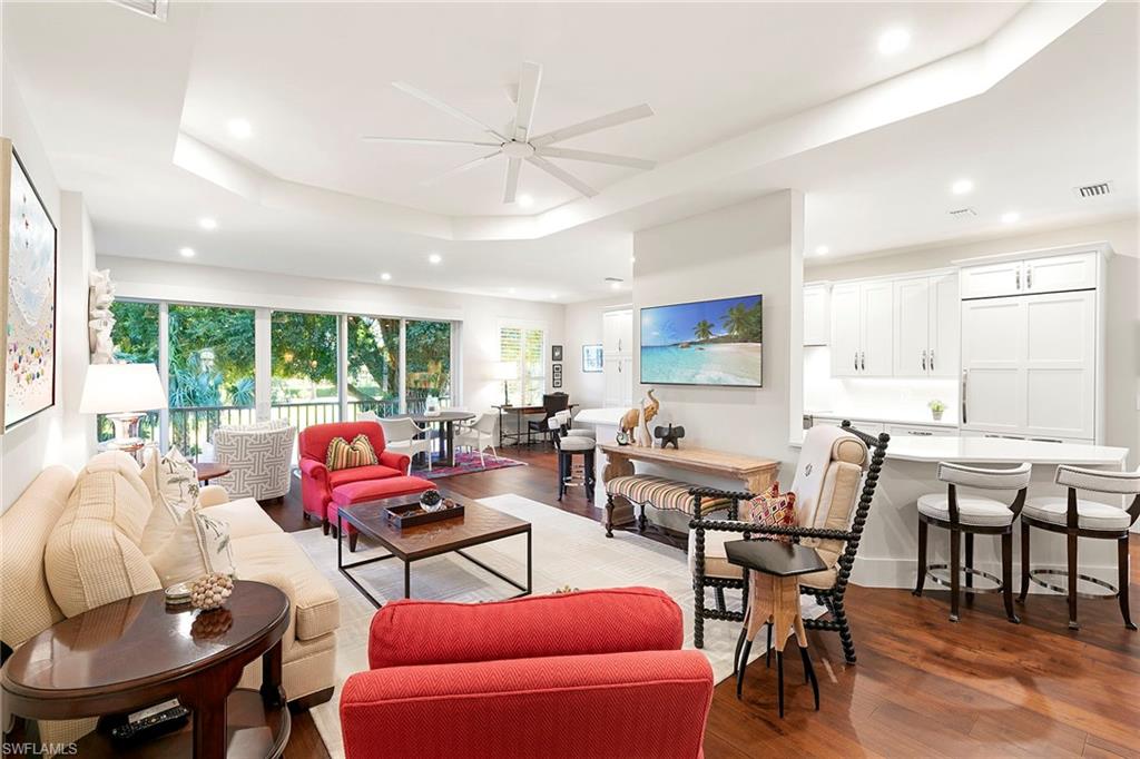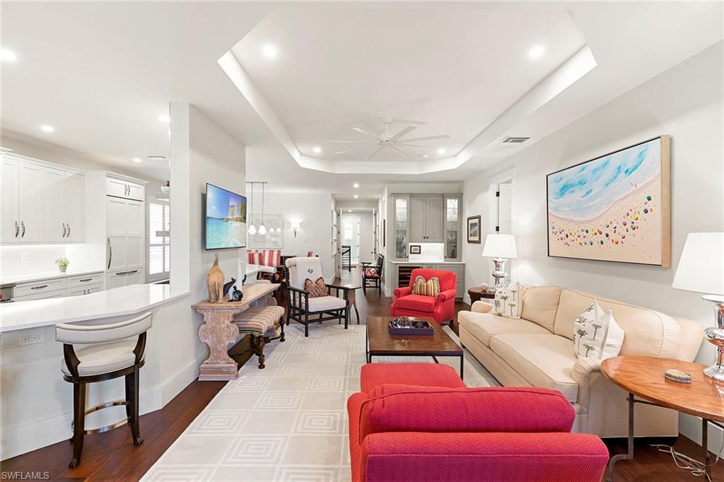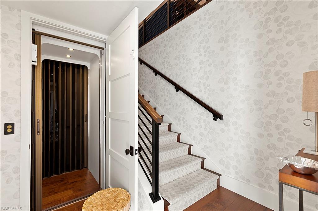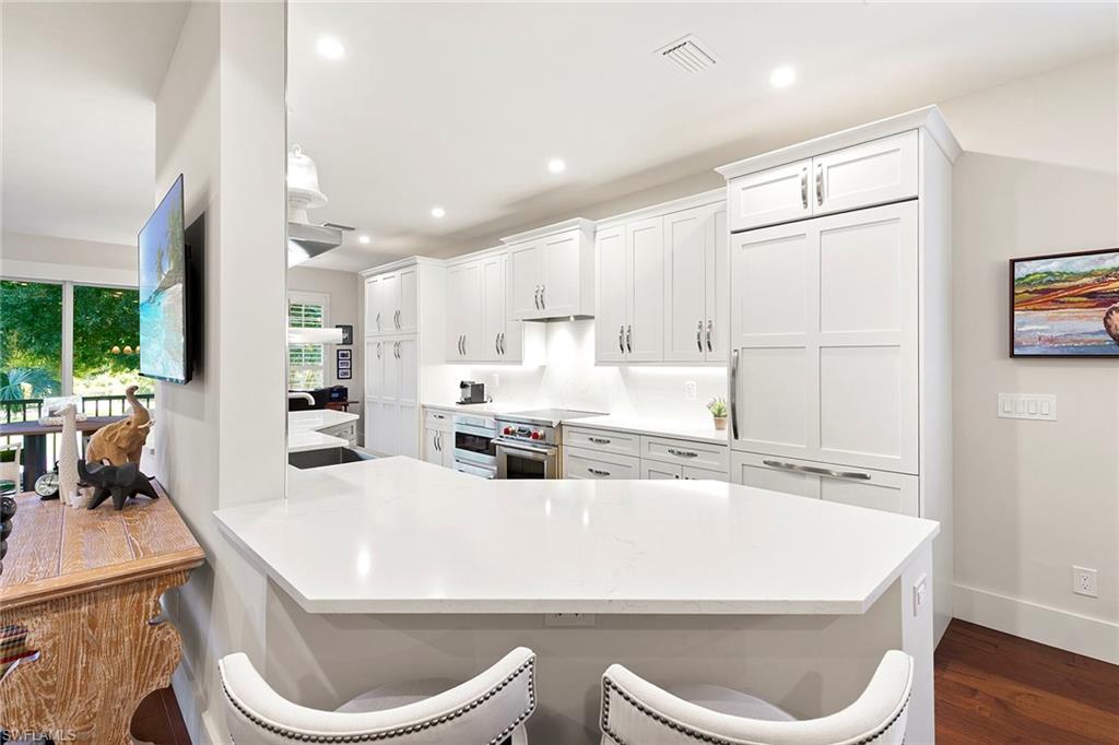 Perched on the second floor in Covington Row at Crescent, this completely renovated Pelican Bay coach home is the kind of place that makes you exhale the moment you go in, with peaceful golf course views across the 5th hole of the Bay course and a light, elevated feel that instantly says you're home. The residence lives beautifully with three bedrooms and a generous loft (ideal as a second lounge or office) and 2.5 baths, along with the rare luxury of a private elevator and two-car attached garage. Thoughtful finishes include wood flooring, custom tile in the baths and laundry, plantation shutters, electric blinds over the sliders, and a built-in living room bar that makes entertaining feel effortless. The kitchen remodel is designed for people who actually love to cook and host, featuring custom wood cabinetry, quartz countertops, a custom backsplash, and a premium lineup of Wolf and Sub-Zero appliances. All baths were also fully renovated with custom tile, frameless showers and designer vanities. Crescent is a gated community, ideally near Pelican Bay Wellness Center, close to daily conveniences like Publix at Pavilion and Whole Foods at Mercato, with a short bike ride to the beach tram. From there, it's pure Pelican Bay, beach clubs, dining, tennis, pickleball, theater and the easy rhythm of life by the Gulf.