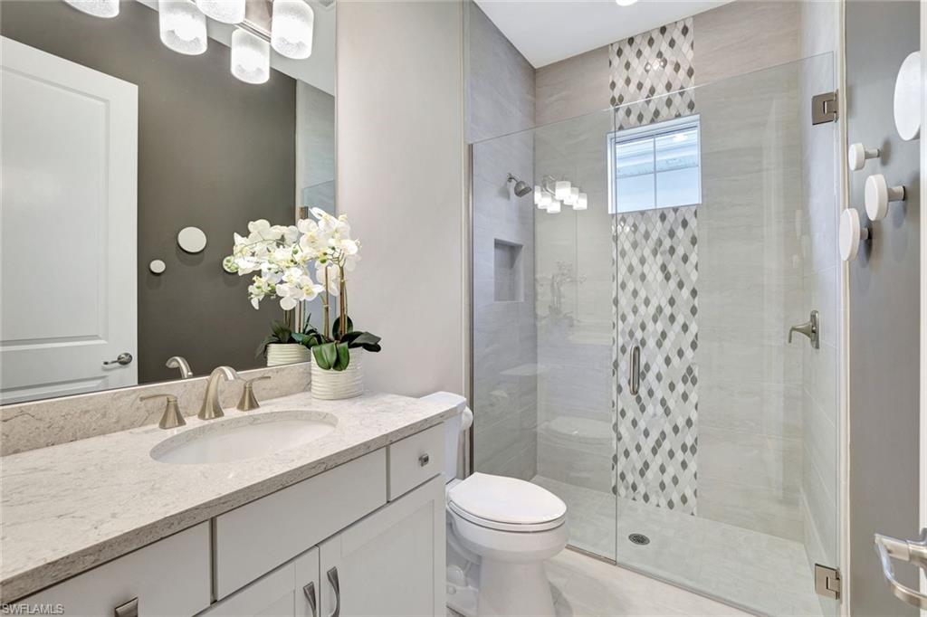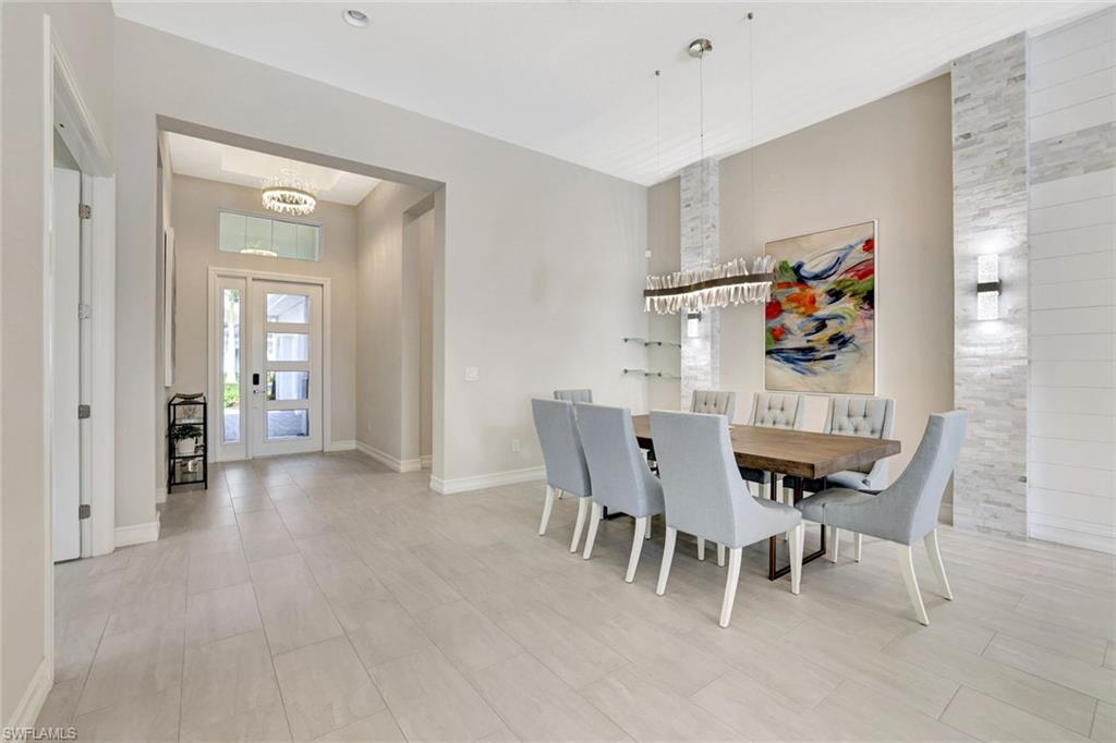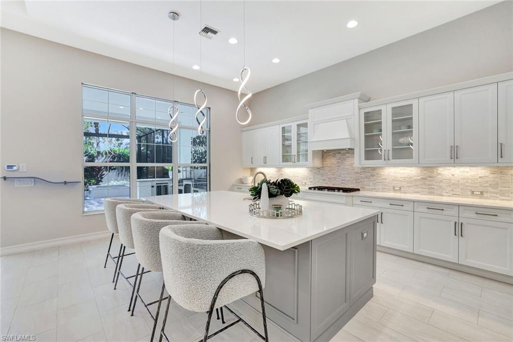 Indulge in modern luxury at this exquisite STOCK LUXURY home in the prestigious Marsh Cove in Fiddlers Creek. As soon as you walk in you are struck by the Great room's soaring CUSTOM CEILINGS, with an exquisite Chandelier, custom built in ship lap and tile wall extending into the Dining Room with decorative pillars and stunning wall sconces. The 10 foot Pocket SLIDING DOORS lead to the EXPANSIVE lania and features a sparkling SALT WATER pool and cascading waterfall spa , a panoramic screen, travertine tile and a long pool bench inside the pool. The outdoor summer kitchen is fully equipped with stainless steel grill and rotisserie, 2 burner cooktop, beverage/wine refrigerator with quartz countertops, and a sit up bar area, creating the ultimate setting for alfresco dining and relaxation. The chef inspired kitchen has beautiful white cabinetry, quartz countertops and a large island with a reverse osmosis faucet. The serene master suite offers a private retreat with French doors and a transom window leading to the Lania and a spa-inspired bathroom featuring dual vanities, a soaking tub, a walk-in shower with a water filter, custom wall coverings and 2 separate spacious walk-in closets with custom shelving. The additional upgrades include; insulated garage with air conditioning(2023), Generac whole home generator, privacy screens on the lanai, new landscape lighting, and a stoned walking path for convenience. Ownership includes access to the award-winning Fiddler’s Creek resort-style pools, clubhouse dining, spa, fitness center, tennis, pickleball, and optional golf membership and beach membership just minutes from Marco Island beaches and downtown Naples.CDD is PAID and LOW Transferable FLOOD INSURANCE!