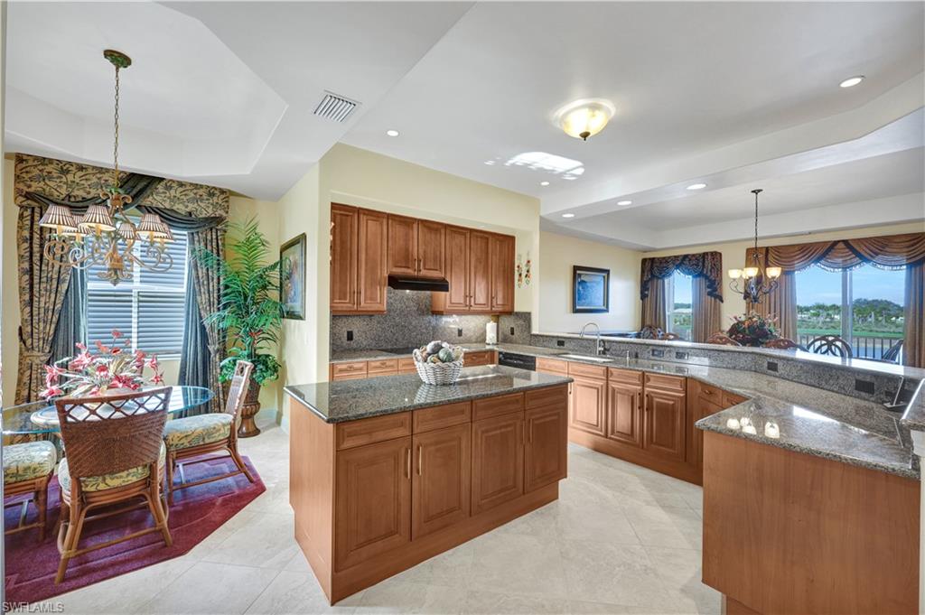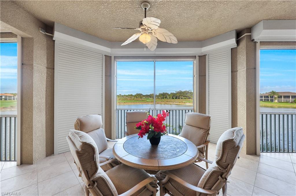 This meticulously cared-for condo features elegant decorator touches, upgraded builder details, designer lighting, and custom window treatments. With an impressive floorplan offering more than 2,900 square feet of living space, the home includes three bedrooms plus a den, three and a half bathrooms, a two-car garage, and a private elevator. Enjoy scenic lake, fountain and golf course views from the spacious screened lanai equipped with electric shutters, as well as a personal sun terrace and a second balcony off the guest suite. The neighborhood offers outstanding amenities such as a junior Olympic-sized infinity pool, spa, clubhouse equipped with an exercise room, cabana bar, and gas grills. Experience luxury and sophistication in this residence, situated within the award-winning Vineyards community.