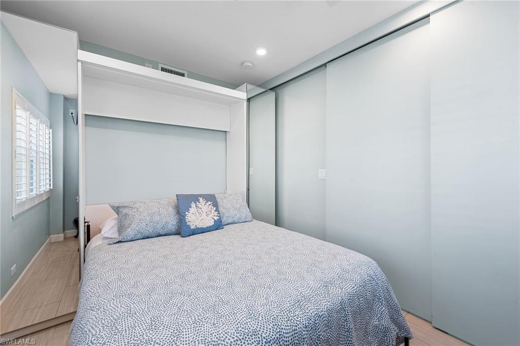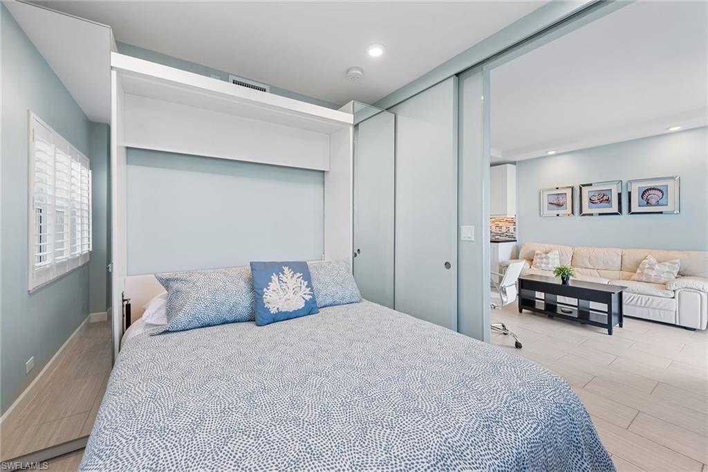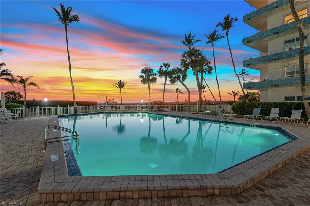 Discover an immaculate, customized coastal retreat with captivating beach and Gulf views in the charming Sunset House on Marco Island. Ideally positioned directly on the island’s award-winning crescent of white sand, this beautifully renovated one-bedroom, one-bath residence enjoys western exposure, glowing sunsets, swaying palms, and an open-concept design that maximizes space and natural light, ideal for a serene island escape. The bright interior features updated tile flooring throughout, recessed lighting, custom built-in shelving, and impact-resistant doors and windows for added peace of mind. The kitchen is thoughtfully appointed with quality white cabinetry, under-cabinet lighting, a mosaic tile backsplash and stainless-steel appliances, including a range, microwave, dishwasher, and a refrigerator/freezer updated in 2021. The living area flows seamlessly to a private balcony, where pool and beach views create a picture-perfect backdrop for relaxing or entertaining. The owner’s suite offers privacy with pocket doors, a built-in Murphy bed and mirrored closet doors. A spa-inspired bath completes the retreat with a walk-in shower featuring a rain shower head, floor-to-ceiling tile with niche, and a sleek glass enclosure. White plantation shutters throughout add a refined coastal touch. Residents of Sunset House enjoy resort-style amenities, including a large heated beachfront pool, an updated social room with kitchen and library, a barbecue area and a private boardwalk to the beach. This sought-after beachfront building offers an intimate, peaceful atmosphere with convenient features such as bike and beach-chair storage and covered, reserved parking. Go directly onto the sand to savor the Gulf’s turquoise waters, ideal for strolling, swimming, sunset watching, fishing or beachside yoga. Marco Island’s vibrant lifestyle awaits nearby with yacht clubs, marinas, golf, tennis, pickleball, dining, boutiques, parks, museums and an executive airport, with easy access to Naples and all of Southwest Florida’s best attractions. Schedule your private showing today.