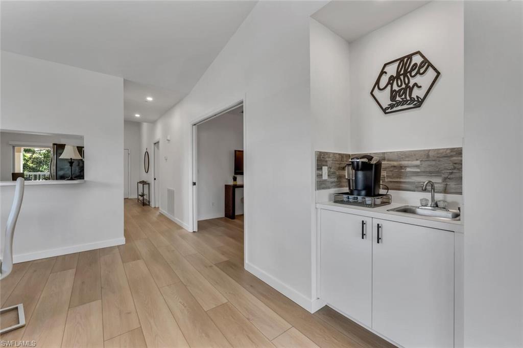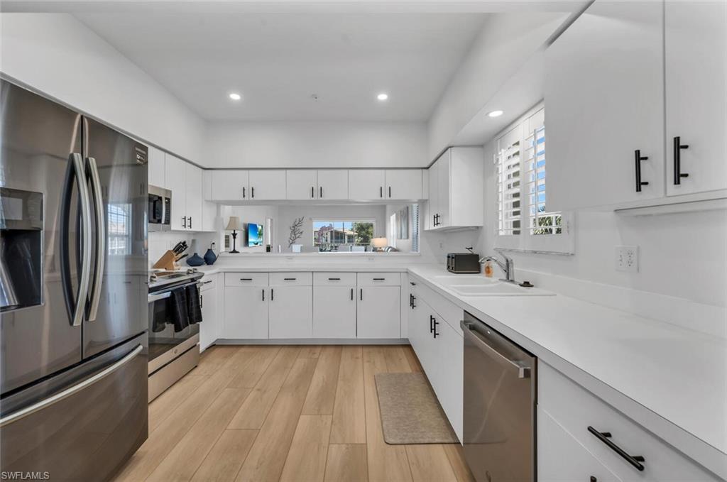 Set on the top floor of the third-floor building with peaceful pool and lake views, this impeccably updated and fully turnkey end-unit residence in The Vineyards offers 1,626 sq/ft of interior living space and more than 2,000 sq/ft including two generous lanais for effortless indoor-outdoor living. Featuring luxury vinyl wood plank flooring throughout, soaring ceilings in the primary bedroom, plantation shutters, Hunter Douglas slider blinds, and a freshly painted interior enhanced by upgraded baseboards, woodwork, and new recessed lighting, the home feels bright, refined, and move-in ready. The kitchen showcases brand-new appliances, while the reimagined coffee bar adds everyday convenience. Residents also enjoy access to optional private golf membership, including the recently renovated Vineyards North Course — a standout amenity within this premier Naples community. With elevator access, a spacious open layout, and a prime Central Naples location just minutes from beaches, dining, shopping, and daily conveniences, this residence delivers the ideal blend of comfort, style, and modern Florida living for today’s buyer.