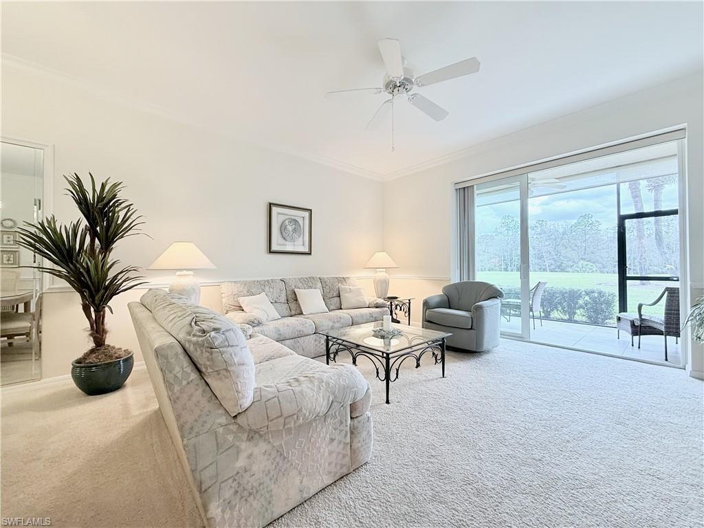 Hard-to-find FIRST-FLOOR 2BR + DEN / 2BA Veranda with garage in Naples Heritage—golf membership included. This residence offers the ease of ground-floor living with no stairs to climb and represents a rare opportunity to purchase a 2BR + Den at an outstanding price. You will appreciate the location of condo in the community - walking distance to clubhouse - close proximity to satellite pool and offers additional guest parking. Offered turnkey, the condo features new impact-resistant windows and sliders. Enjoy morning coffee on the front screened lanai with tile flooring and tranquil garden views, or unwind in the evenings on the rear screened lanai overlooking the golf course, also finished with tile—perfect for both quiet relaxation and entertaining guests. Inside, the home offers an inviting eat-in kitchen with a double pantry. The open-concept living and dining areas are designed for comfortable everyday living. The spacious primary suite has two walk-in closets and a private ensuite bath. A split guest bedroom ensures privacy for visitors, while the den provides flexible space ideal for a home office or occasional third bedroom. Separate in home laundry equipped with new washer and dryer. Homeowners enjoy the added convenience of a satellite pool just steps away. Located within the beautifully landscaped, gated community of Naples Heritage Golf & Country Club, residents enjoy a bundled 18-hole golf course, putting green, driving range, renovated clubhouse with pro shop, resort-style pool with cabana and bar, fitness center with on-site instructors, tennis, pickleball, bocce, scenic walking trails, and multiple dining options—all just minutes from I-75, downtown 5th Avenue, and Naples’ world-class beaches.