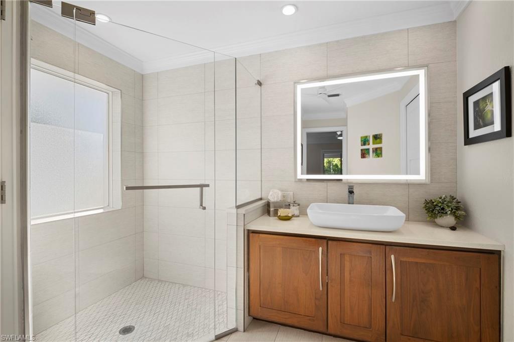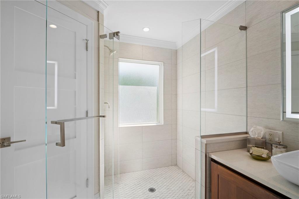 Completely remodeled and thoughtfully updated, this spacious three-bedroom plus den home offers a warm, open, and inviting floor plan designed for both everyday living and entertaining. The living and dining areas capture expansive views of the lush, tropical backyard, where mature trees create a magical, softly lit ambiance in the evenings. Seamless indoor-outdoor living awaits with a covered patio featuring custom pavers—perfect for relaxing or hosting guests. Outdoor gatherings are elevated by a custom fire pit and seating area, beautifully set beneath a majestic olive tree. Inside, the home features contemporary tile flooring throughout, upgraded interior wood doors, molding, and baseboards, along with completely renovated bathrooms. The updated kitchen boasts wood cabinetry, striking new backsplash and walk-in pantry. A large laundry room with ample storage and a sink leads to the spacious two-car garage complete with work bench and extra storage. Additional upgrades include an impact-rated picture window, upgraded window treatments, updated light fixtures inside and out, a new front door, garage door, and custom pavers enhancing the driveway, patios, and walkways. Nestled within the gated community of Boca Palms, this home offers a low HOA fee of just $1,900 per year and the added peace of mind of an X500 flood zone. Ideally located in prime North Naples—just five minutes to the beach and minutes to shopping and dining—and zoned for A-rated schools. Residents enjoy community gatherings and amenities including sidewatlks throught throught the neighborhood, tennis, pickleball, and a sparkling community pool. This exceptional home is truly a must-see.