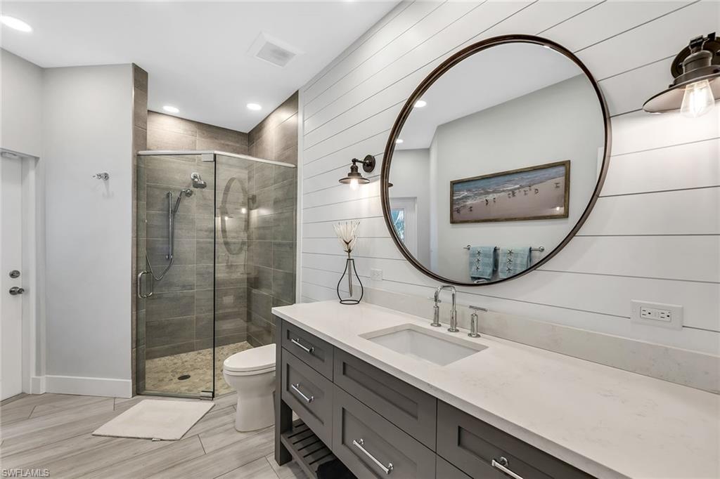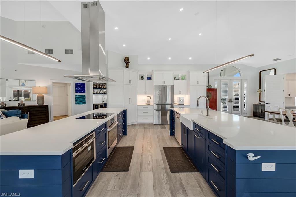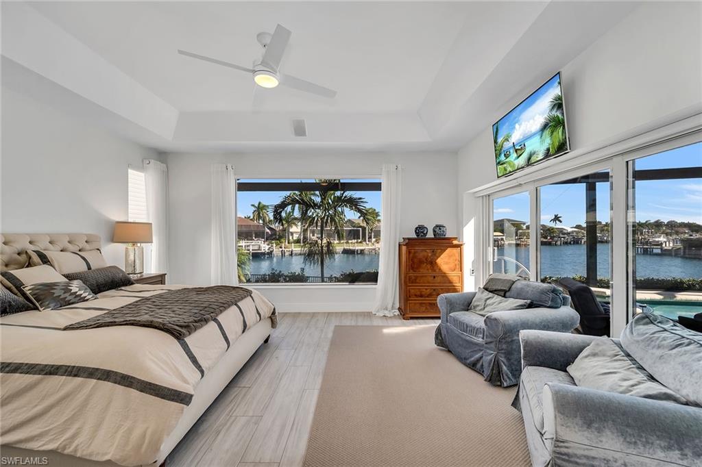 This furnished waterfront retreat is positioned on a fabulous large tip lot on a beautiful cul-de-sac, offering amazing sunrises and sunsets, exceptional privacy, and 163 feet of private seawall. With highly sought-after southern exposure, the pool and outdoor living areas enjoy sun throughout the day. Gulf access, a private dock with boat lift and jet ski lift, close proximity to Marco Island’s white-sand beaches, and excellent rental potential make this property as compelling as it is livable. Completely remodeled in 2022, the home blends modern coastal style with exceptional functionality. The thoughtfully designed floor plan offers four bedrooms, three baths, and a two-car garage, wrapped beneath a tile roof. A French glass door entry welcomes you into a light-filled interior enhanced by soaring ceilings, a bright white palette, recessed lighting, ceiling fans, and vinyl flooring that complements the relaxed coastal setting. Impact-resistant doors and windows, along with electric storm shutters, provide added peace of mind. The kitchen is a standout, capturing sweeping water views and effortless access to the screened lanai through a glass slider. Designed for both everyday living and entertaining, it features white shaker-style cabinetry with under-cabinet lighting, a pantry, newer stainless steel appliances installed between 2020 and 2022, and double islands, including a four-seater island that creates generous prep, storage, and gathering space. The open layout allows the kitchen to flow seamlessly into the main living areas while maintaining clear sightlines to the water. The adjacent living room continues the open, airy feel with panoramic water views, glass slider to the lanai, and a nearby wet bar. The primary suite is a private retreat with pool and wide water views, offering direct lanai access through a glass slider, a tray ceiling, and a walk-in closet. The ensuite bath is well-appointed with a double vanity, white shaker-style cabinetry, a walk-in shower with a frameless glass enclosure and floor-to-ceiling tile, a soaking tub, and a separate water closet. The first guest bedroom features a double-door entry and is privately positioned near a nearby guest bath with a frameless glass walk-in shower and floor-to-ceiling tile. Two more guest bedrooms both offer glass sliders to the screened lanai, allowing guests to enjoy effortless access to the outdoor living space. A nearby guest bath includes a walk-in shower with glass enclosure, floor-to-ceiling tile, and a glass door leading directly to the lanai, ideal for poolside convenience. A dedicated laundry room includes a newer LG washer and dryer (both 2022). Outdoor living takes center stage on the screened lanai, where a heated pool and spa overlook expansive water views, creating a private setting to relax after a day on the water. With Gulf access just moments away, this home offers a refined yet relaxed island lifestyle defined by boating, sunshine, and serene waterfront living.