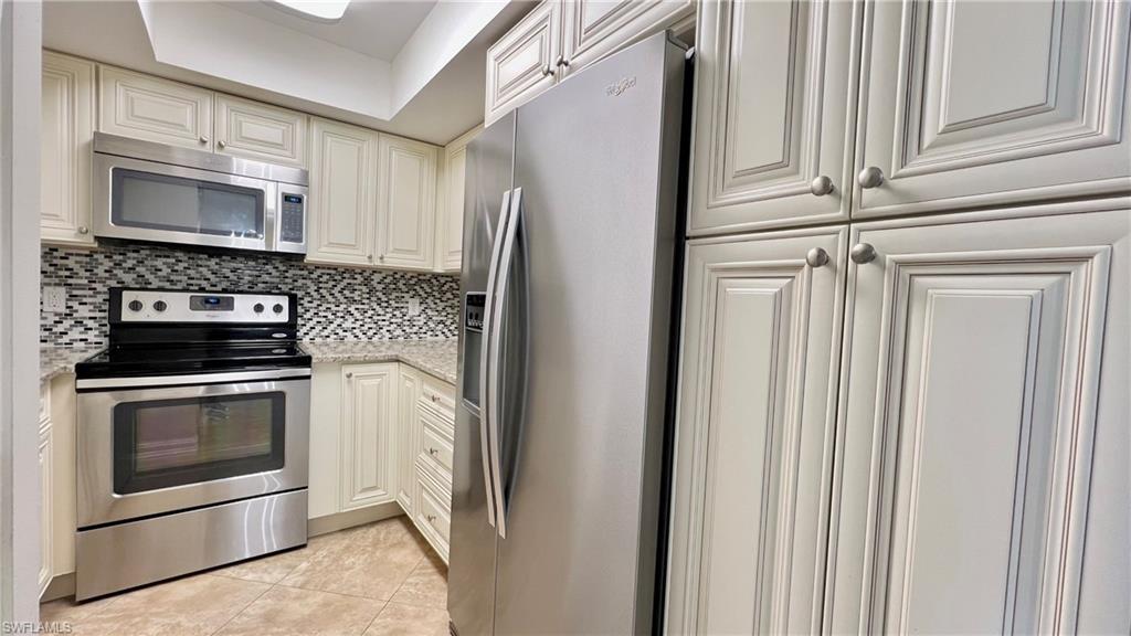 Centrally located condo offers comfort and style in every detail. The white kitchen features granite countertops and stainless steel appliances, complemented by tile flooring throughout the unit . The primary suite includes a walk-in closet and a master bathroom with double vanities. A large lanai, accessible through patio doors from every bedroom, offering natural light , the perfect space to enjoy sunsets and golf course views . Newer AC System 2021 , Water tank 2022,, Refrigerator 2023 .Condo fee also covers -water/sewer , trash and Hotwire Cable & Internet .The building is equipped with elevators, exterior was recently painted , carport parking , car washing station , community pool and located in the desirable X flood zone. The quiet, well-maintained community offers unbeatable convenience—just minutes to Clam Pass Beach, upscale shopping and dining at Waterside Shops, and everyday favorites like Starbucks and Costco. Optional membership is available at nearby Quail Run Golf Club, making this home ideal for both golfers and beach lovers.