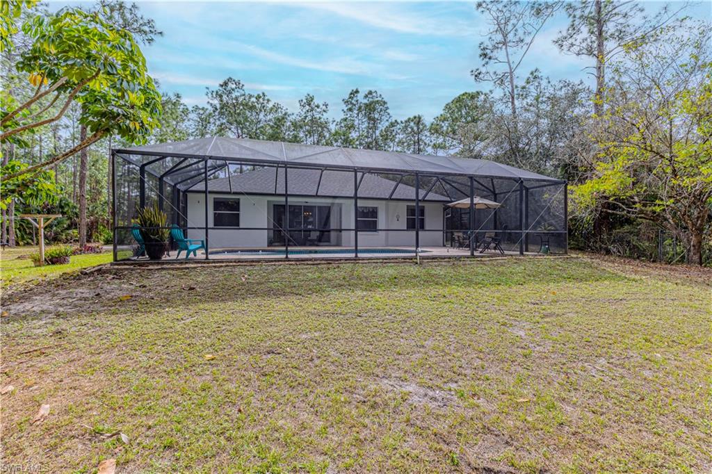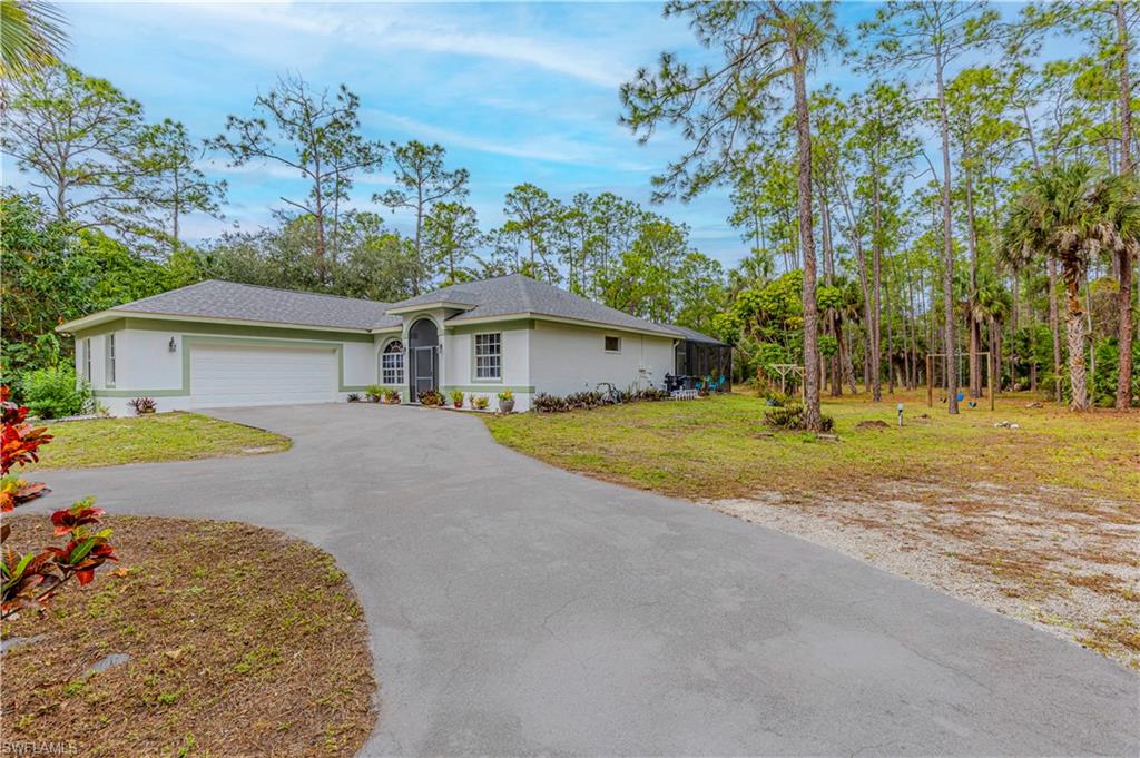 Quality-built Gulfstream home set on 2.73 private acres, surrounded by lush tropical landscaping and true Old Florida charm. This peaceful retreat is framed by mature bougainvillea, fruit trees, pine, and majestic Eureka palms, offering unmatched privacy and a serene setting. Inside, you’ll find a spacious, open layout with no carpet throughout. The chef’s kitchen features honey-colored granite countertops, solid oak cabinetry, ample prep space, and room to gather. The owner’s suite is a true retreat, complete with tray ceiling, walk-in closets, and an adjoining spa-style bath offering dual sinks, a jetted tub, and a large step-down stone shower. Step outside and enjoy the ultimate Florida lifestyle. The property features a concrete pool with stamped concrete sunning deck and LED lighting, screened-in lanai, irrigation system, and a concrete fire pit perfect for evenings under the stars. There is a fenced pet run, ATV trails, and plenty of open space for all your toys. The oversized covered garage includes additional outlets, and the property is equipped with an RV hookup with water and power. Yes, there is even a private gun range tucked away in the backyard for those who appreciate space and privacy. Additional highlights include a newer washer and dryer, newer water system, and a thoughtful setback that delivers peace, quiet, and tranquility without feeling remote. Move-in ready and incredibly private, yet conveniently located just a short drive to Naples’ world-famous sugar-sand beaches, dining, shopping, and entertainment. This is a rare opportunity to own acreage, privacy, and modern comfort all in one.