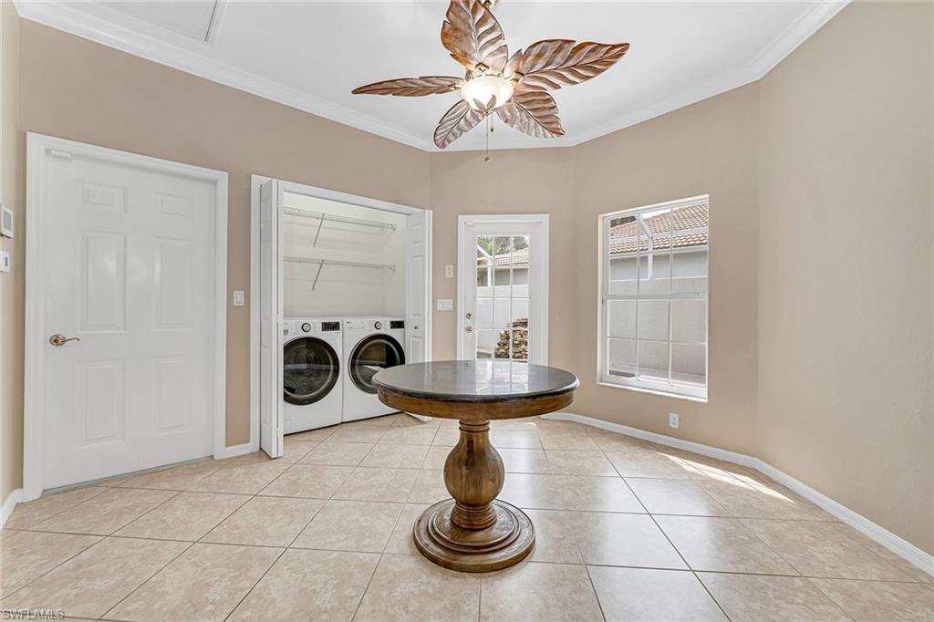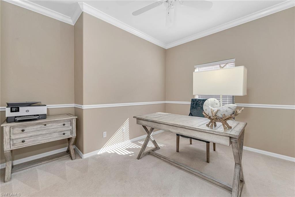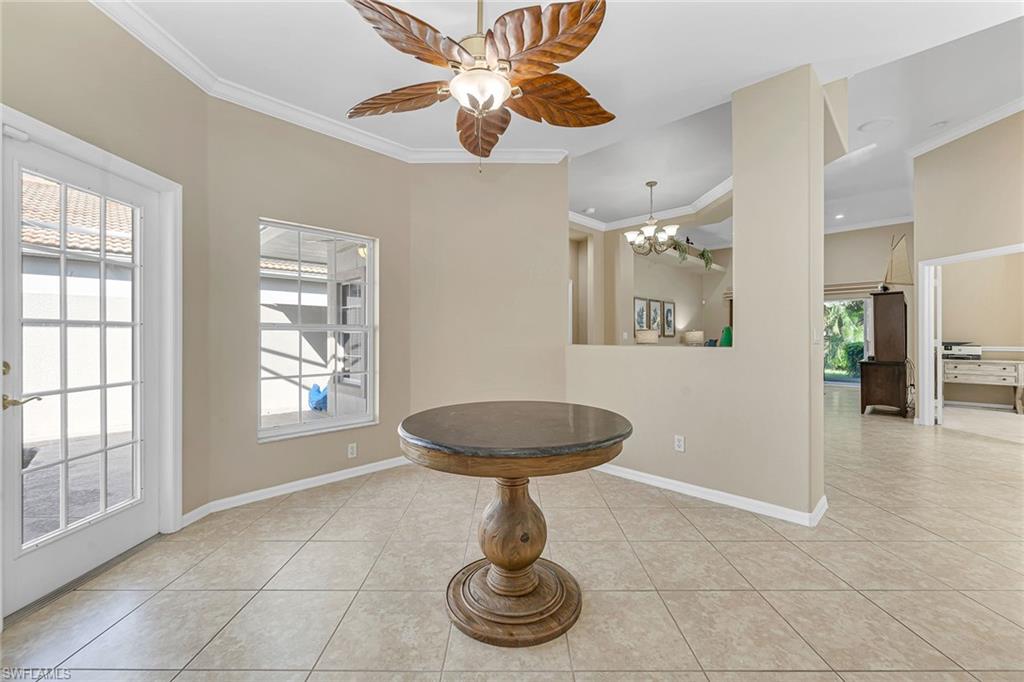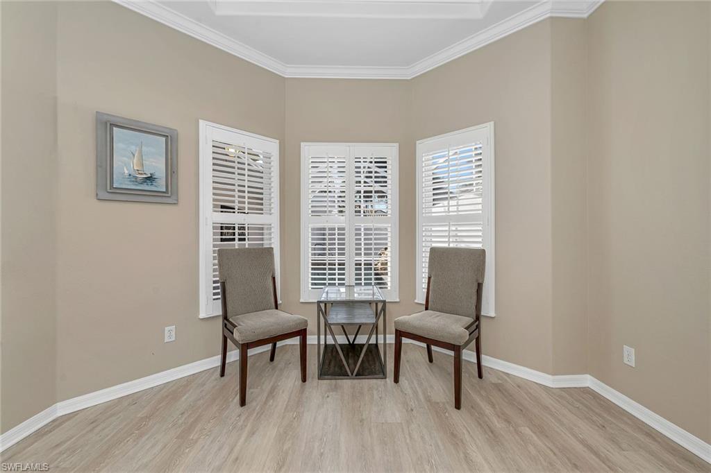 A beautifully appointed home in the amenity-rich community of Glen Eagle Golf and Country Club, including a social membership. This two-bedroom with den, two-bath residence offers 1,744 square feet of elegant living space and comes turnkey furnished, ideal for those seeking a move-in-ready retreat. Upon arrival, you’re greeted by a double door entrance that opens to a private, screened-in courtyard featuring a heated saltwater pool, ideal for relaxing and entertaining. The interior is highlighted by volume ceilings, crown molding, recessed lighting and diagonally laid tile floors throughout the main living areas, creating a bright and spacious atmosphere. The kitchen is a chef's delight, featuring white cabinetry, granite countertops, a window backsplash, LG stainless appliances, a pantry and a three-seater breakfast bar. It flows seamlessly into the open dining and living areas, ideal for gathering and entertaining. The adjacent den, enclosed by French doors, offers versatility as an office or extra living space and is finished with carpet flooring. The owner’s suite is a tranquil retreat with French doors, tray ceilings, plantation shutters, wood flooring and a walk-in closet for ample storage. The en-suite bath boasts a dual sink vanity with a built-in makeup counter and full-width mirror, a linen closet, a deep soaker tub and a separate walk-in shower. The guest bedroom features cozy carpet flooring and has access to a nearby full bath with a shower/tub combo. Additional features of this home include a lanai that has been converted into a Florida room, providing extra living space, a 2018 tile roof, a 20-kilowatt whole-home generator for peace of mind and a security system for added safety. As a resident of Glen Eagle Golf and Country Club, you’ll enjoy an array of amenities, including a Gordon Lewis-designed golf course, four lighted Har-Tru tennis courts, two bocce courts, fitness center with daily classes, heated community pool, and a clubhouse complex that includes a pro shop, dining rooms, bar and lounge, meeting room, card room and a billiards room. Experience the best of Naples living and schedule your private showing today!