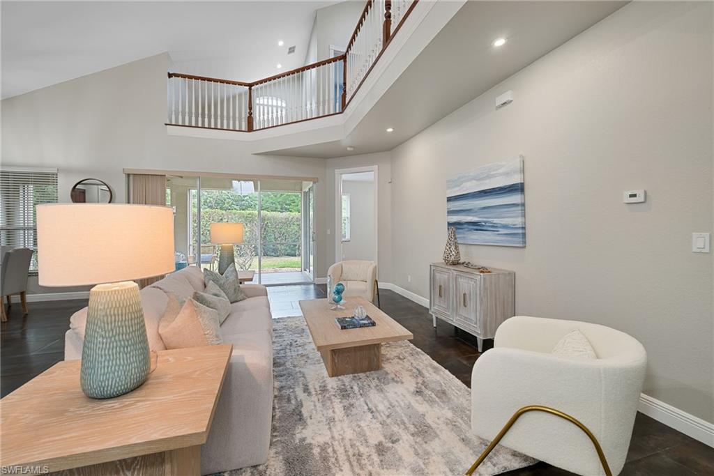 This well-maintained Bonita Springs home offers three bedrooms, two and a half bathrooms, and over 2,100 square feet of living space with soaring ceilings and abundant natural light. The open floor plan flows effortlessly from the kitchen into the dining and living areas, creating a bright and inviting space for everyday living and entertaining. The kitchen features ample cabinetry and a breakfast bar, while the spacious primary suite includes a walk-in closet and a private en-suite bath. Tile flooring runs throughout the main living areas. Enjoy the Florida lifestyle from the screened lanai overlooking a peaceful landscaped backyard with lemon and lime trees, offering plenty of room for outdoor gatherings. Additional highlights include a two-car air-conditioned garage, accordion hurricane shutters, a recently replaced metal barrel roof with a transferable warranty, and a 10,000-watt generator. Recent updates include a new hot water heater, washer and dryer, appliances, custom closets, and updated plumbing in the primary bath. Hidden Lakes is a small, friendly community of only 78 single-family homes with very low HOA fees. Residents enjoy a community pool, hot tub, clubhouse, and a walking and biking trail that leads directly to Vanderbilt Beach and Bonita Beach.