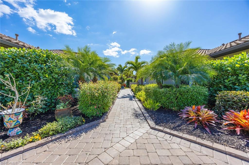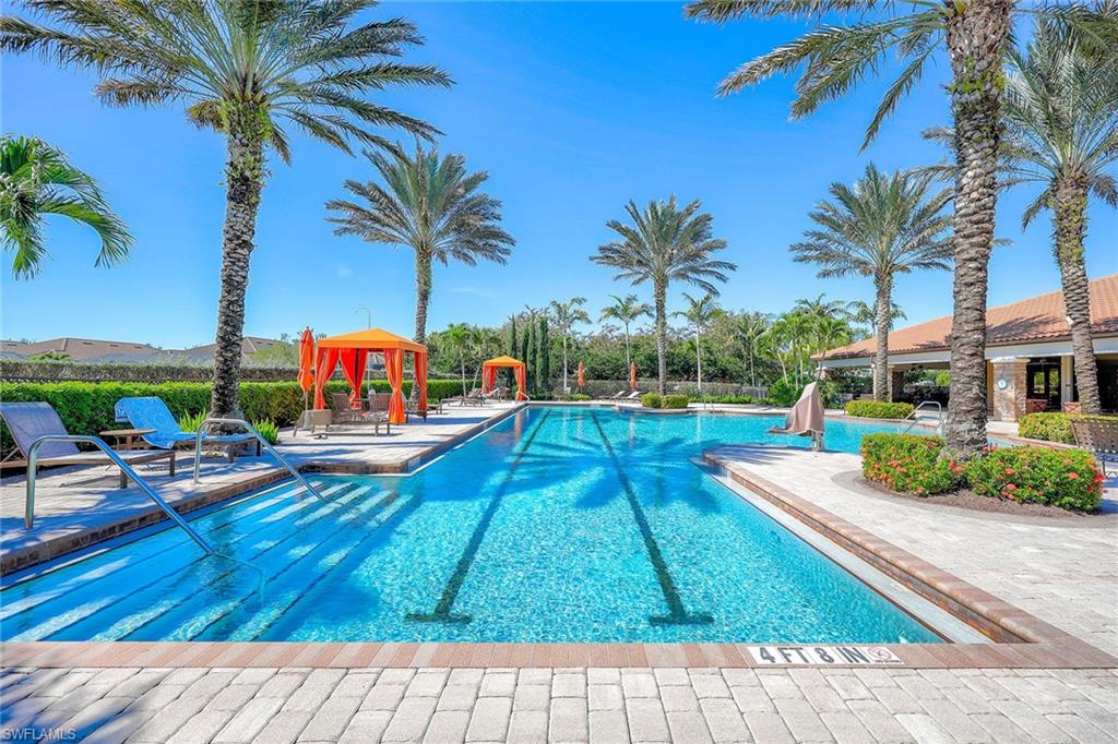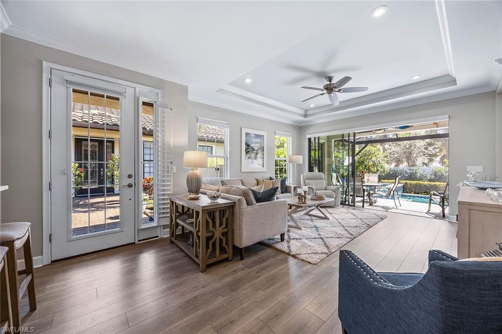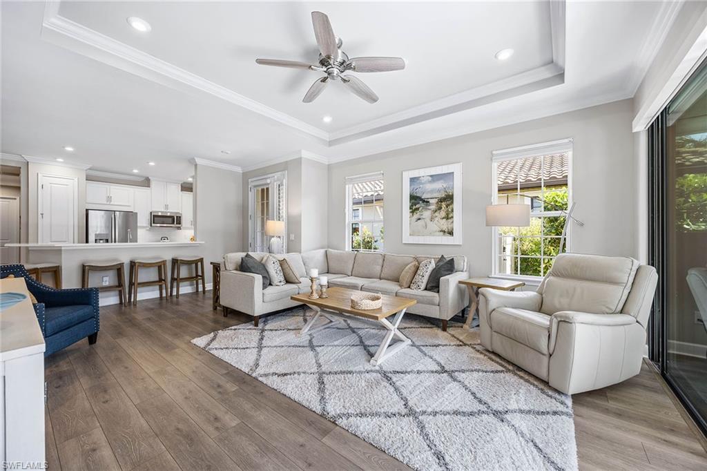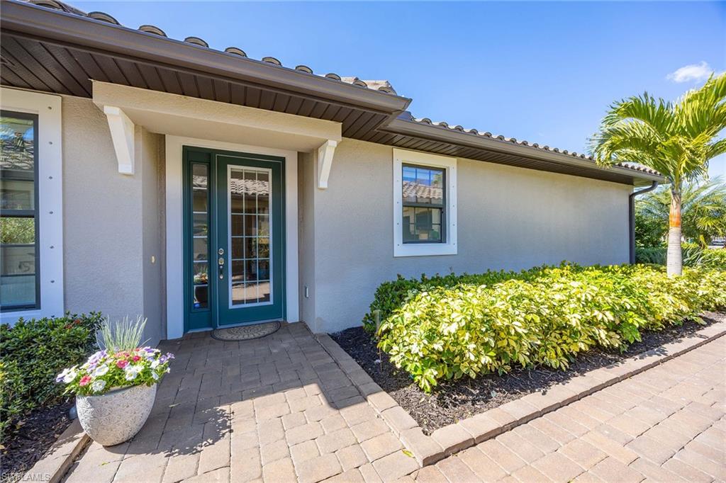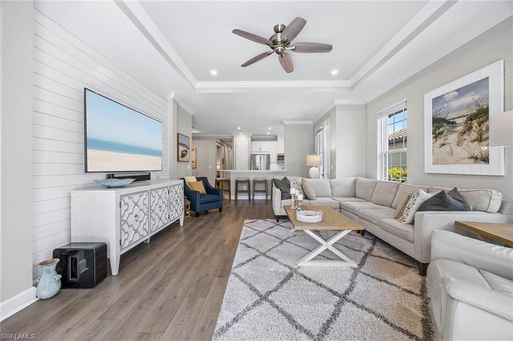 At the end of a cul-de-sac with southern exposure and landscaped views, this 2021-built, villa delivers privacy, thoughtful upgrades and resort-style living within Esplanade at Hacienda Lakes. This single-story residence features two bedrooms plus a den, two baths and a two-car garage with epoxy floor. Designed for seamless indoor-outdoor living, the residence showcases a newly added saltwater, gas-heated pool and spa complemented by a sun-filled deck, creating a private outdoor retreat overlooking private views. Inside, the open-concept floor plan is elevated by crown molding throughout, including tray ceilings, all hard-surface flooring and a custom shiplap feature wall in the living room. The interior has been freshly custom-painted and enhanced with designer lighting and ceiling fans. Additionally, bottom-up, top-down custom blinds have been installed throughout the home. The kitchen features quartz countertops, a new designer backsplash, modern hardware, natural gas cooking, newer appliances, a spacious pantry and a breakfast bar ideal for entertaining. The primary suite includes a walk-in closet and a bath with dual sinks and a walk-in shower. The guest bath offers a walk-in shower with a frameless glass shower enclosure. A dedicated laundry room includes a utility sink with front-loading washer and dryer. Residents of Esplanade at Hacienda Lakes enjoy access to a 6,500-square-foot clubhouse with a 24-hour fitness center, resistance pool, lap pool, spa, yoga studio, pickleball, Har-Tru tennis courts, bocce courts, playground, dog park and social spaces. The community hosts organized events and programming throughout the year. Ideally between Naples and Marco Island, the residence is convenient to shopping, dining, medical facilities, Fifth Avenue South and Gulf beaches. This property offers a well-appointed, low-maintenance lifestyle within one of Naples established natural gas communities.