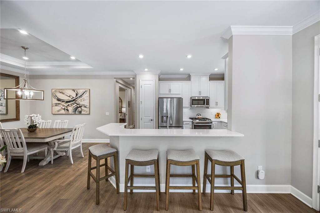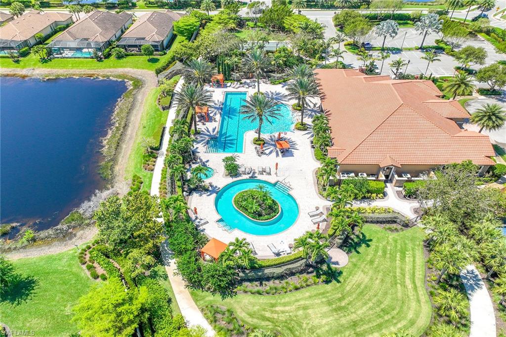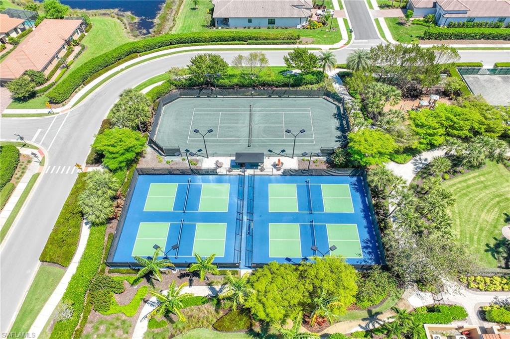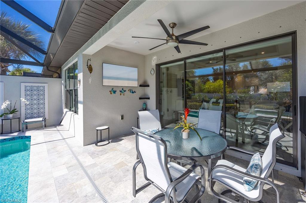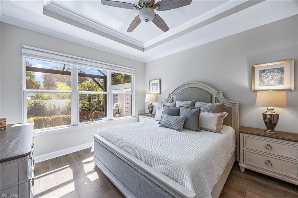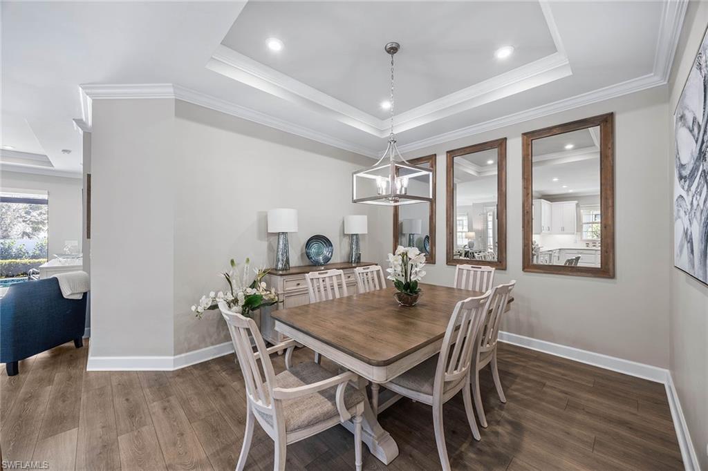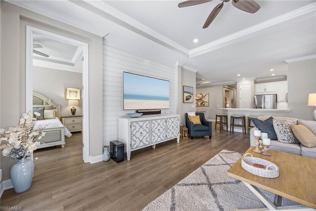 At the end of a cul-de-sac with southern exposure and landscaped views, this 2021-built, villa delivers privacy, thoughtful upgrades and resort-style living within Esplanade at Hacienda Lakes. This single-story residence features two bedrooms plus a den, two baths and a two-car garage with epoxy floor. Designed for seamless indoor-outdoor living, the residence showcases a newly added saltwater, gas-heated pool and spa complemented by a sun-filled deck, creating a private outdoor retreat overlooking private views. Inside, the open-concept floor plan is elevated by crown molding throughout, including tray ceilings, all hard-surface flooring and a custom shiplap feature wall in the living room. The interior has been freshly custom-painted and enhanced with designer lighting and ceiling fans. Additionally, bottom-up, top-down custom blinds have been installed throughout the home. The kitchen features quartz countertops, a new designer backsplash, modern hardware, natural gas cooking, newer appliances, a spacious pantry and a breakfast bar ideal for entertaining. The primary suite includes a walk-in closet and a bath with dual sinks and a walk-in shower. The guest bath offers a walk-in shower with a frameless glass shower enclosure. A dedicated laundry room includes a utility sink with front-loading washer and dryer. Residents of Esplanade at Hacienda Lakes enjoy access to a 6,500-square-foot clubhouse with a 24-hour fitness center, resistance pool, lap pool, spa, yoga studio, pickleball, Har-Tru tennis courts, bocce courts, playground, dog park and social spaces. The community hosts organized events and programming throughout the year. Ideally between Naples and Marco Island, the residence is convenient to shopping, dining, medical facilities, Fifth Avenue South and Gulf beaches. This property offers a well-appointed, low-maintenance lifestyle within one of Naples established natural gas communities.