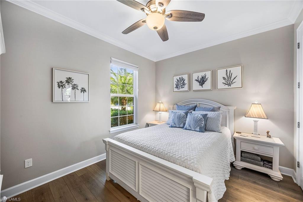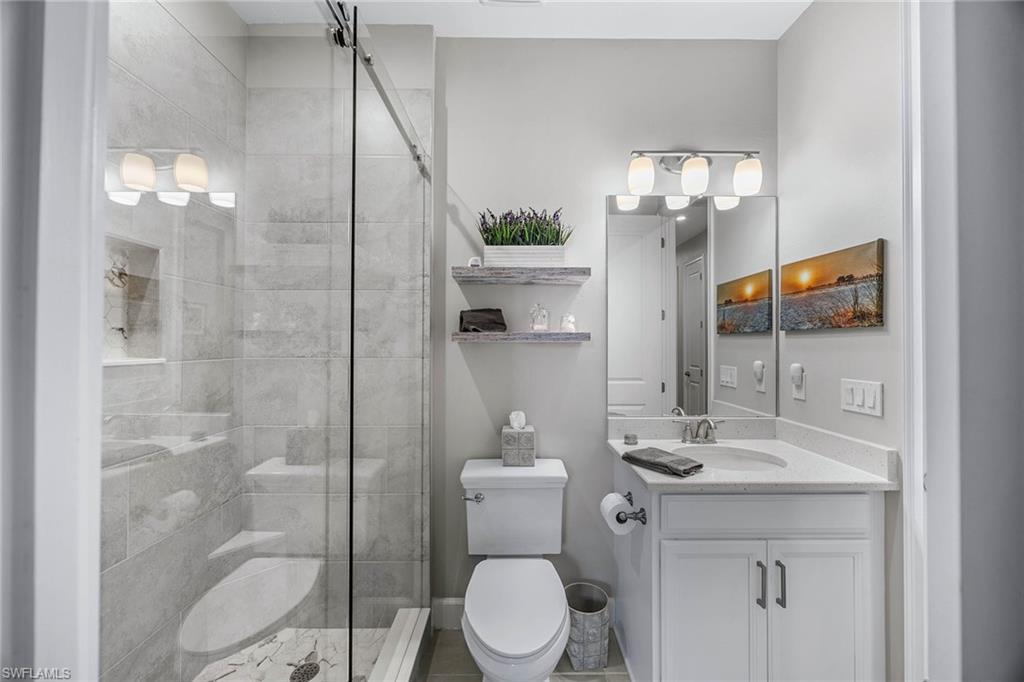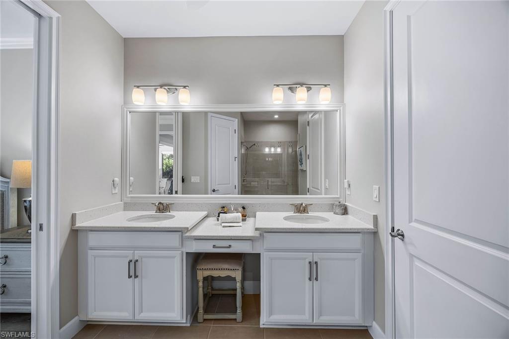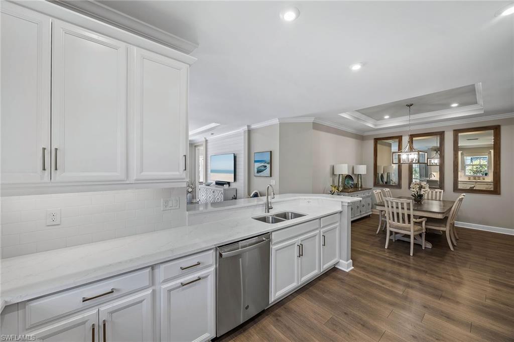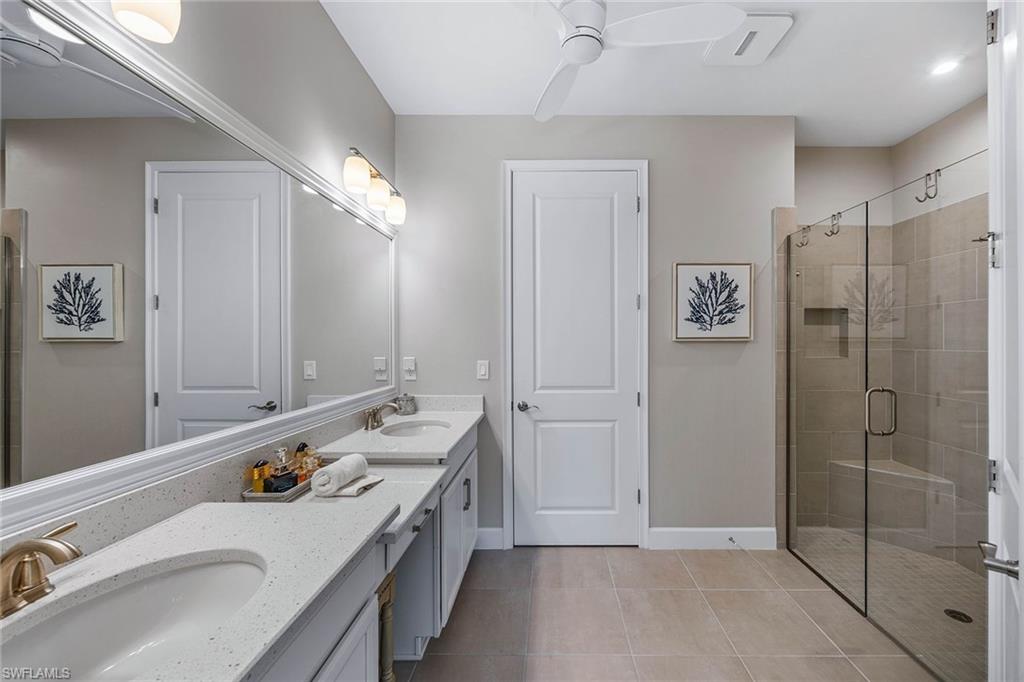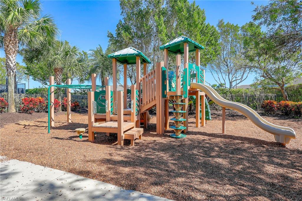 At the end of a cul-de-sac with southern exposure and landscaped views, this 2021-built, villa delivers privacy, thoughtful upgrades and resort-style living within Esplanade at Hacienda Lakes. This single-story residence features two bedrooms plus a den, two baths and a two-car garage with epoxy floor. Designed for seamless indoor-outdoor living, the residence showcases a newly added saltwater, gas-heated pool and spa complemented by a sun-filled deck, creating a private outdoor retreat overlooking private views. Inside, the open-concept floor plan is elevated by crown molding throughout, including tray ceilings, all hard-surface flooring and a custom shiplap feature wall in the living room. The interior has been freshly custom-painted and enhanced with designer lighting and ceiling fans. Additionally, bottom-up, top-down custom blinds have been installed throughout the home. The kitchen features quartz countertops, a new designer backsplash, modern hardware, natural gas cooking, newer appliances, a spacious pantry and a breakfast bar ideal for entertaining. The primary suite includes a walk-in closet and a bath with dual sinks and a walk-in shower. The guest bath offers a walk-in shower with a frameless glass shower enclosure. A dedicated laundry room includes a utility sink with front-loading washer and dryer. Residents of Esplanade at Hacienda Lakes enjoy access to a 6,500-square-foot clubhouse with a 24-hour fitness center, resistance pool, lap pool, spa, yoga studio, pickleball, Har-Tru tennis courts, bocce courts, playground, dog park and social spaces. The community hosts organized events and programming throughout the year. Ideally between Naples and Marco Island, the residence is convenient to shopping, dining, medical facilities, Fifth Avenue South and Gulf beaches. This property offers a well-appointed, low-maintenance lifestyle within one of Naples established natural gas communities.