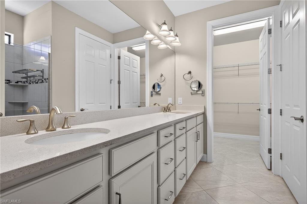 Located within the highly sought-after Del Webb Naples in the heart of Ave Maria, this heavily optioned Abbeyville model delivers an exceptional blend of comfort, quality, and active-adult lifestyle, set on a premium homesite with serene lake views to the front and picturesque mid-fairway views of Panther Run Golf Club’s 10th hole to the rear. The thoughtfully designed floor plan offers approximately 1,805 square feet of living space with two bedrooms, a den with glass French doors, two full baths, a Florida room, and extended screened lanais at both the front and rear, creating seamless indoor-outdoor living ideal for enjoying Southwest Florida’s year-round sunshine. The extended two-car garage offers ample space for your vehicles, golf cart, or storage. Inside, the home showcases impact-resistant windows and doors, plantation shutters throughout, tile laid on the diagonal, upgraded cabinetry with quartz countertops, stainless steel appliances, enhanced trim and door heights, and a spacious finished laundry room, all contributing to a bright, open, and inviting feel. The screened lanai provides a private retreat overlooking the golf course and currently accommodates an above-ground hot tub, perfect for relaxation and entertaining. A newer HVAC system installed in 2023 adds peace of mind and efficiency. Del Webb Naples is renowned for its vibrant 55+ lifestyle, offering resort-style amenities, multiple clubhouses, fitness and wellness facilities, social clubs, and optional golf membership, all within Ave Maria’s unique golf-cart-friendly town setting that emphasizes connection, walkability, and an active, engaging way of life.
