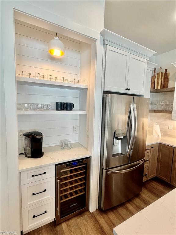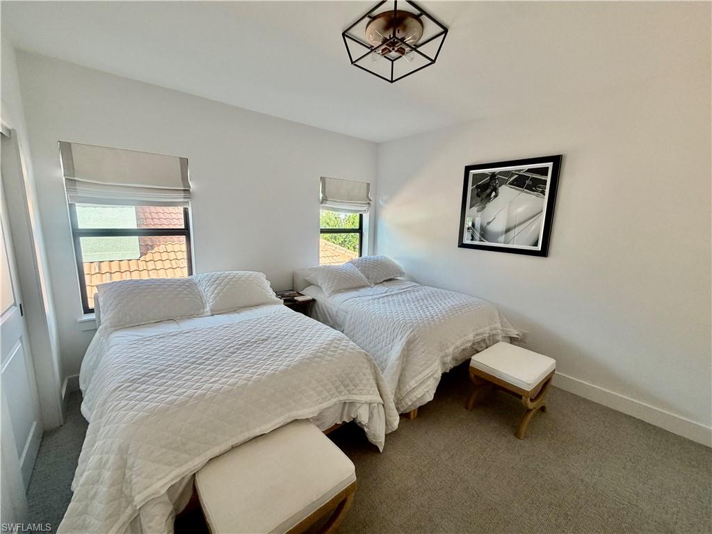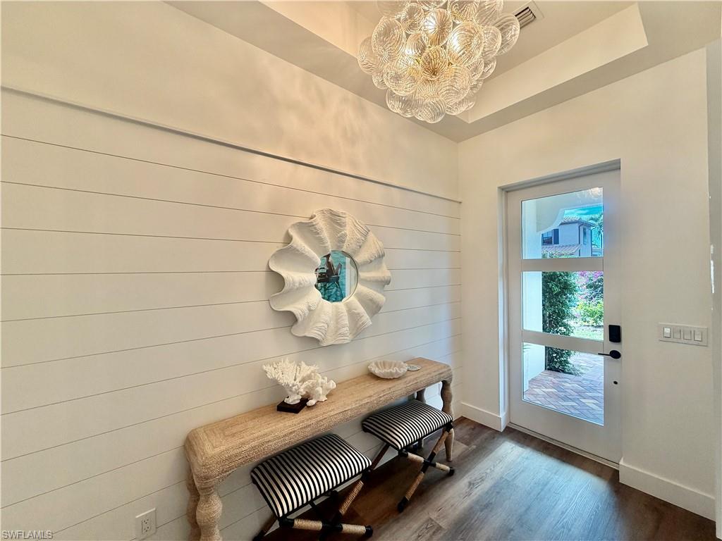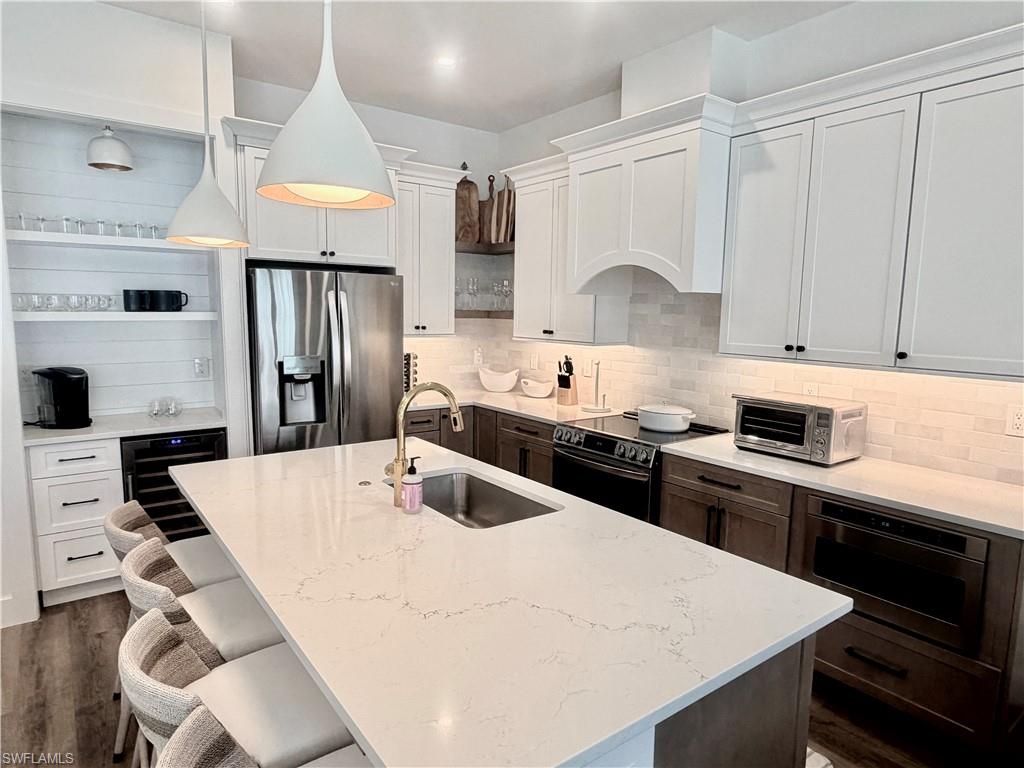 Located in the exclusive Cordoba neighborhood of Lely Resort, home to just 50 residences, this beautifully upgraded 4-bedroom, 3-bath home with a 2-car garage offers the perfect blend of Coastal modern design and resort-style living. Shiplap walls in soft white, set the tone upon entering the foyer presents a clean, airy, timeless look. The open-concept kitchen features white quartz countertops, tiled backsplash, LG stainless steel appliances, a 30-bottle wine cooler, coffee bar station and a custom pantry with wood shelving. The entire first floor is finished with durable vinyl flooring, while the 2 upstairs bedrooms are carpeted for added comfort. The thoughtfully designed layout includes two bedrooms downstairs and two upstairs, providing ideal separation for guests or family. Master bathroom has modern white quartz counters and white and grey shower and floor tile as well as double sinks. Outdoor living truly shines with upgraded landscaping, solar lighting an extended paver side walkway, and a private lanai designed for year-round enjoyment. The space features covered and uncovered seating areas, Shellstone pavers, a tanning deck, private pool, and outdoor BBQ, backsplash, and sink—perfect for entertaining or relaxing in the Florida sun. Additional features include a laundry room with stackable washer and dryer, added storage cabinetry, shiplap walls and a water filtration system. Residents enjoy immediate access to the award-winning Players Club, offering resort-style pools, dining, fitness center, tennis, golf practice facilities, and both fine and casual dining options. Whether you’re seeking a primary residence, seasonal retreat, or income-producing rental, this home checks every box in one of Naples’ most desirable gated resort communities. ****WECOME TO PARADISE ****