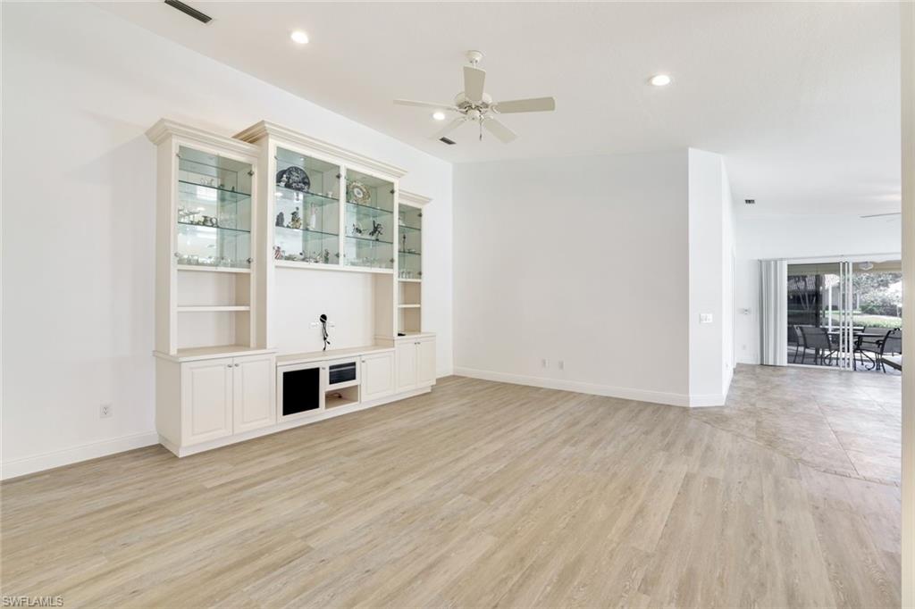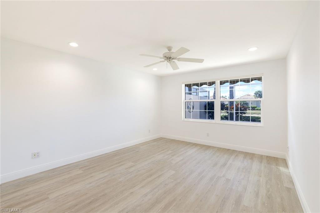 Beautifully refreshed Capri Villa nestled in a quiet area of the community. Western exposure on the canal for spectacular nightly sunsets. February 2026 completed gorgeous new floors, updated kitchen cabinets, 2 large bedrooms w/updated closets and lighting, walk-in closets. Freshly painted throughout. Updated laundry cabinets, counters and sink. Dimmable lighting throughout. This model includes an open den, 2 bathrooms and a 2-car garage. Impact windows throughout. A glassed-in lanai with heating and cooling. Motorized awnings covering entire lanai area. The home is wired for and has a special outdoor outlet for a generator enabling use of lighting and multiple large appliance usage. (Generator is also for sale.) Village Walk is just 5 miles from Vanderbilt Beach and 4 miles to the shopping and dining gem - Mercato! HOA fees cover landscaping, cable and internet service, and full use of amenities - including tennis, pickleball, bocce ball, gym with lap pool, 2 heated resort pools, on-site restaurant, miles of paved and lighted walkways around lakes, and over canals with charming Venetian style bridges.