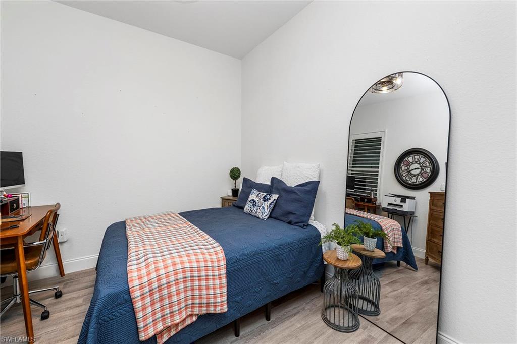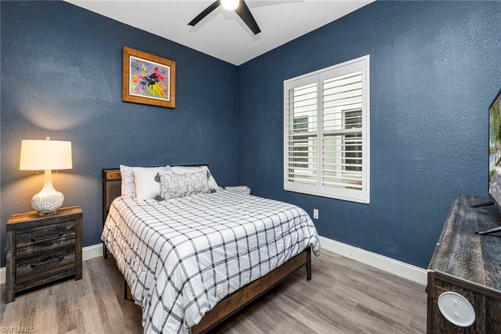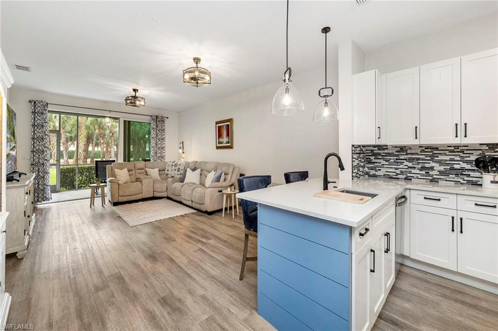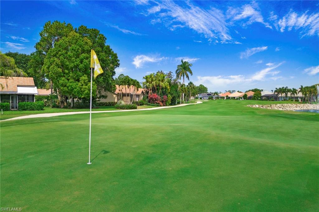 Newly renovated three-bedroom, two-bath coach home in Lynx Pass at Hunters Ridge Golf and Country Club, offering a move-in-ready opportunity within a full-service private club community. The residence was comprehensively remodeled in 2022 and features a bright, open layout designed for everyday living and entertaining. The eat-in kitchen is finished with quartz countertops, soft-close white shaker cabinetry, stainless steel KitchenAid appliances and updated lighting. Luxury vinyl wood plank flooring extends throughout the home, complemented by impact-resistant windows and sliding glass doors. The primary suite includes a spa-inspired bath with quartz countertops, dual sinks, matte gold hardware and a glass-enclosed shower. Two generously sized guest bedrooms provide ample closet space, while the guest bath features a walk-in glass shower with porcelain tile. Additional improvements include an oversized elevated washer and dryer, a new air-conditioning system and a new water heater. The attached one-car garage offers built-in storage and a pebbled epoxy floor. A screened lanai overlooks the fifteenth fairway, providing golf course views and a tranquil outdoor setting. Hunters Ridge Golf and Country Club offers an eighteen-hole, par seventy-two Gordon Lewis-designed golf course, two lighted Har-Tru tennis courts, eight lighted pickleball courts and four lighted bocce courts. Members enjoy three golf simulator studios, a ten-thousand-square-foot activity center with a modern fitness facility, and a resort-style pool and spa with sun deck and poolside snack bar. Dining options include a casual grill room, an outdoor club patio bar and a redesigned formal dining room. A full calendar of social events includes live entertainment, themed dinners and seasonal gatherings. This home includes a social equity membership, providing access to the club’s dining, fitness and social amenities within one of Bonita Springs’ established golf and country club communities. Seller is open to considering an annual or off-season lease or lease back for up to two years after closing.